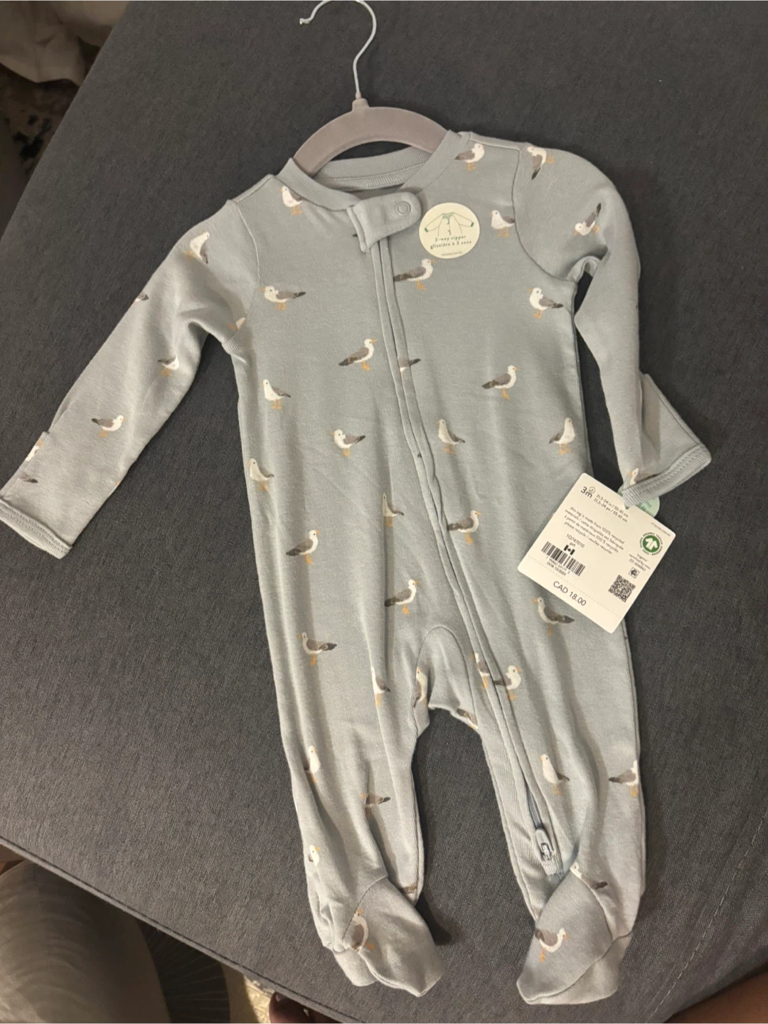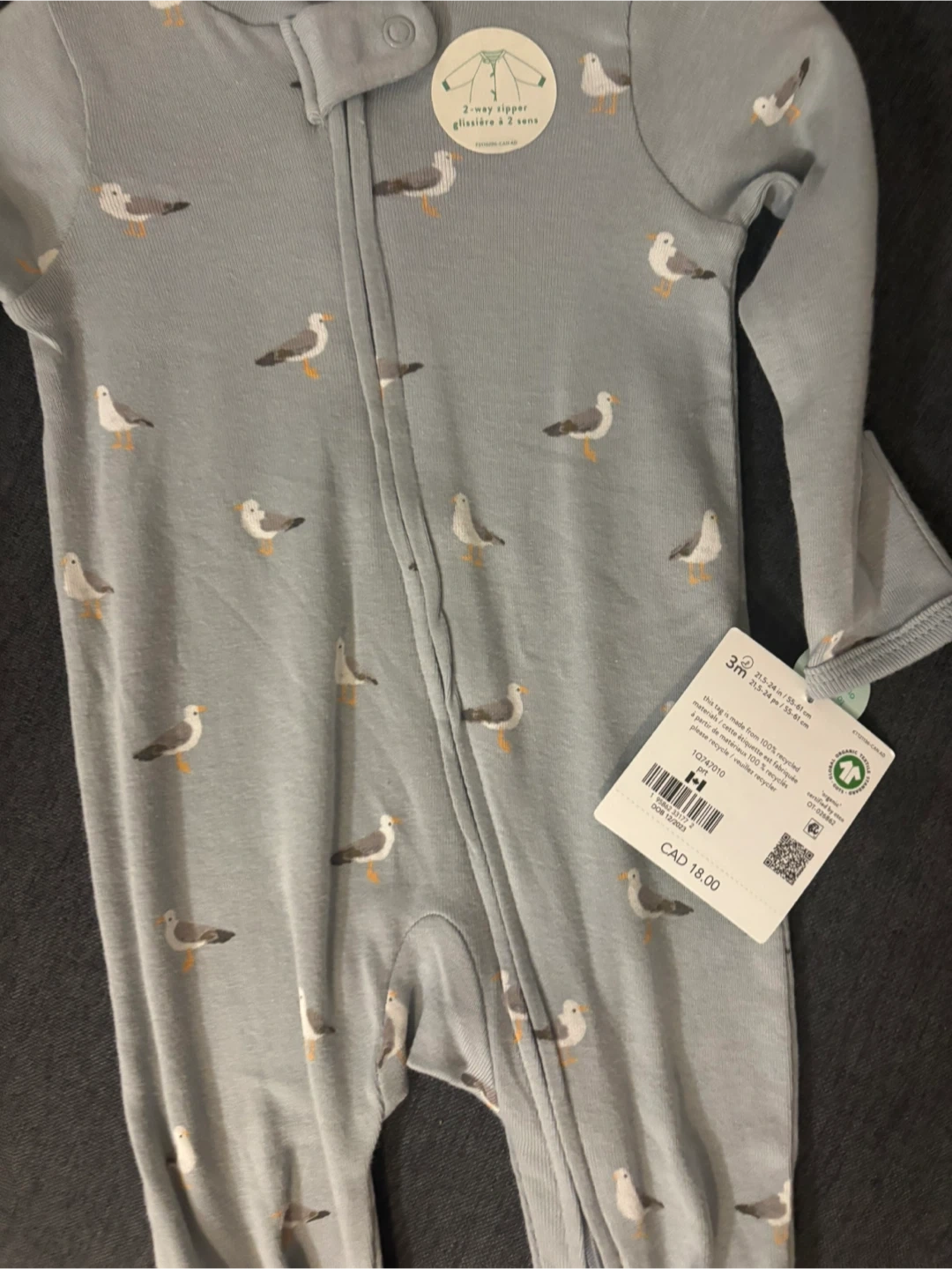 This adorable baby sleeper is brand new with tags! It features a cute seagull print and a convenient 2-way zipper. Size is 3 months. Originally bought for $18 CAD