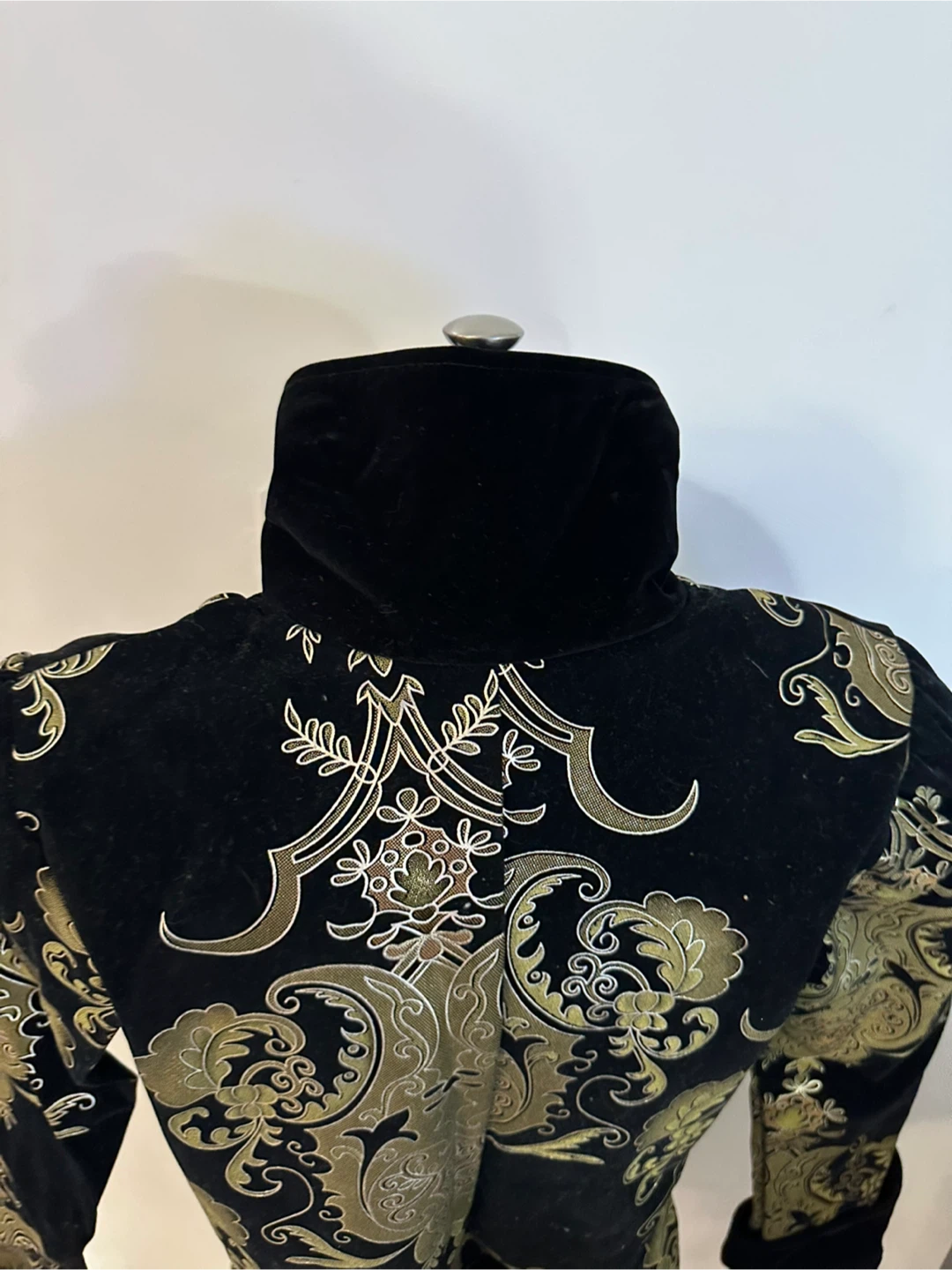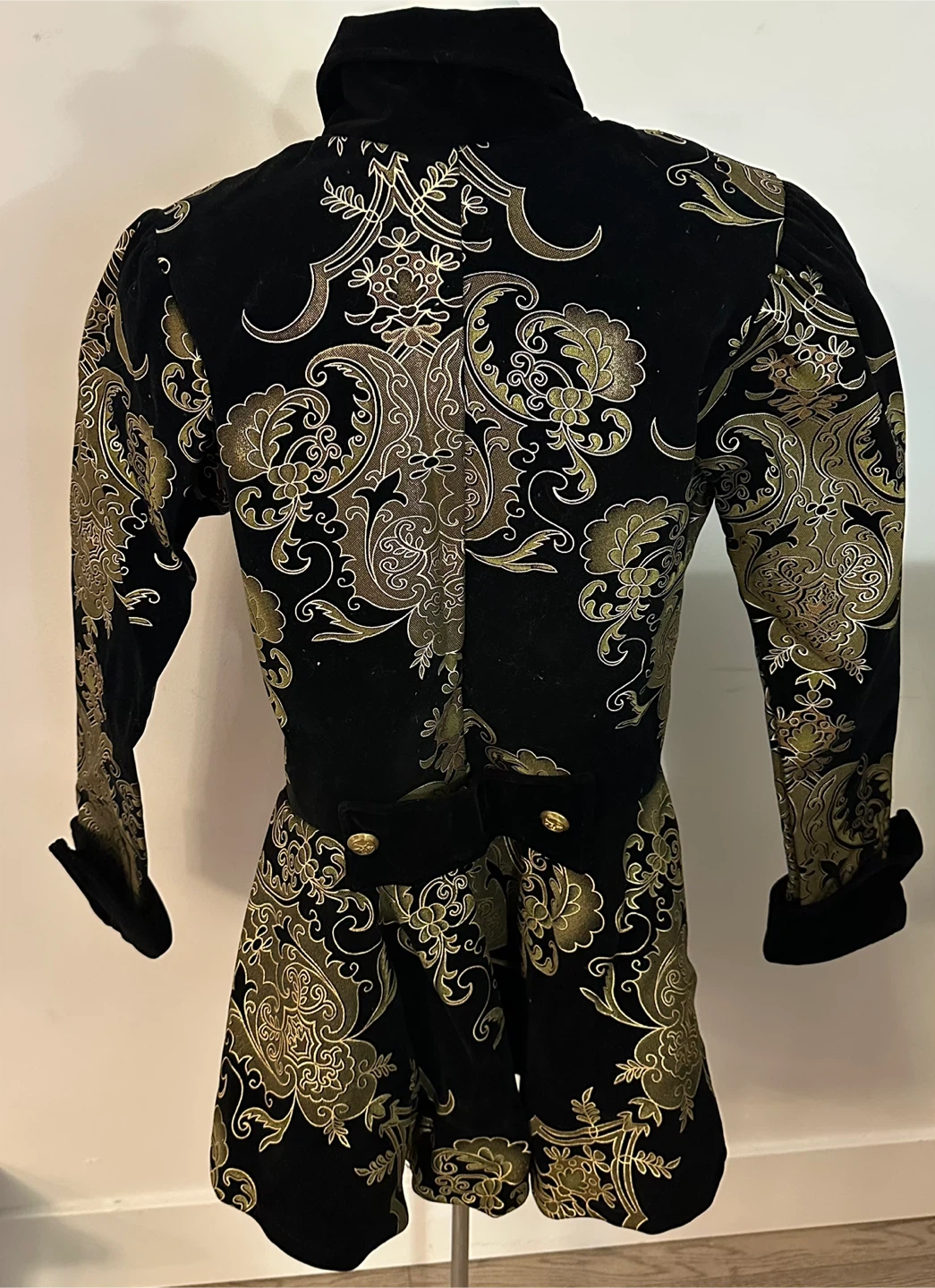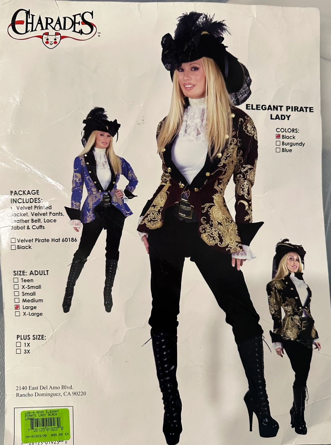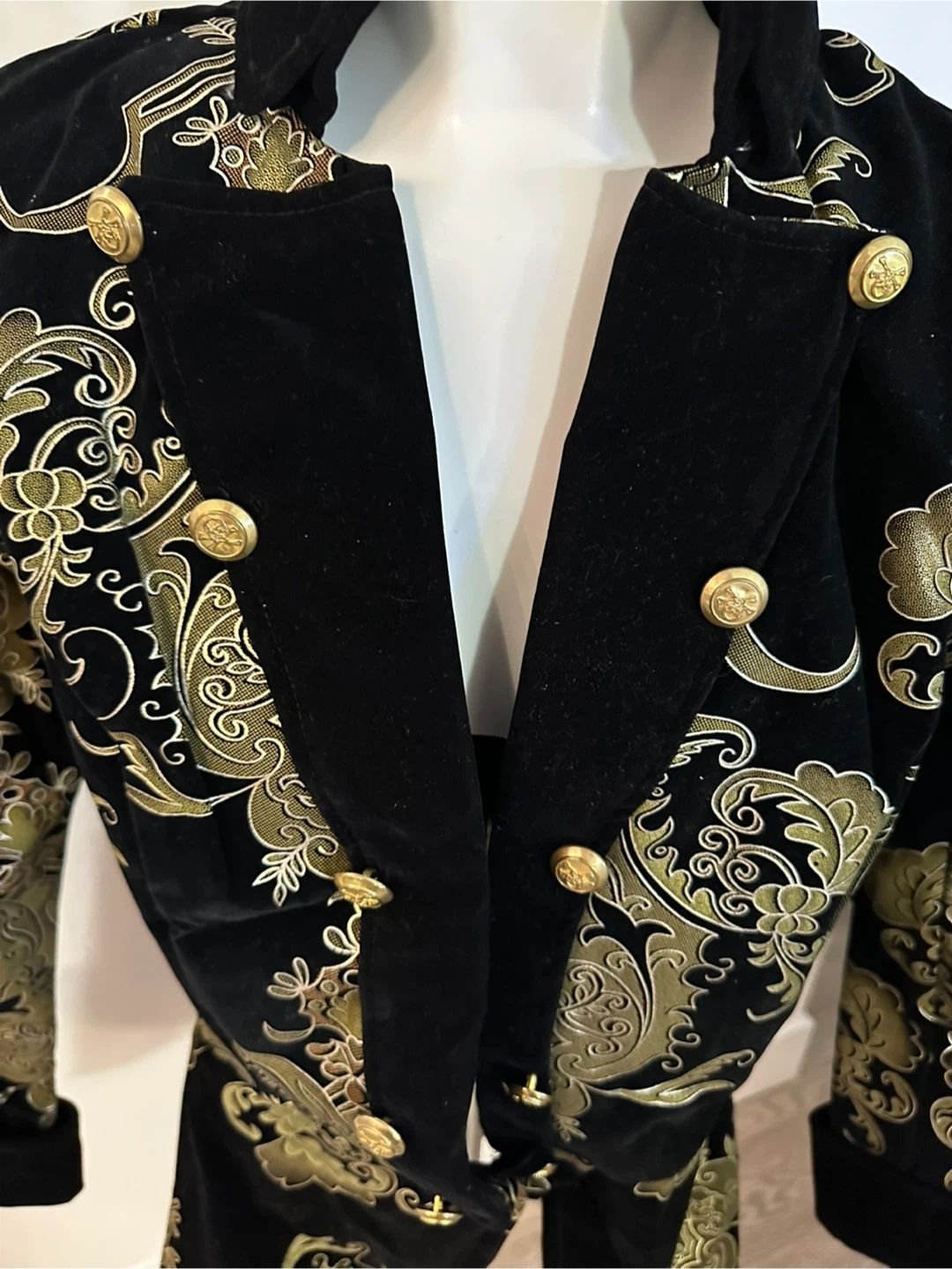 Selling a Charades Elegant Pirate Lady costume blazer in size Large. It includes a velvet printed jacket. The costume is black with gold detailing.