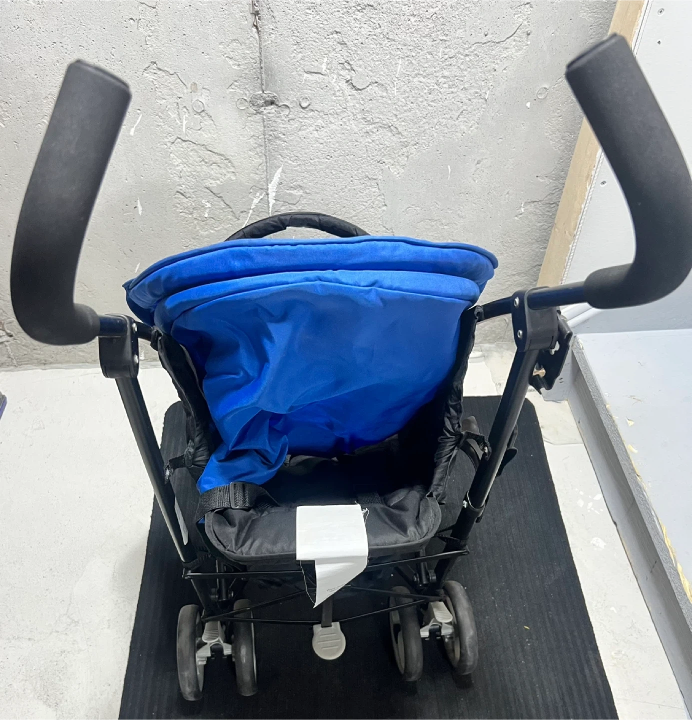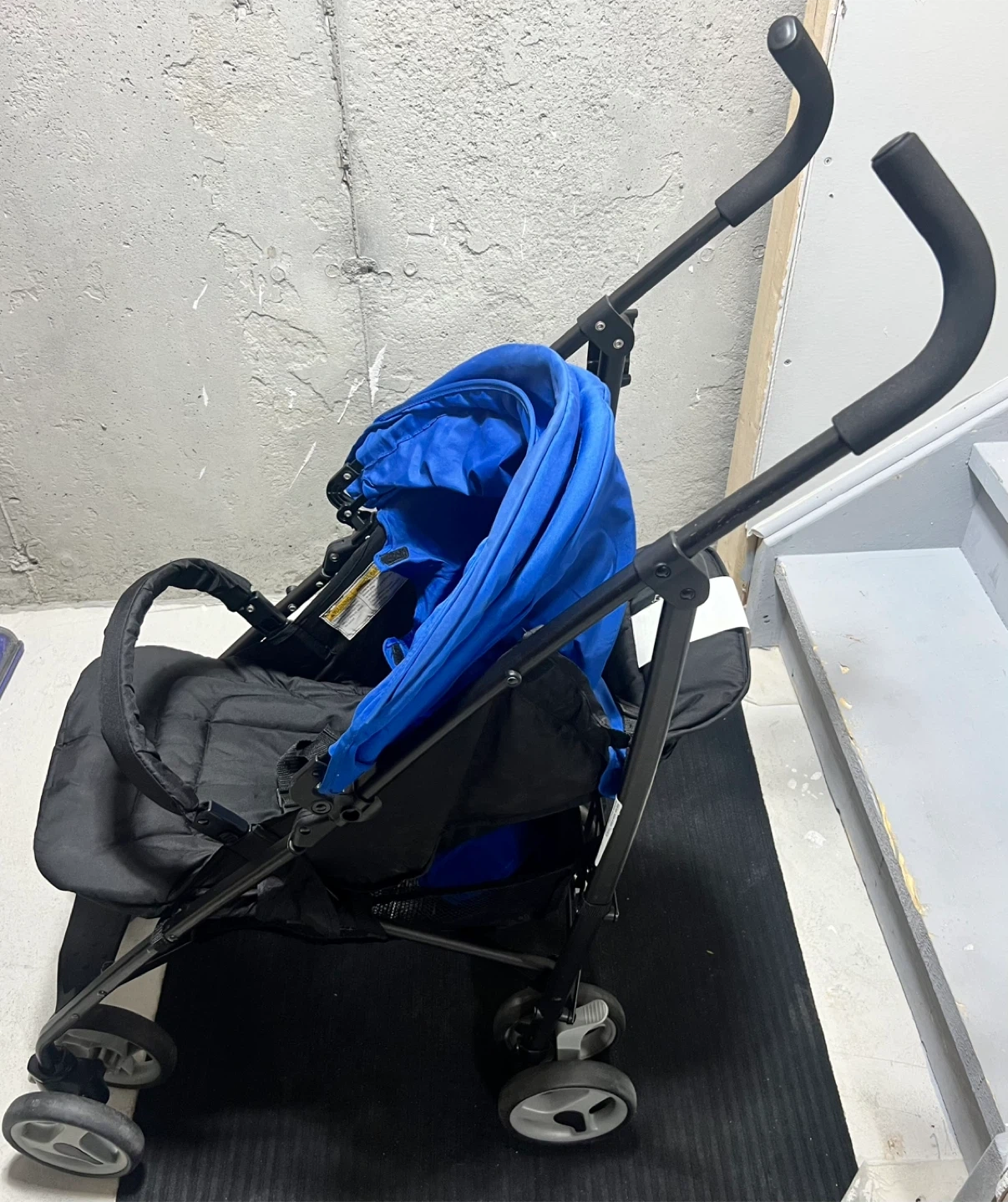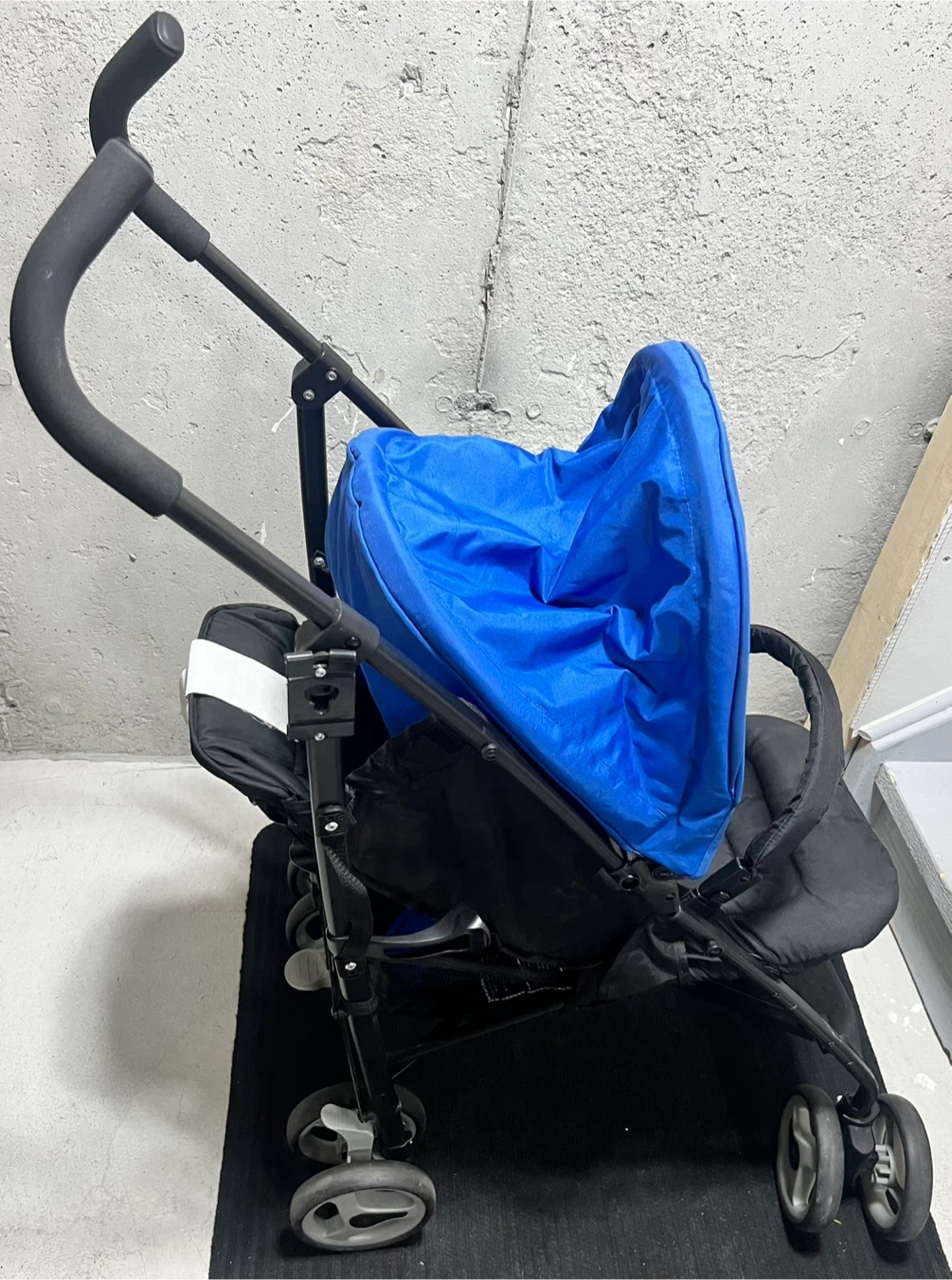 This is a blue and black stroller that is in used condition, but ready for a new child. This lightweight stroller is perfect for travel, and folds up for easy storage. Here are some additional details: * Compact fold * Storage basket * Lightweight design If the ad is up, it's available!