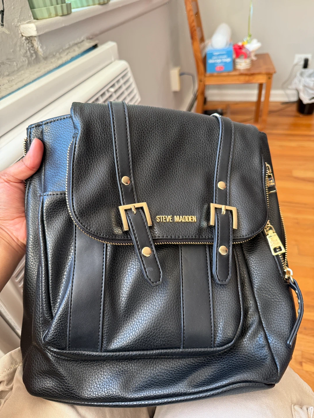 I'm selling a Steve Madden black backpack. It's in great condition and has gold hardware.