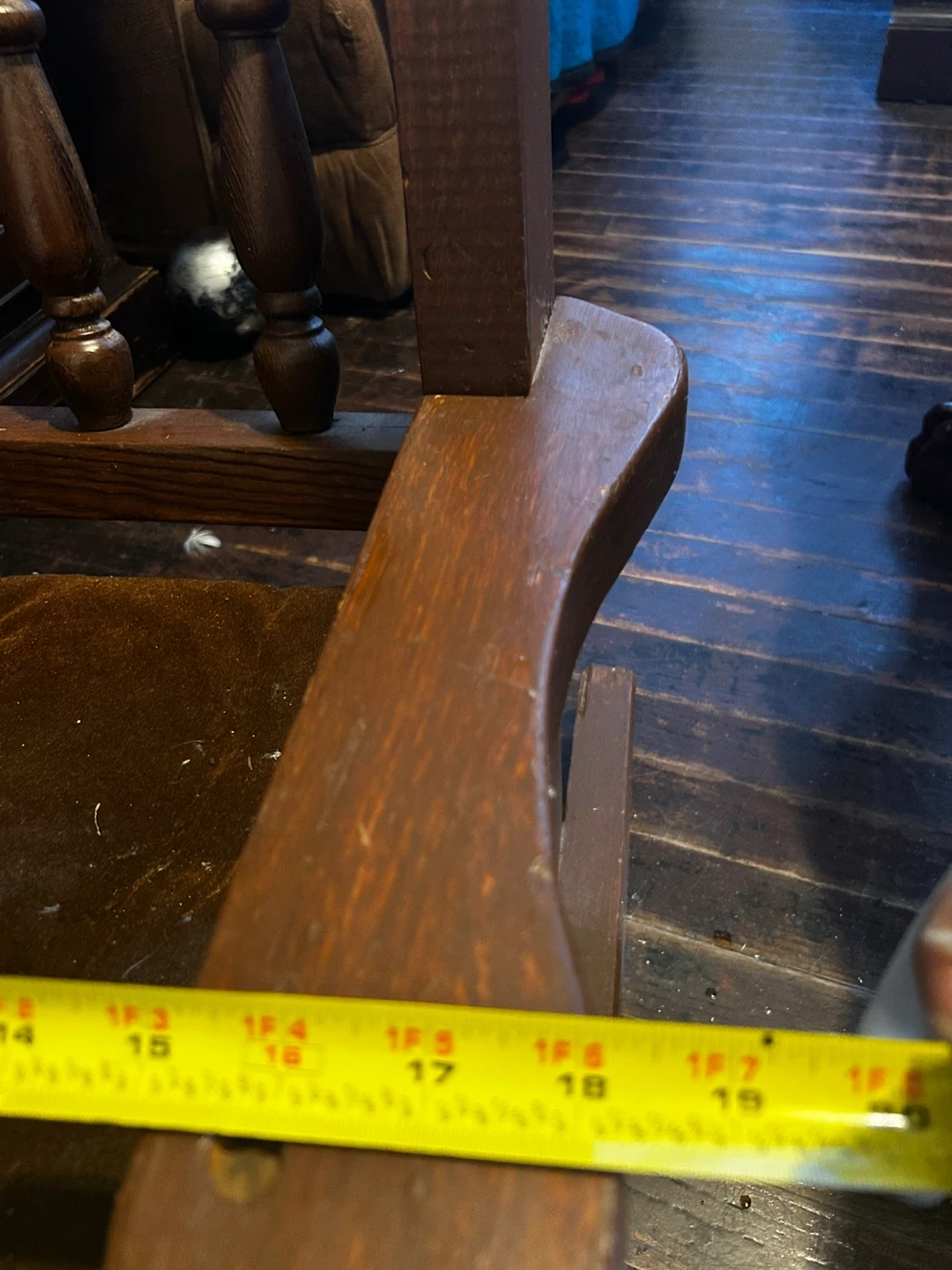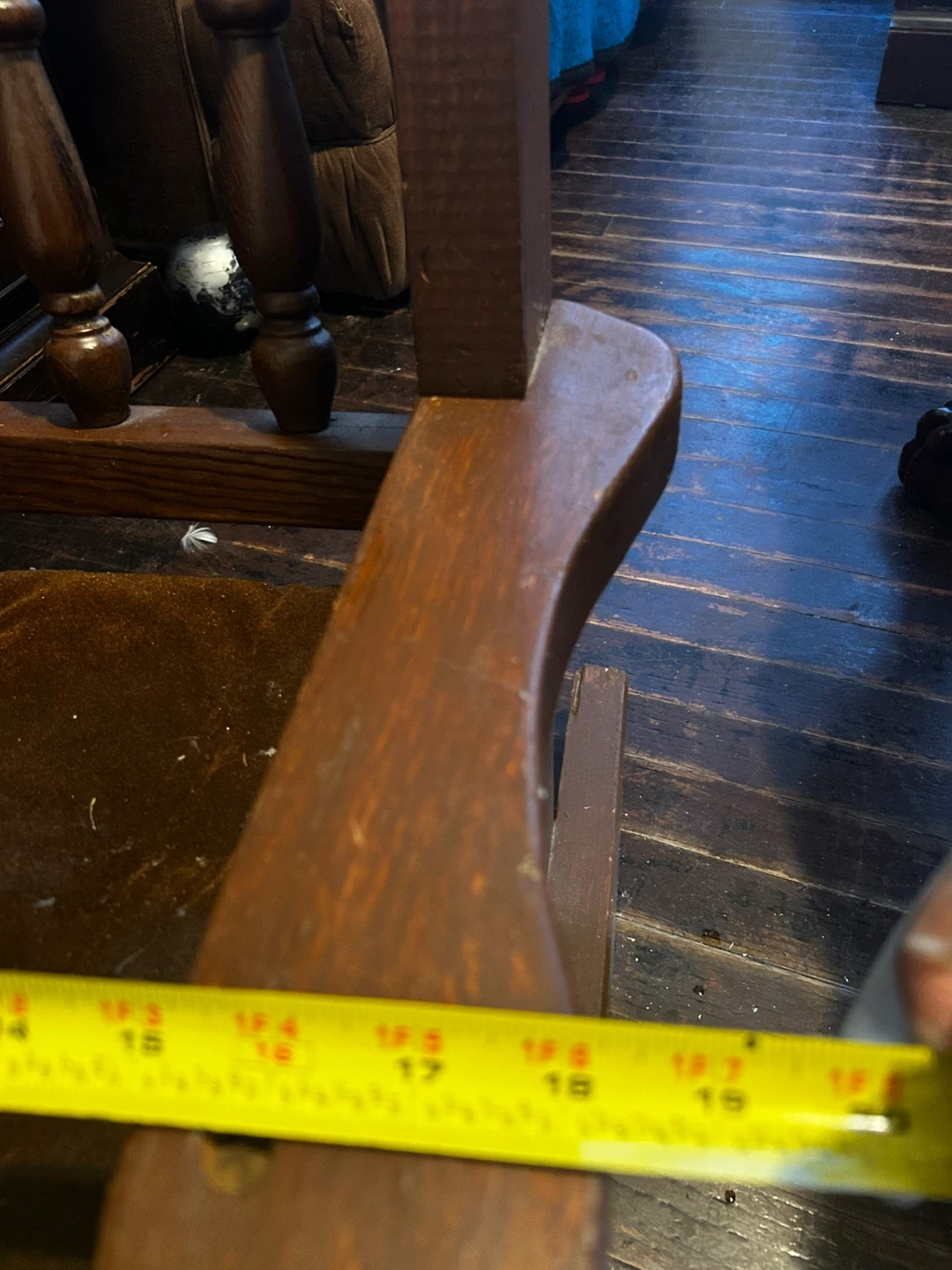 Selling a vintage-style brown rocking chair. It has a brown cushion and a wooden frame. The chair measures approximately 18 inches wide. It's a charming piece for any room! Solid wood; heavy great DYI