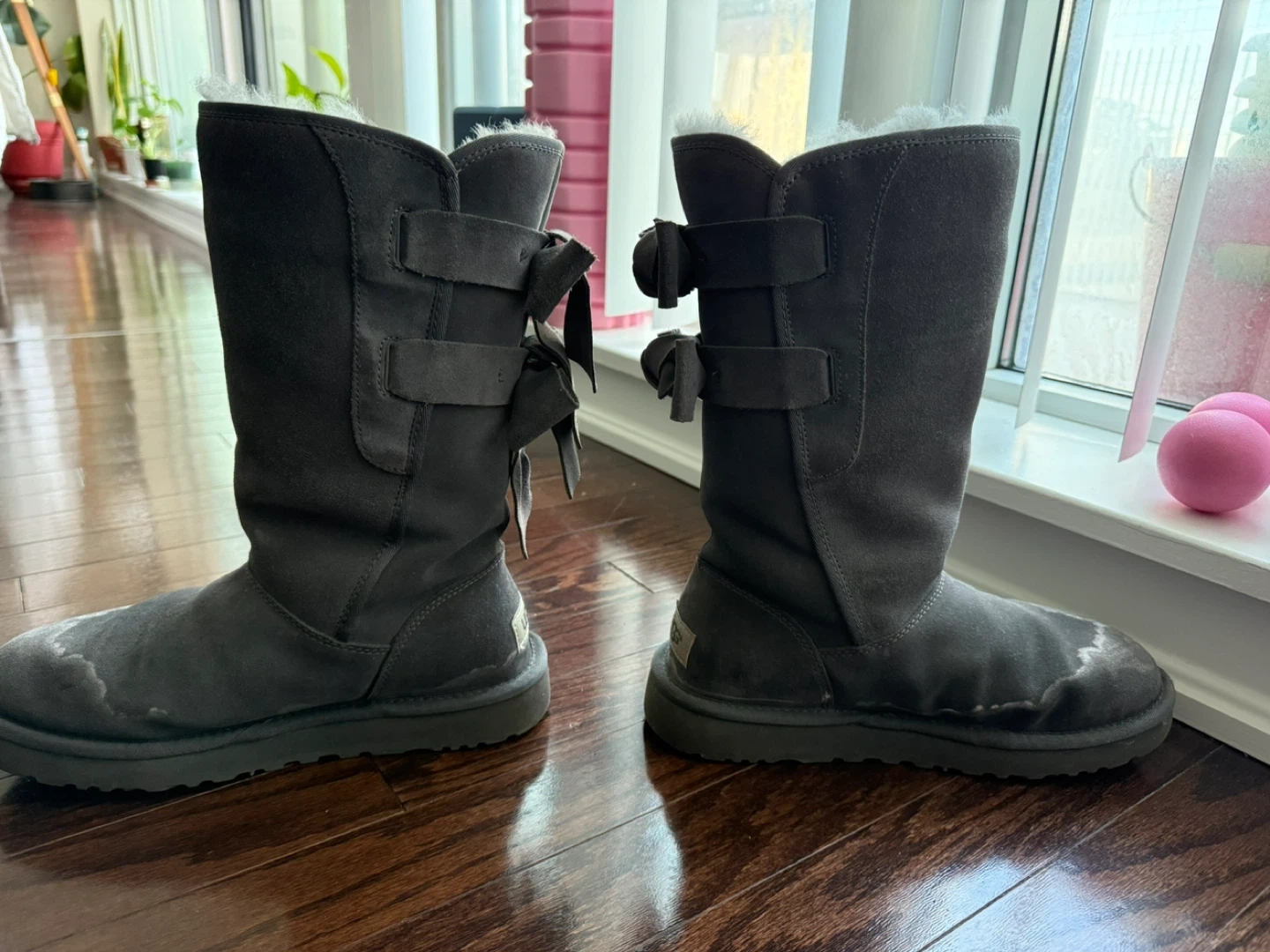 Selling a pair of UGG boots in size 7. They're a stylish gray colour and feature cute bows on the back. Perfect for keeping your feet warm and cozy during the colder months!