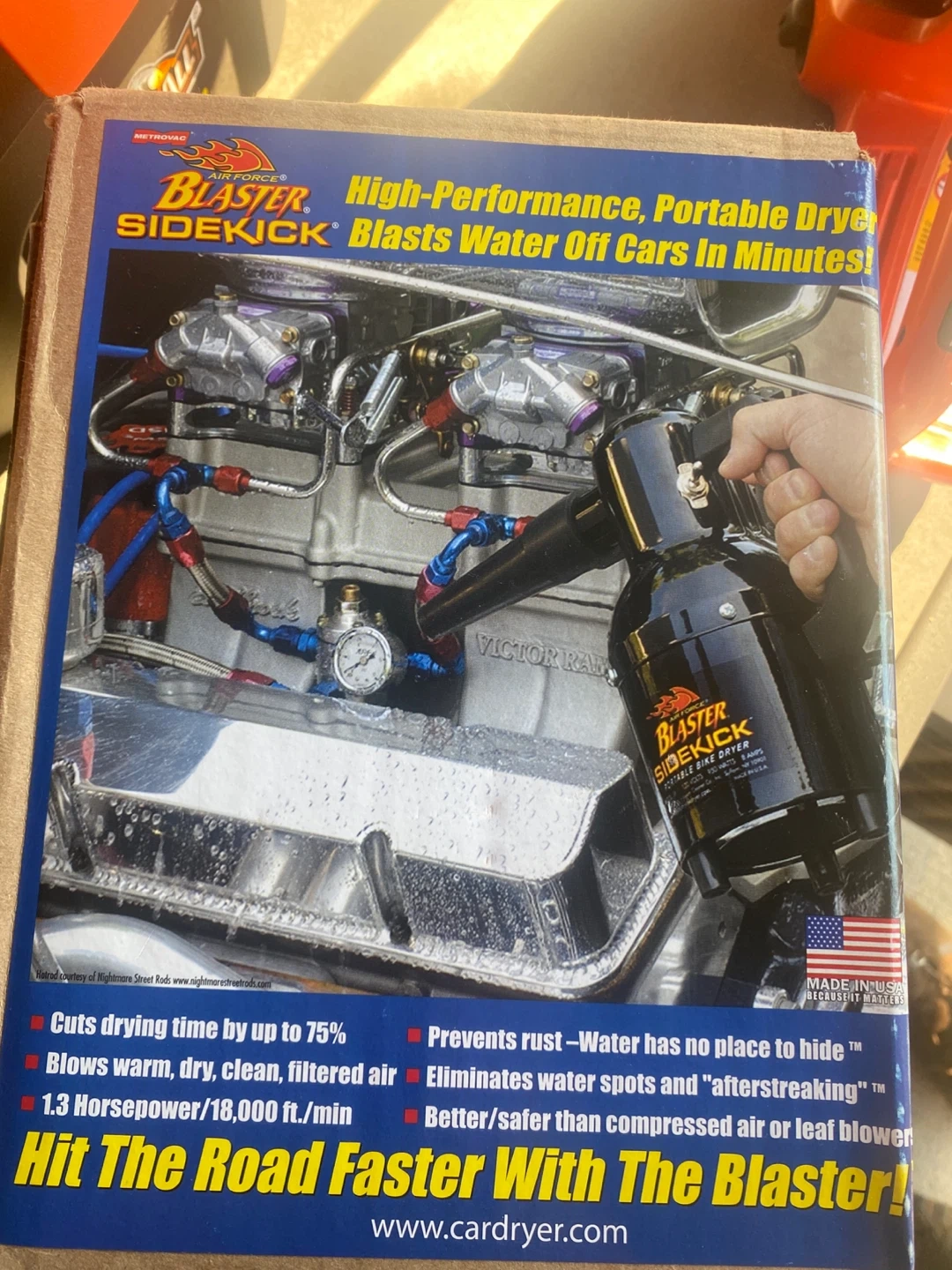 Selling a METROVAC Air Force Blaster Sidekick. It's a high-performance, portable dryer that blasts water off bikes and cars in minutes! It cuts drying time by up to 75% and blows warm, dry, clean, filtered air. It also prevents rust and eliminates water spots. It has 1.3 Horsepower/18,000 ft./min.
