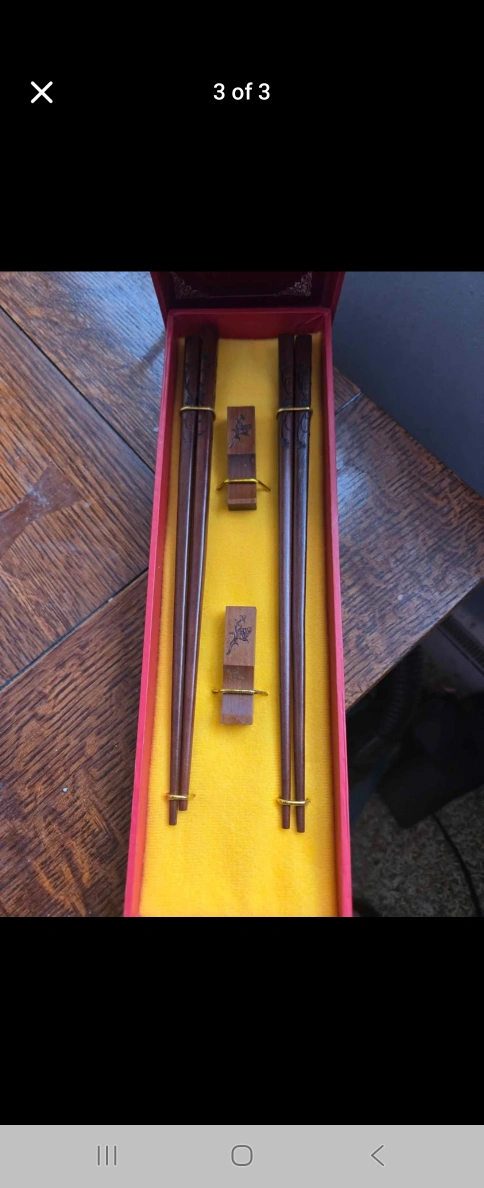 Here's a lovely set of wooden chopsticks, complete with chopstick rests and a presentation box. They appear to be in excellent condition and ready for a new home!