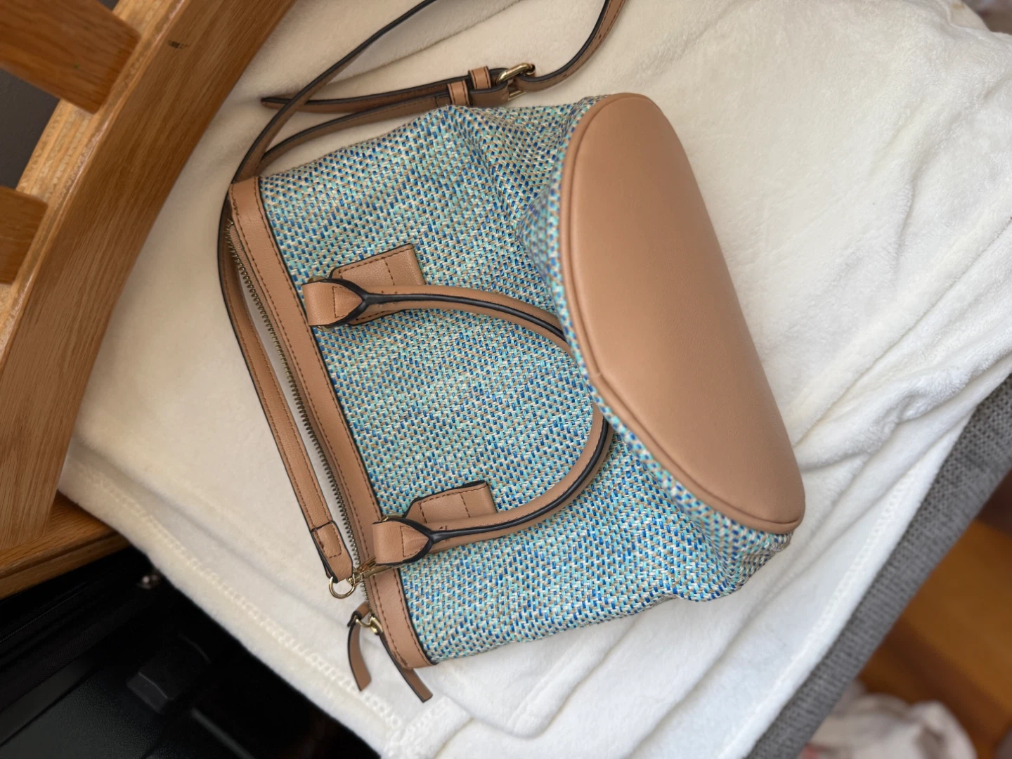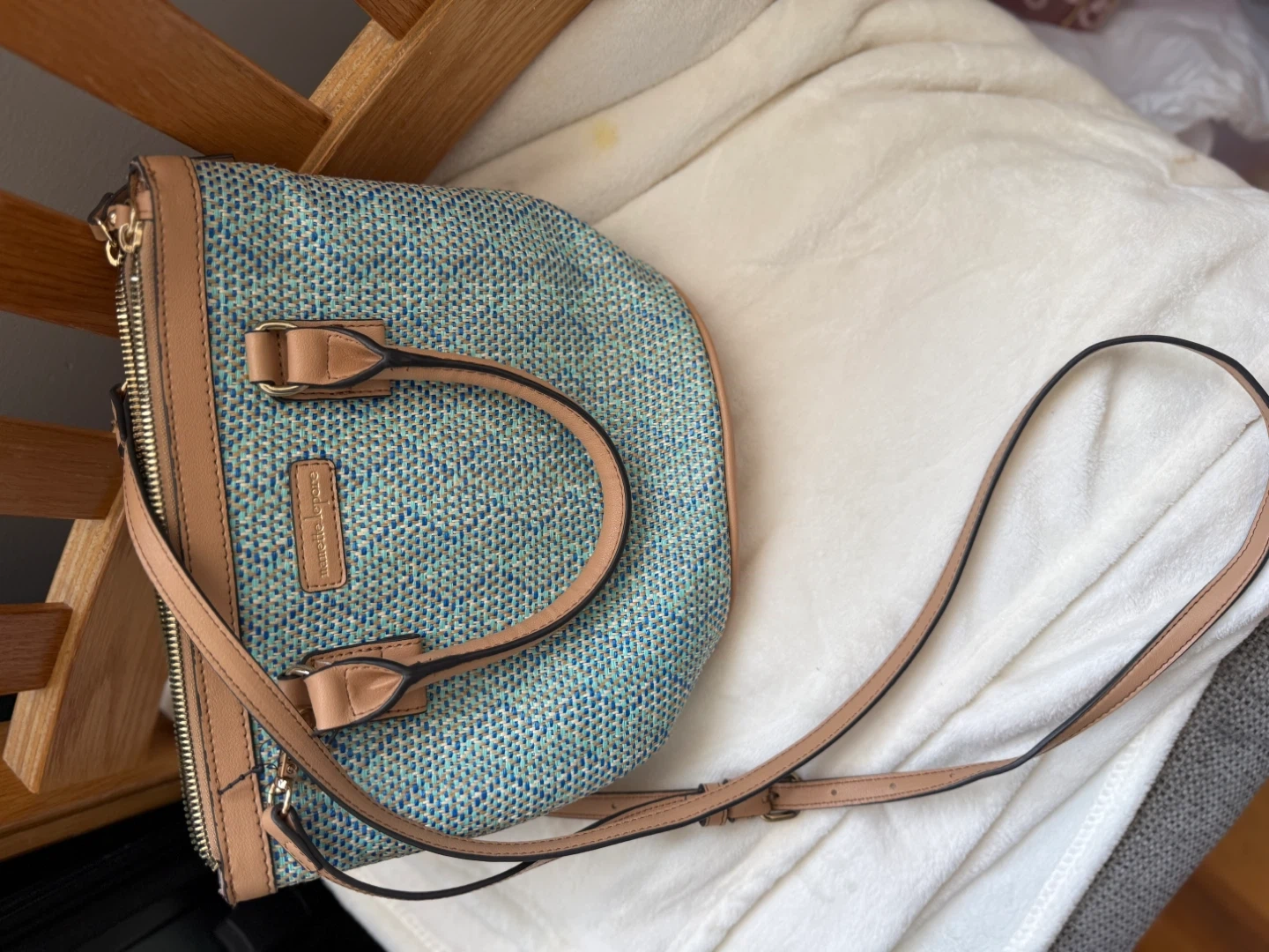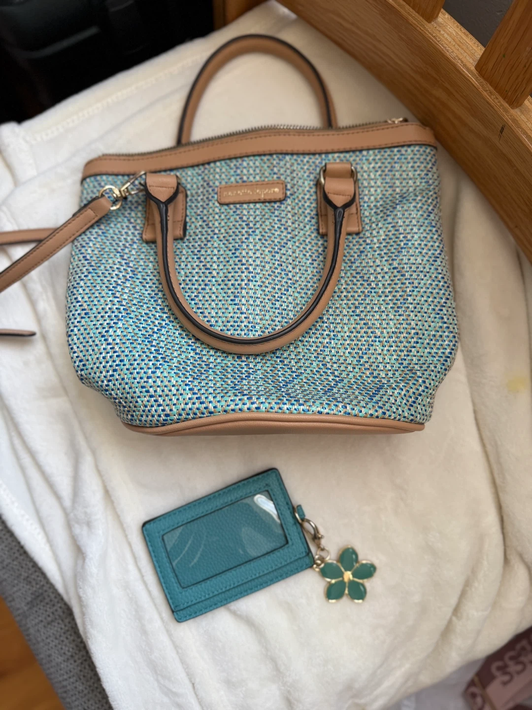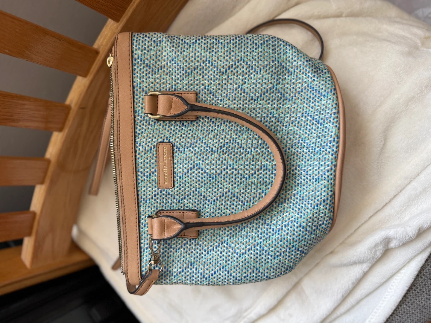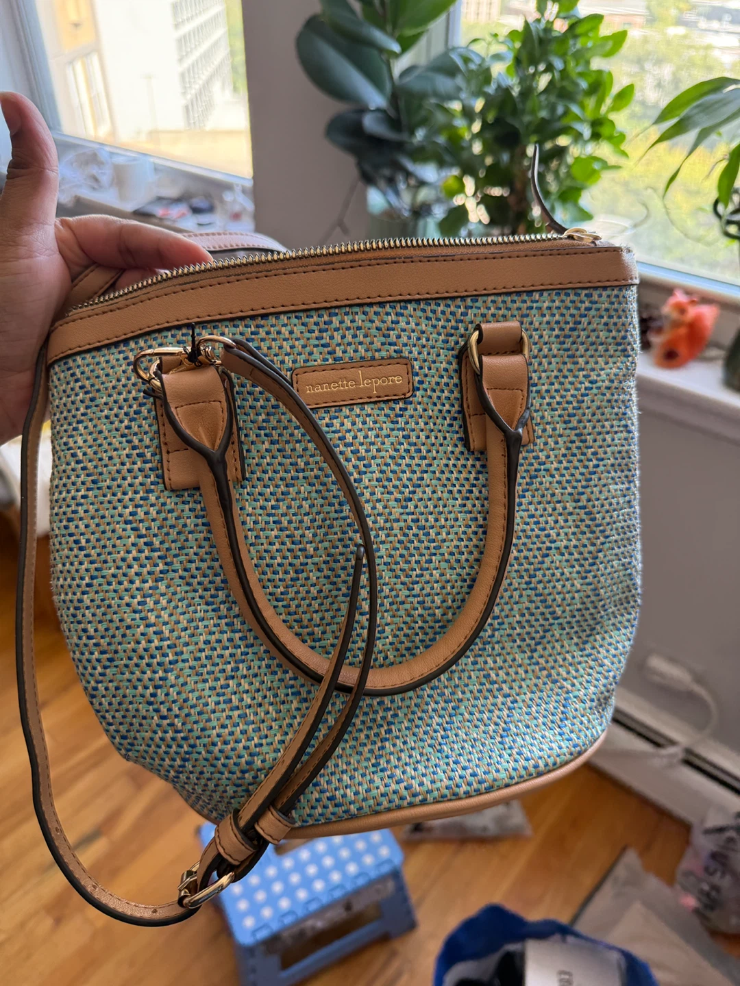 This is a Nanette Lepore woven sling bag. It's in great condition and has a cute flower detail on the card holder!