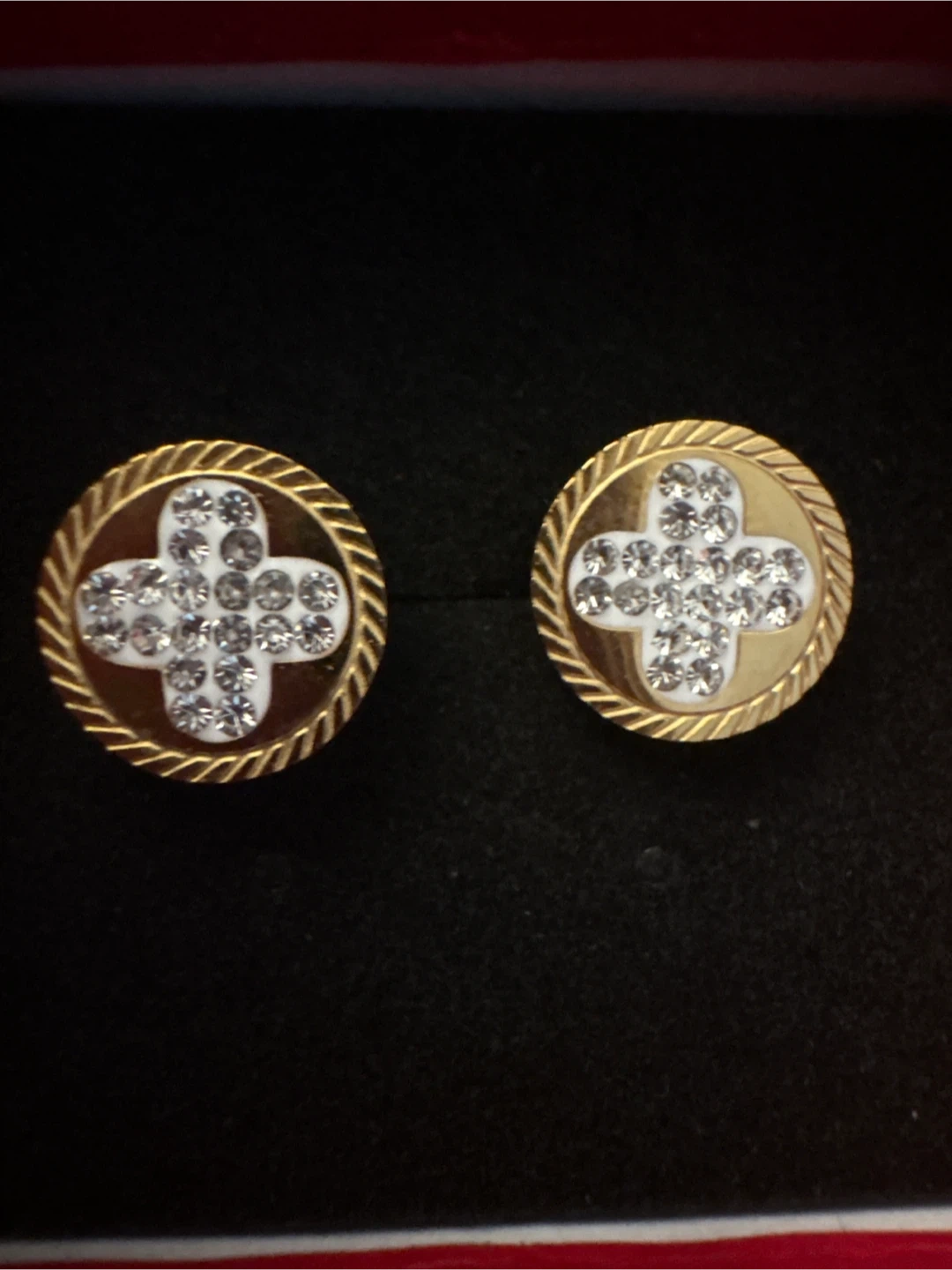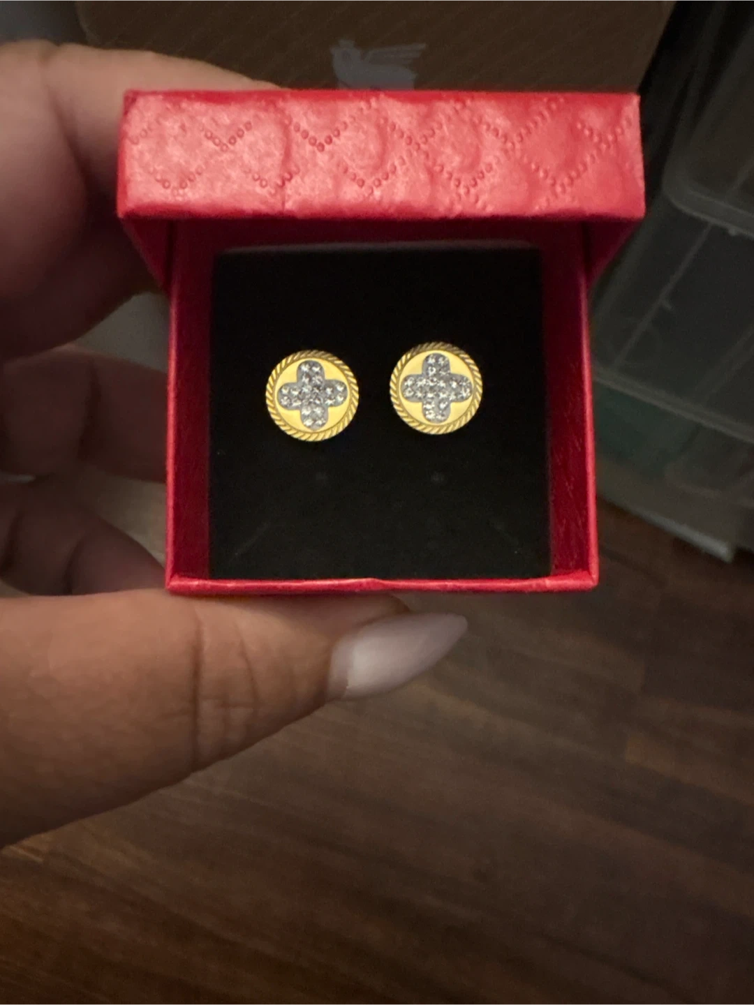 stud earrings with a clover CZ design. They come in a red box, ready for you! Perfect for adding a touch of sparkle to any outfit New with box and cleaning Cloth.