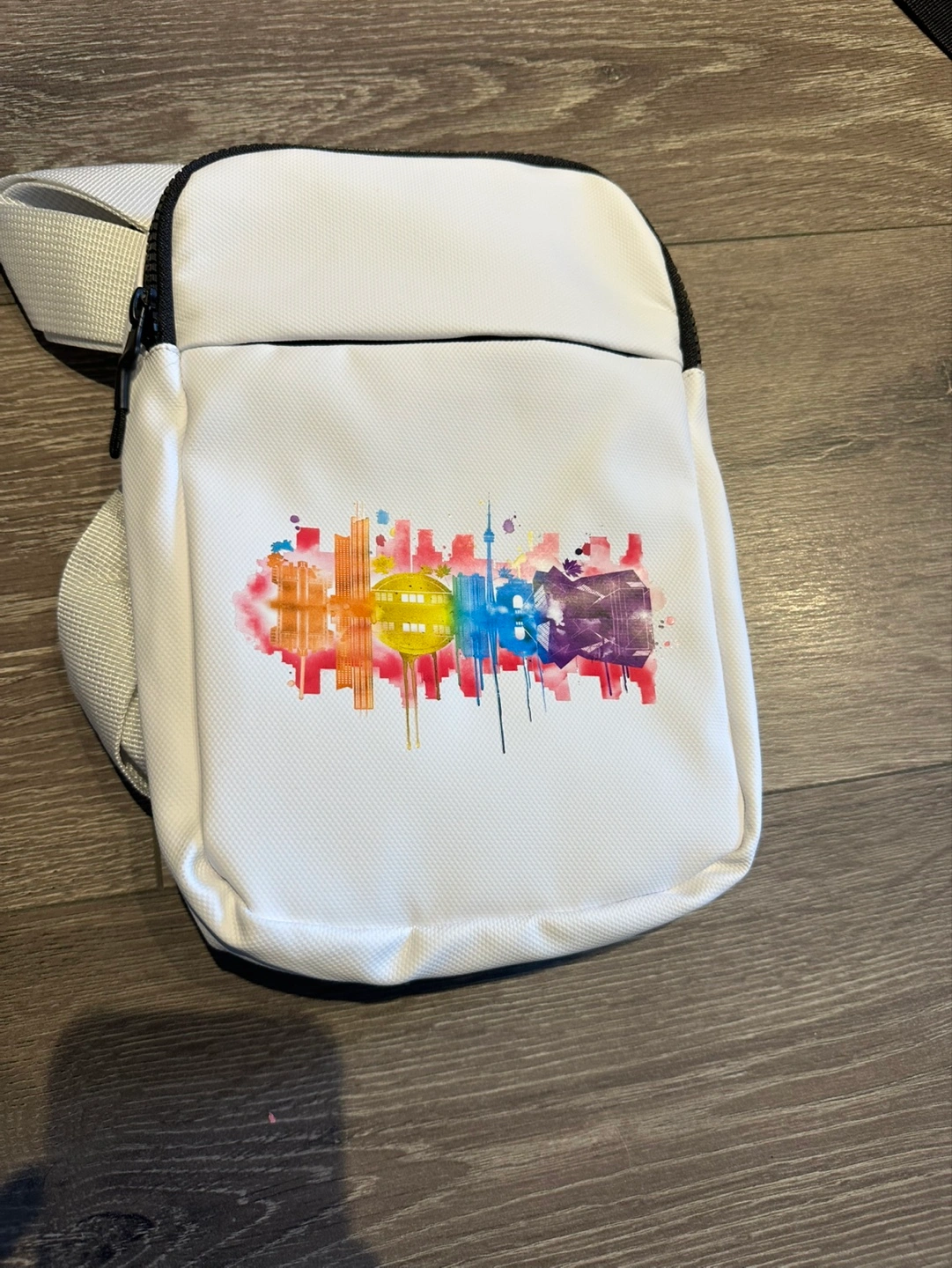 Here's a cute white crossbody bag with a colourful Toronto skyline design! It's in great condition and perfect for carrying your essentials around town. The back features the AWS Summit Toronto logo.