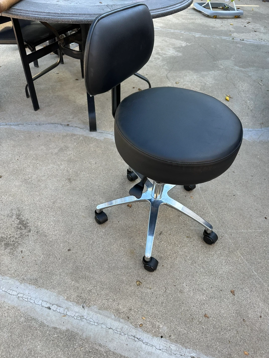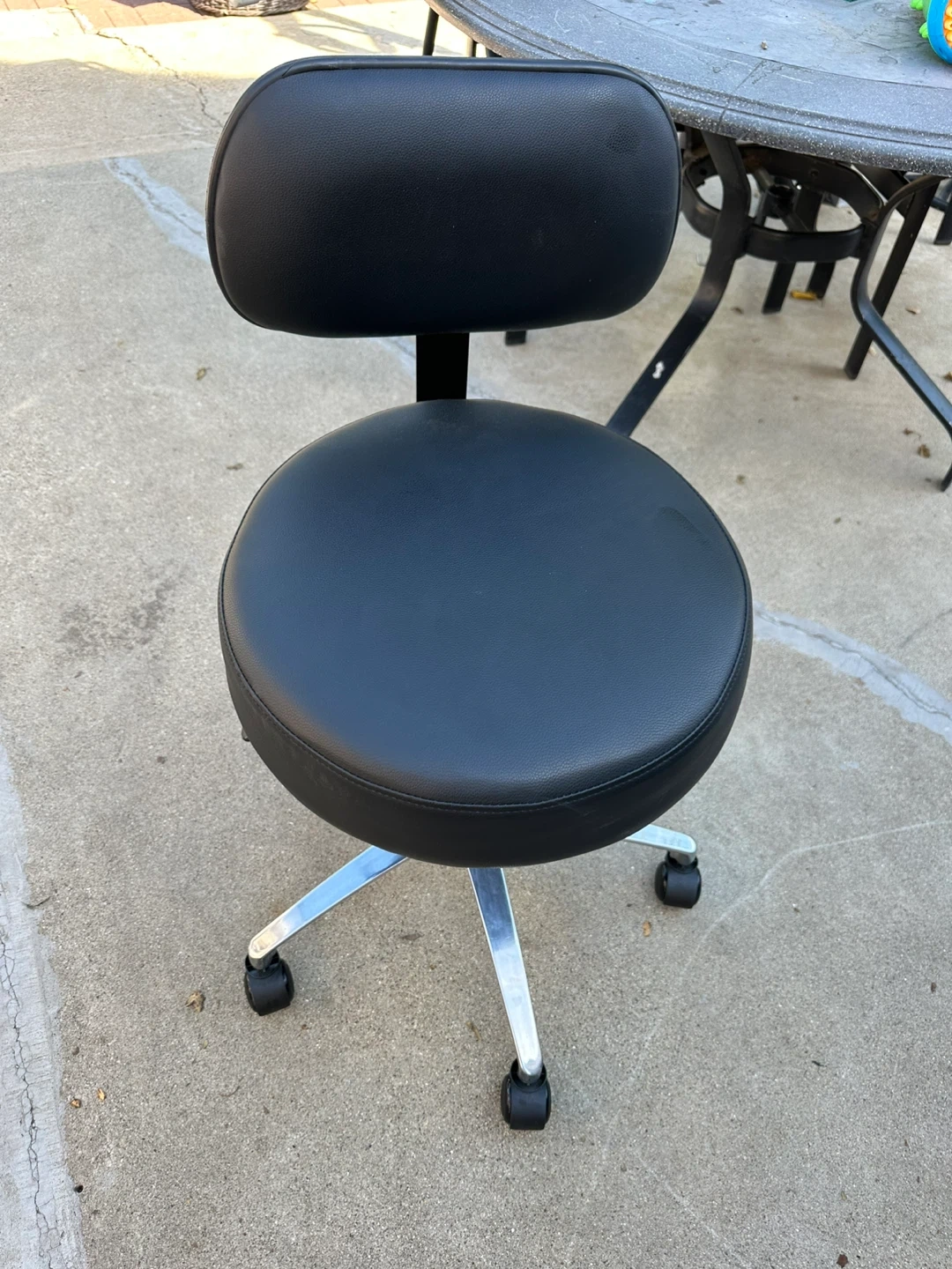 Selling a black rolling swivel stool chair! It's in good condition and perfect for a variety of uses, like in a salon, workshop, or home office. The stool has a comfortable padded seat and backrest, and it rolls smoothly on its casters. It's also height adjustable, so you can customize it to your needs