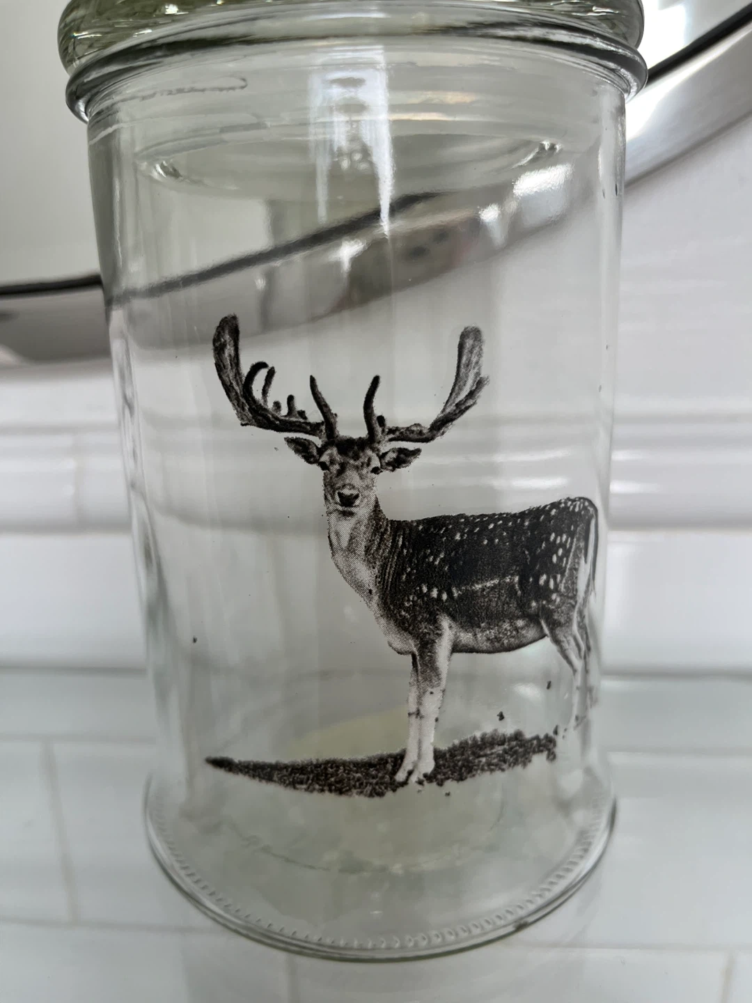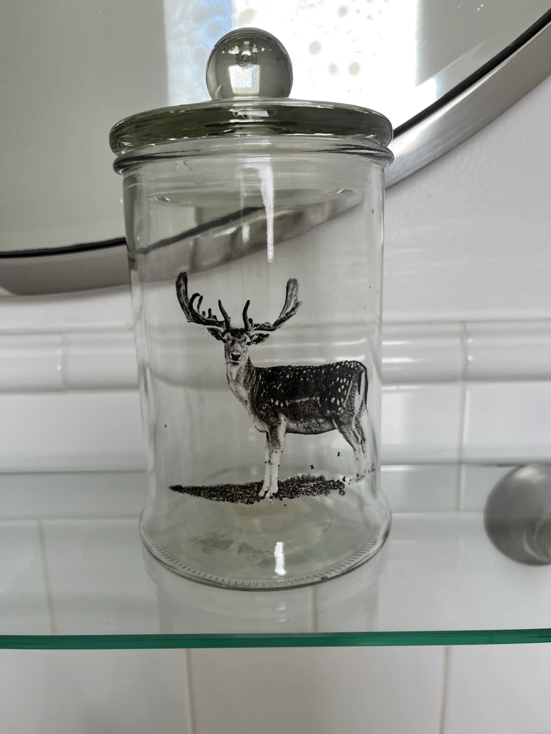 Glass jar and lid with a deer design. Perfect for bathroom storage.