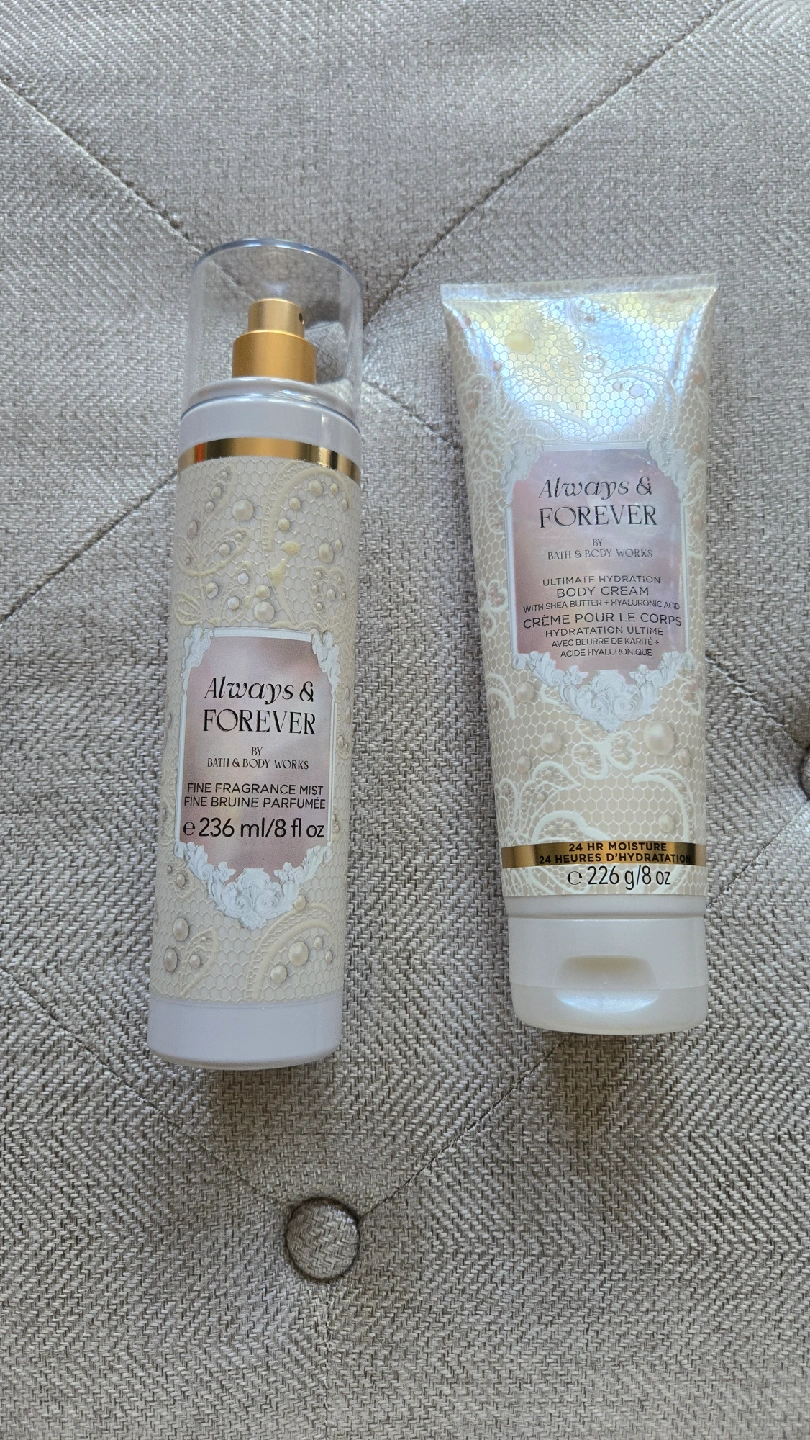 Selling a Bath & Body Works Always & Forever set! Includes a fine fragrance mist (236 ml/8 fl oz) and an ultimate hydration body cream (226 g/8 oz). The body cream provides 24-hour moisture.