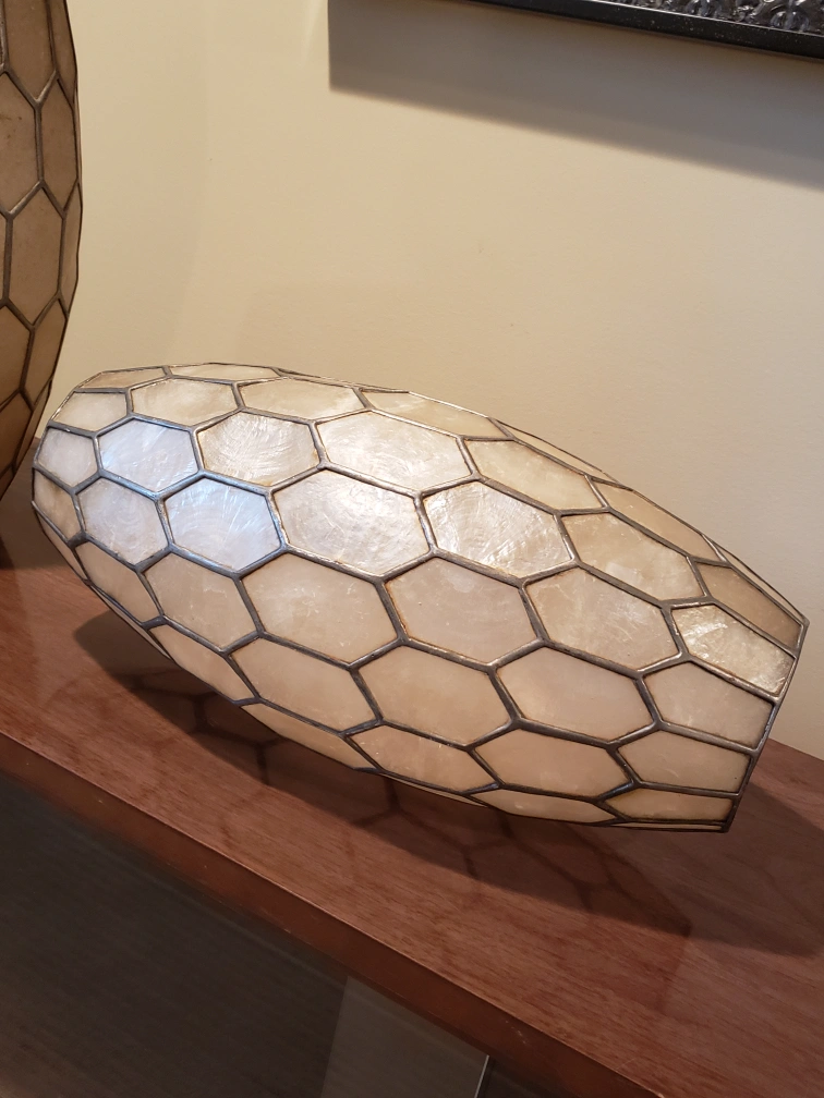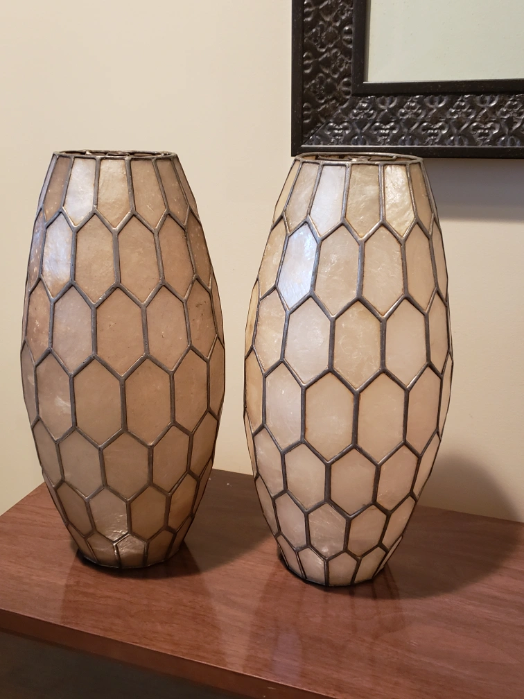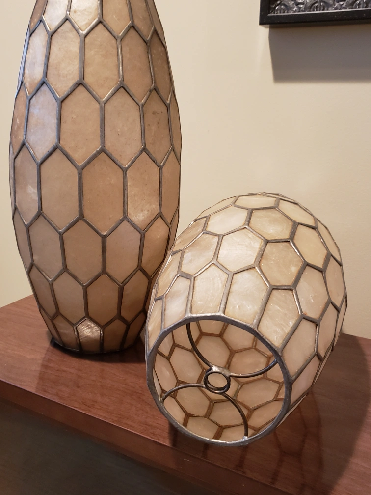 RARE CAPZI LAMP SHADES, WHAT A FANTASTIC FIND. Thess delightful shell lamp shades are 2 very old pieces crafted for YOUR unique space . The versatility of these lamp shades can mean lamps, pendent fixtures or wall sconces. Change your light bulb color and change the lamp color. A swag lamp or a table lamp. This capzi lamp shade is a collectors dream! 7 inches diameter and 15 inches tall. $200 each or for both $300.