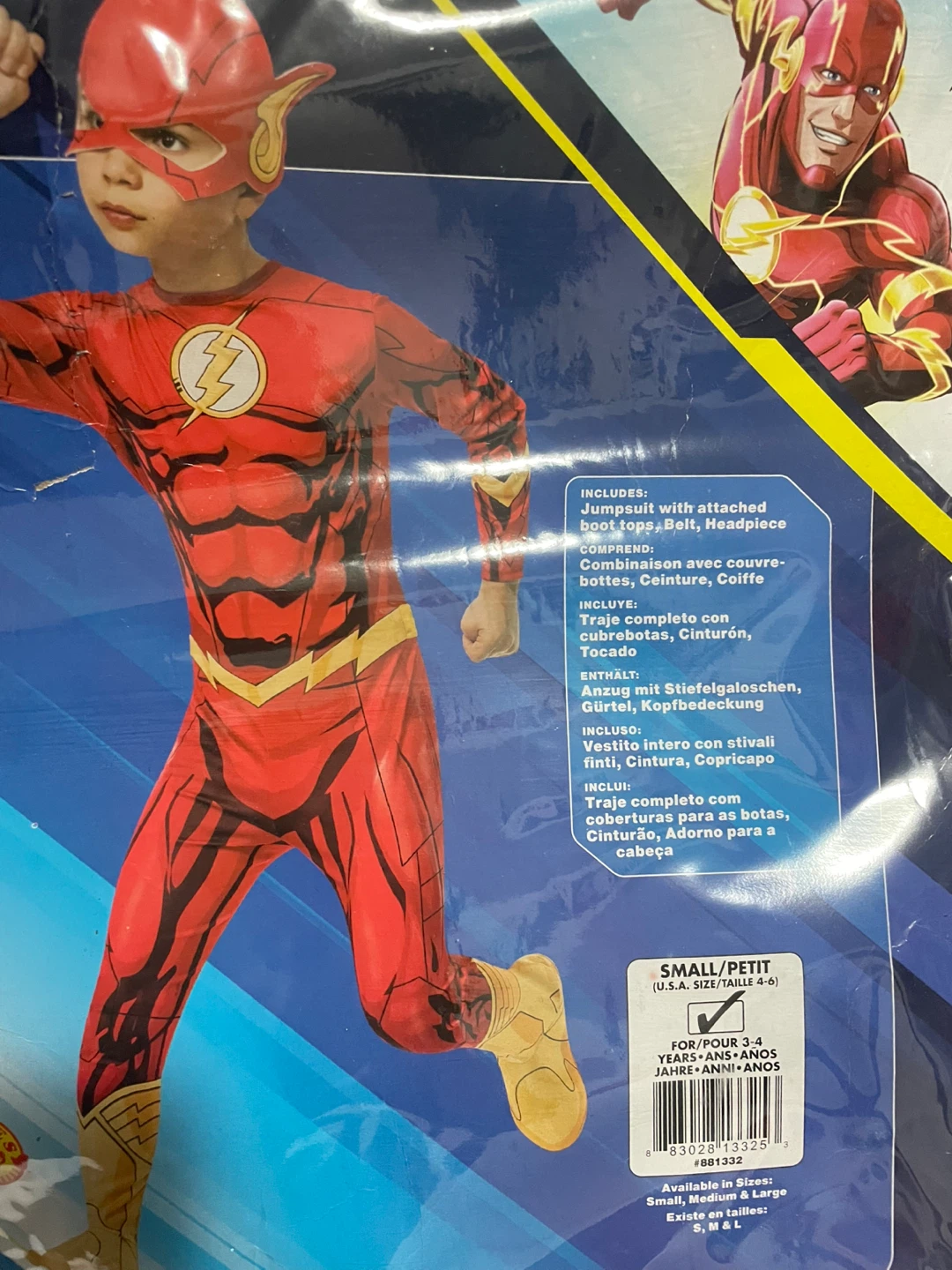 Zoom into fun with this The Flash costume! It includes a jumpsuit with attached boot tops, a belt, and a headpiece. Perfect for kids aged 3-4 years. Size is Small (U.S.A. Size/Taille 4-6).