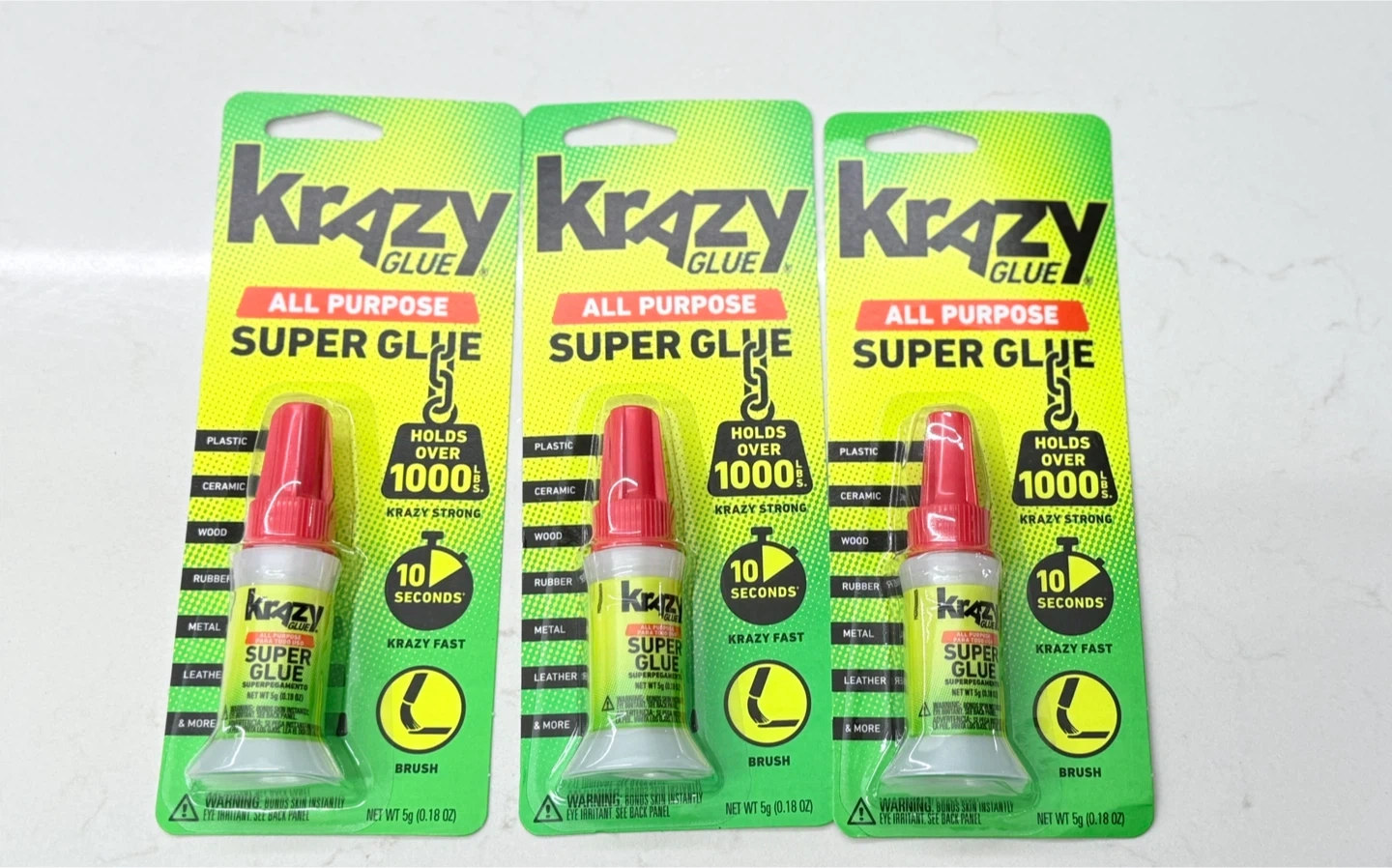 3 packs of Krazy Glue All Purpose Super Glue. It holds over 1000 lbs and is krazy strong! It works in 10 seconds and is krazy fast! It comes with a brush and the net weight is 5g (0.18 oz) New in package, selling because I have some already.