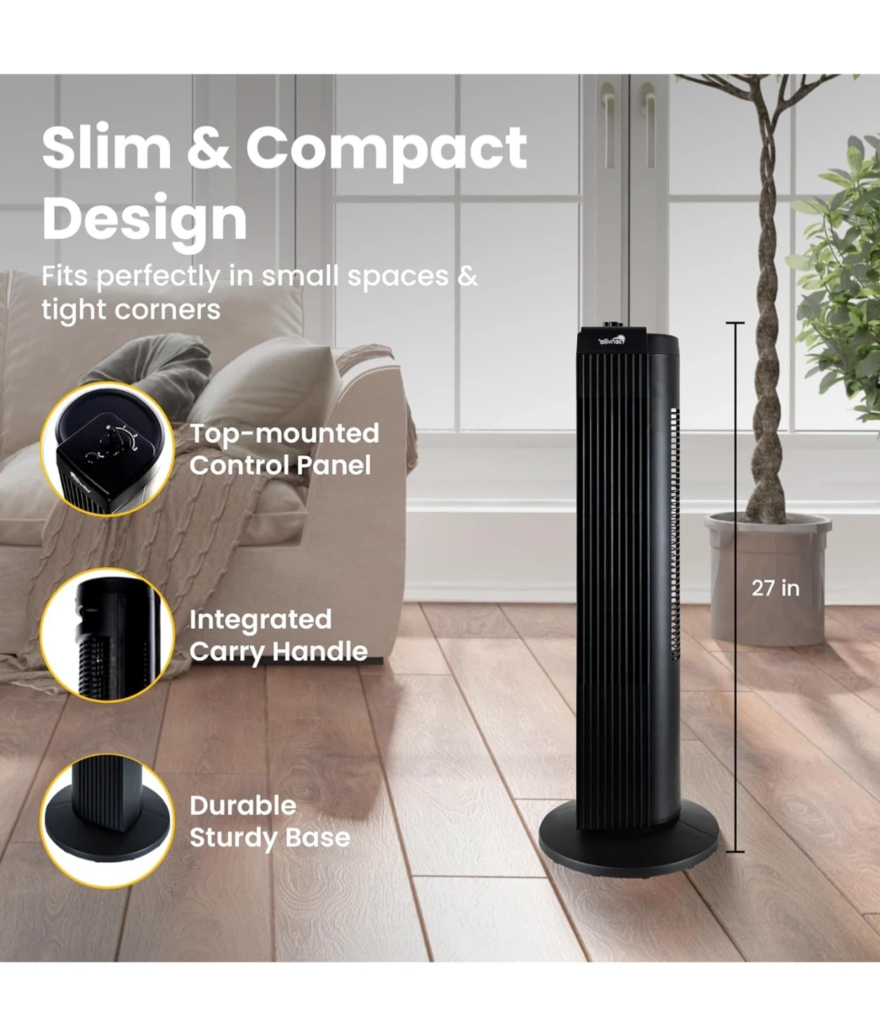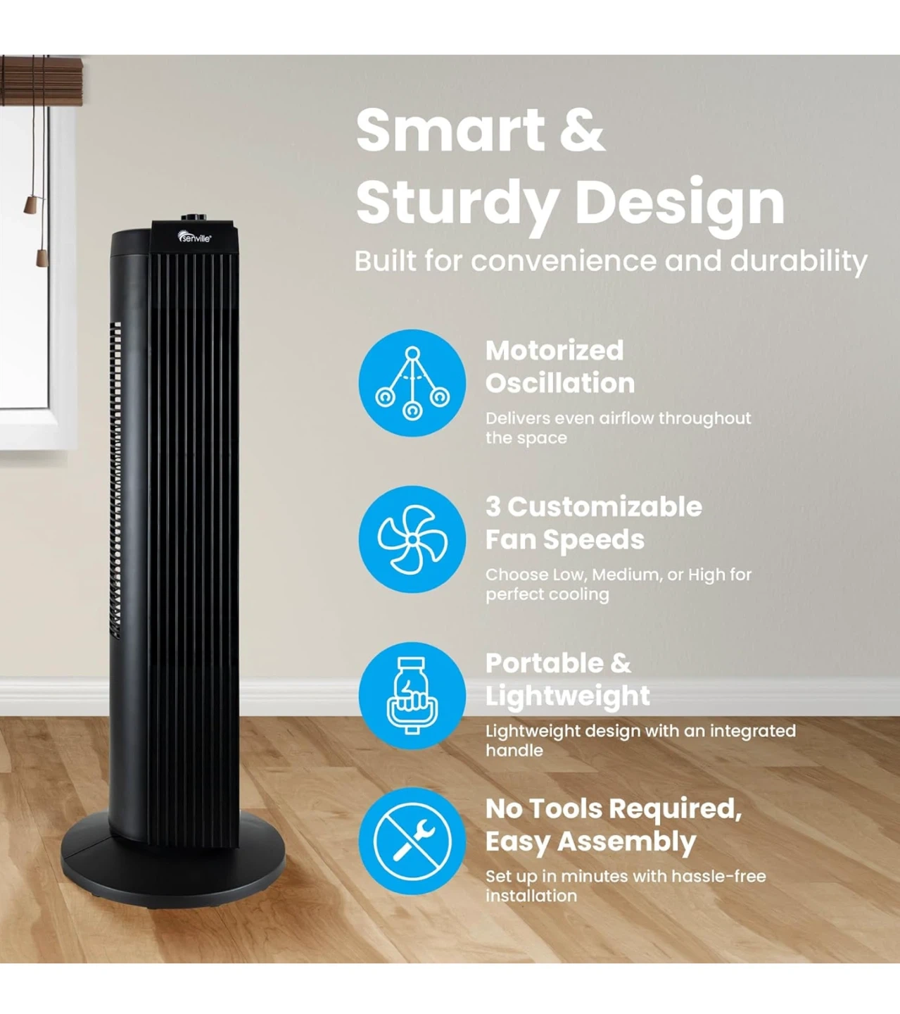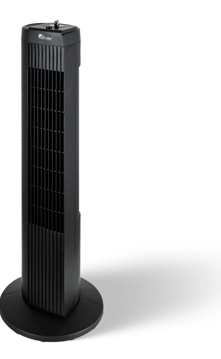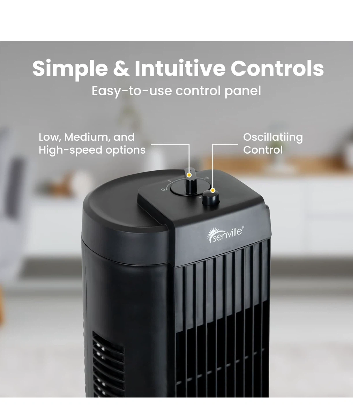 Keep cool with this Senville tower fan! It features a motorized oscillation for even airflow, 3 customizable fan speeds, and a lightweight design with an integrated handle. It's also easy to assemble with no tools required. Enjoy powerful cooling with a wide rotation angle and an optimum personal comfort level. The slim and compact design fits perfectly in small spaces and tight corners