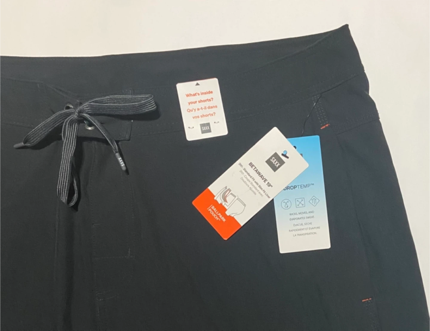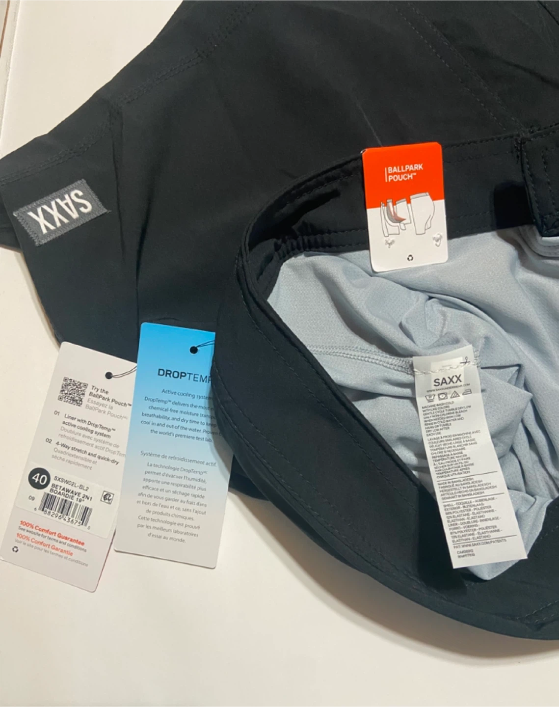 Selling a pair of SAXX BetaWave 2N1 19" shorts in size 40. These shorts feature the DropTemp cooling liner with BallPark Pouch for extra comfort. The shell is made of 88% polyester and 12% elastane, while the liner is 87% polyester and 13% elastane. Great for staying cool and comfortable!