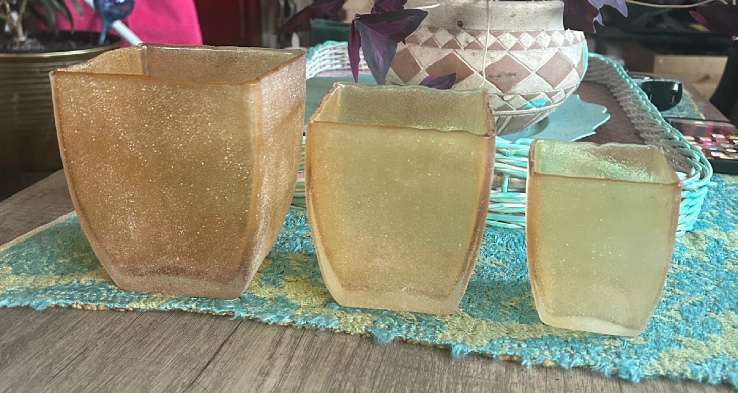 Selling a set of three decorative glass vases/ candle holder. They come in varying sizes and have a lovely, subtle sparkle to them. Perfect for adding a touch of elegance to any room!