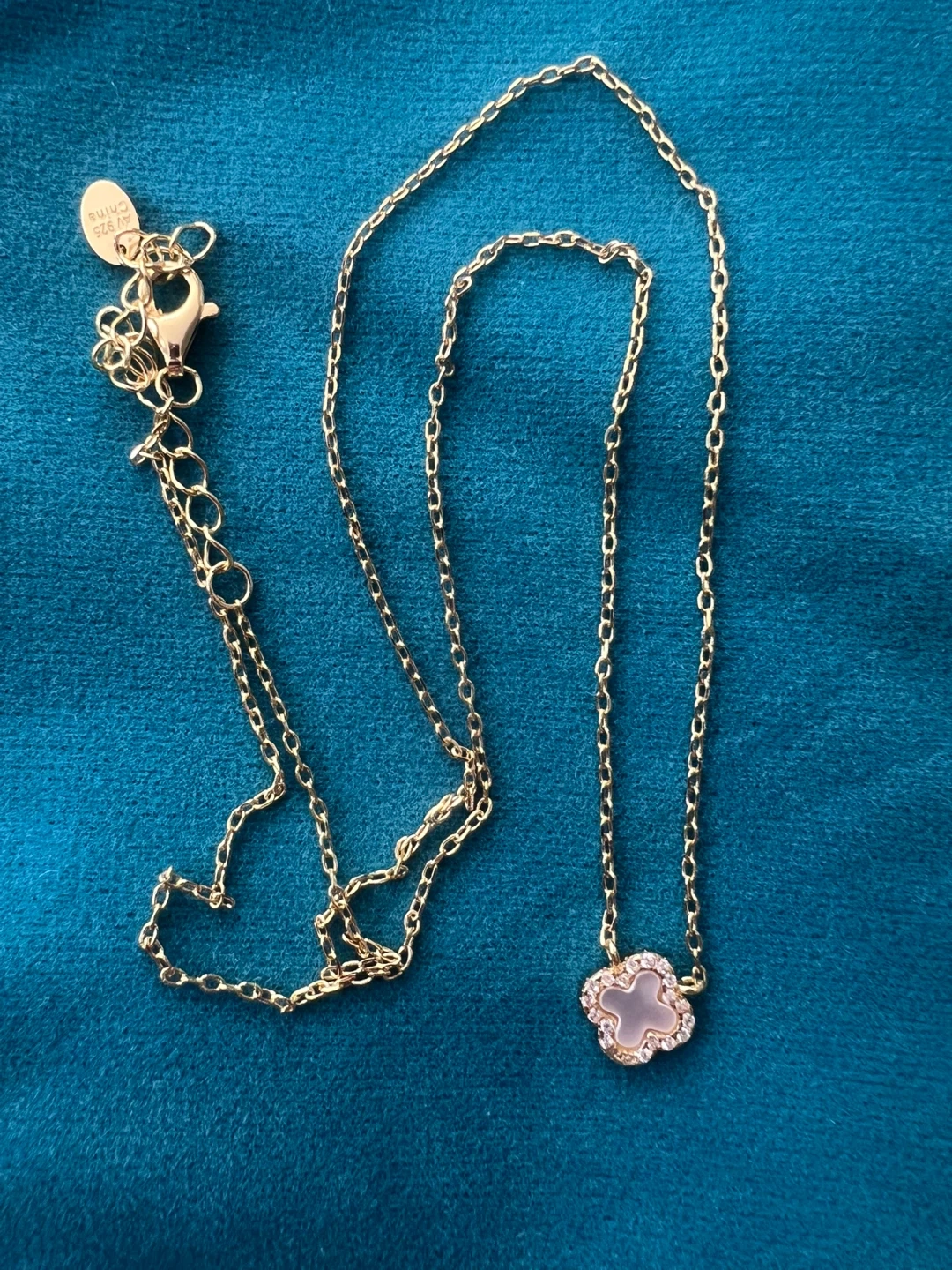 Cute gold-tone necklace with a clover pendant. The pendant is a light pink colour with a sparkly border. The necklace has a lobster clasp and an adjustable chain.