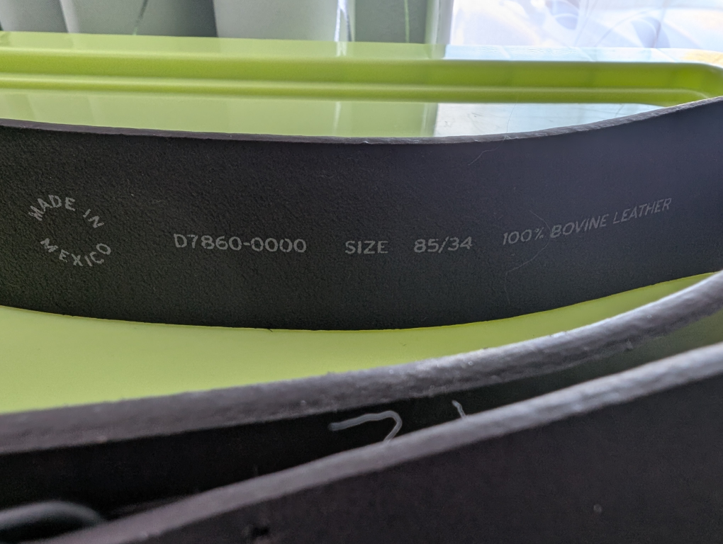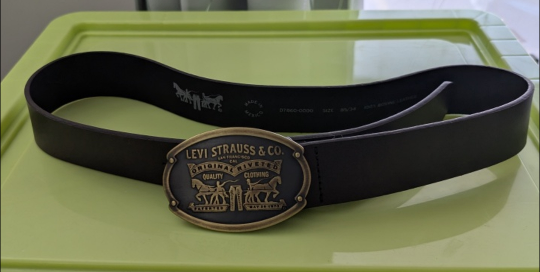 Levi Strauss & Co. leather belt in size 85/34. It's made in Mexico from 100% bovine leather. A stylish and durable accessory!
