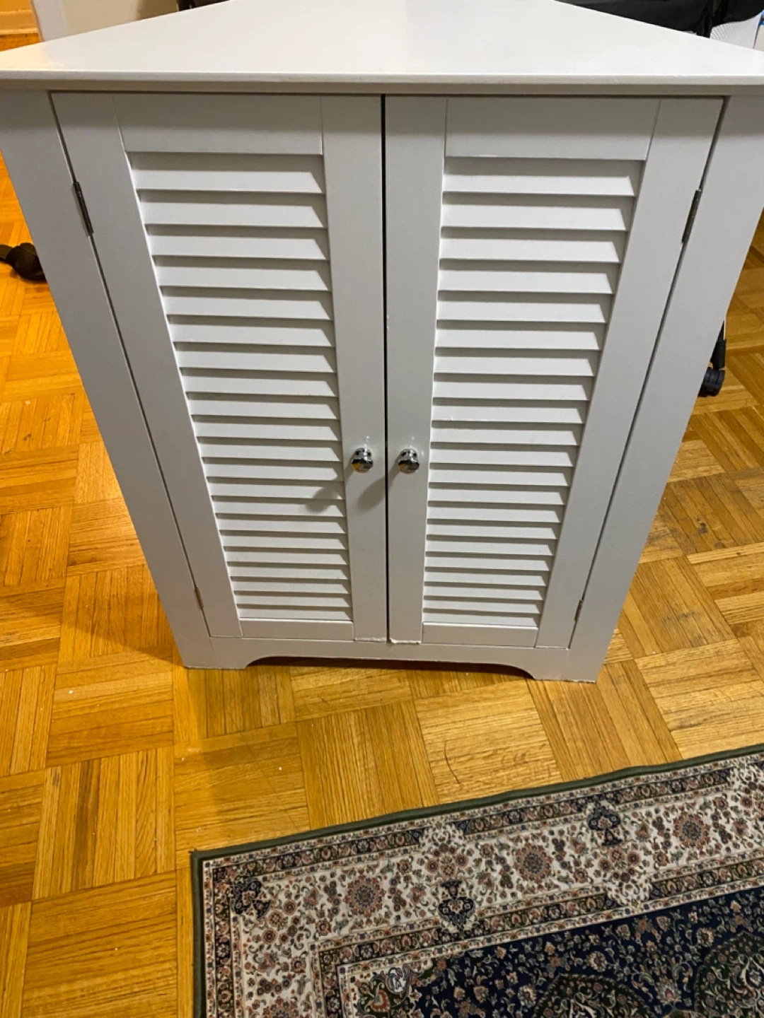 Selling a white two-door cabinet. It has a shutter-style design on the doors and two shelves inside. Great for extra storage!