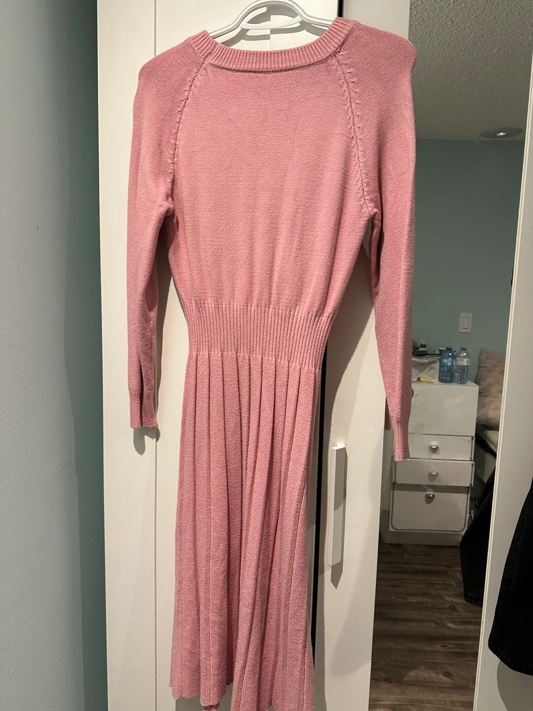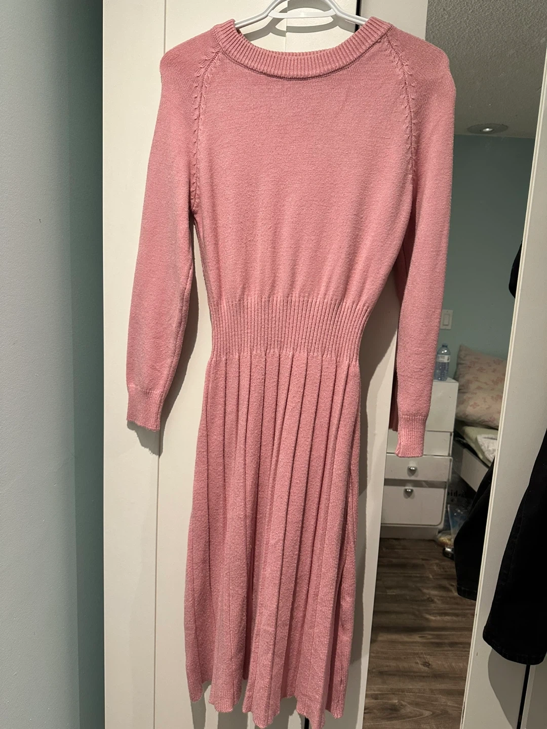 Selling a cute pink knit dress! It's in great condition and perfect for a cozy day out. The knit material is soft and comfortable, and the dress has a flattering fit.