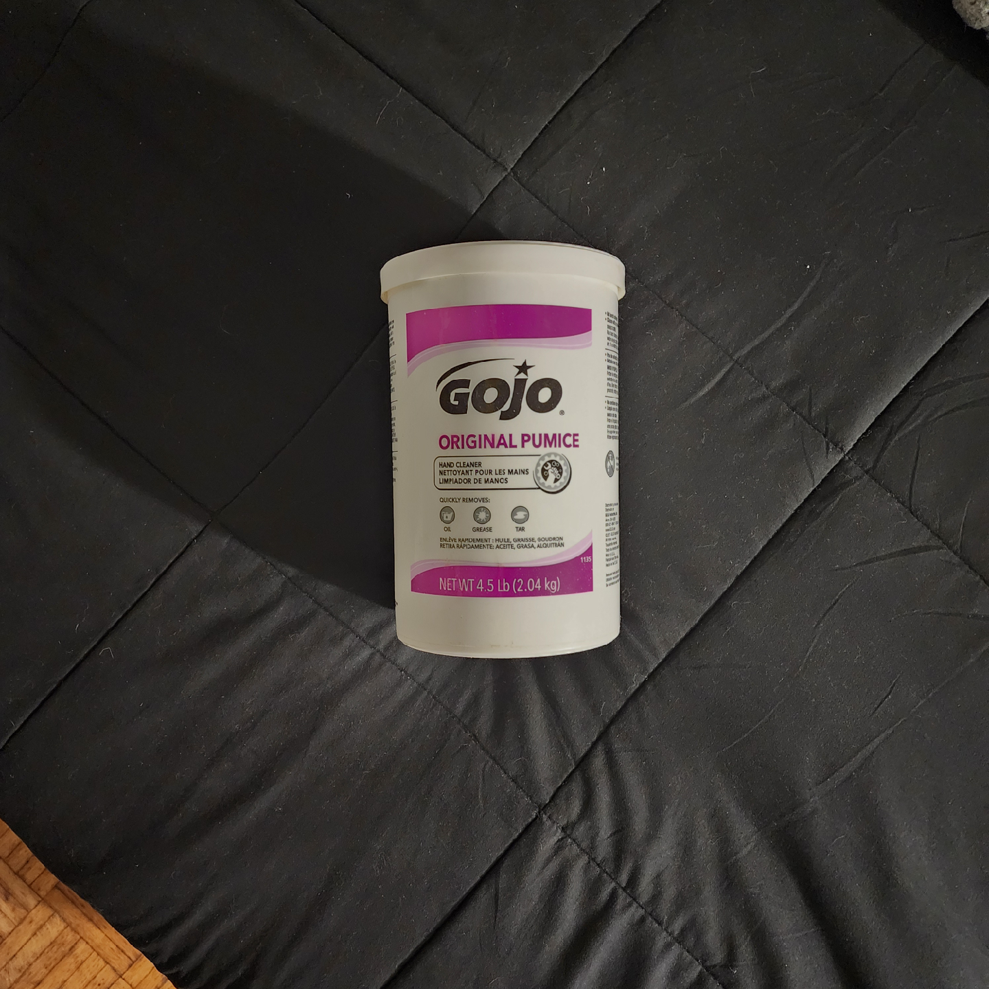 Giving a 4.5 lb container of GOJO Original Pumice Hand Cleaner. It effectively removes grease, grime, resins, inks, epoxies, paint, cement, and tar. Perfect for keeping your hands clean after tough jobs!