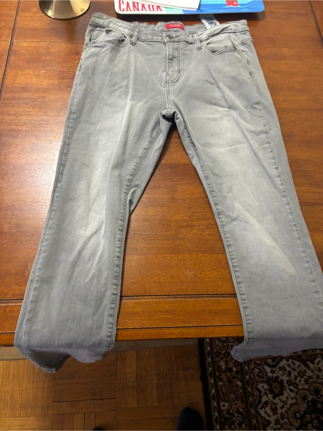 Selling a pair of Guess Los Angeles skinny jeans in a stylish grey colour! The size is 36, perfect for a comfortable fit. These jeans are made in Pakistan and have a classic design that will match any outfit