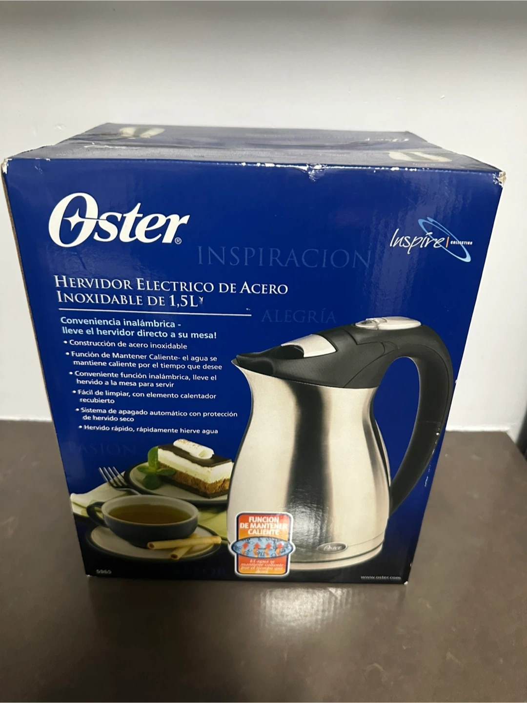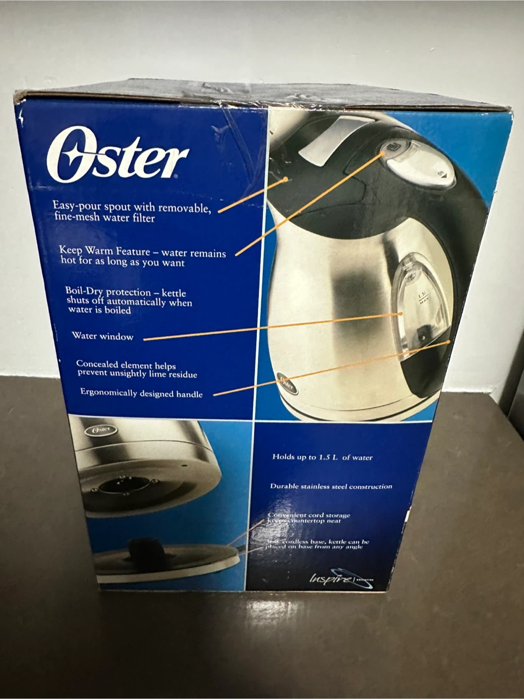 Selling an Oster electric kettle! It's made of durable stainless steel and holds up to 1.5 liters of water. It features an easy-pour spout with a removable, fine-mesh water filter and a keep-warm feature to keep water hot. The kettle also has boil-dry protection and shuts off automatically when the water is boiled. Comes with convenient cord storage and an ergonomically designed handle