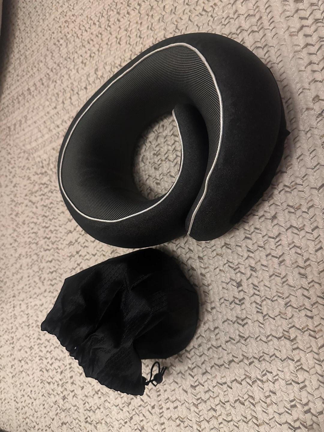 Selling a black travel neck pillow. It comes with a convenient carrying bag, making it easy to take on trips. Perfect for comfortable travel!