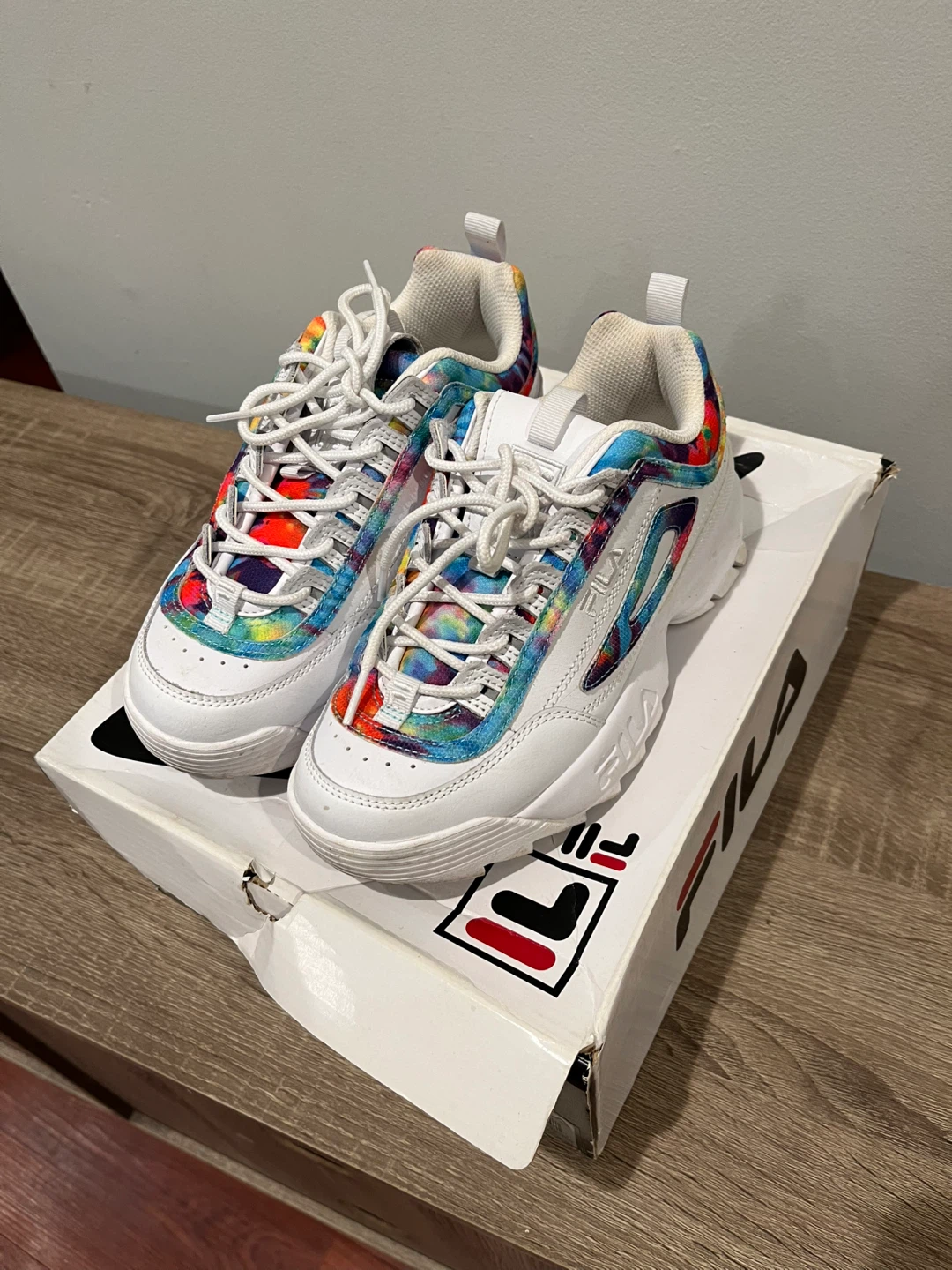 Selling a pair of Fila Disruptor II Tie Dye sneakers in a women's size 5. They come with the original box. The shoes feature a fun tie-dye pattern on a white base. Perfect for adding a pop of color to your outfit!