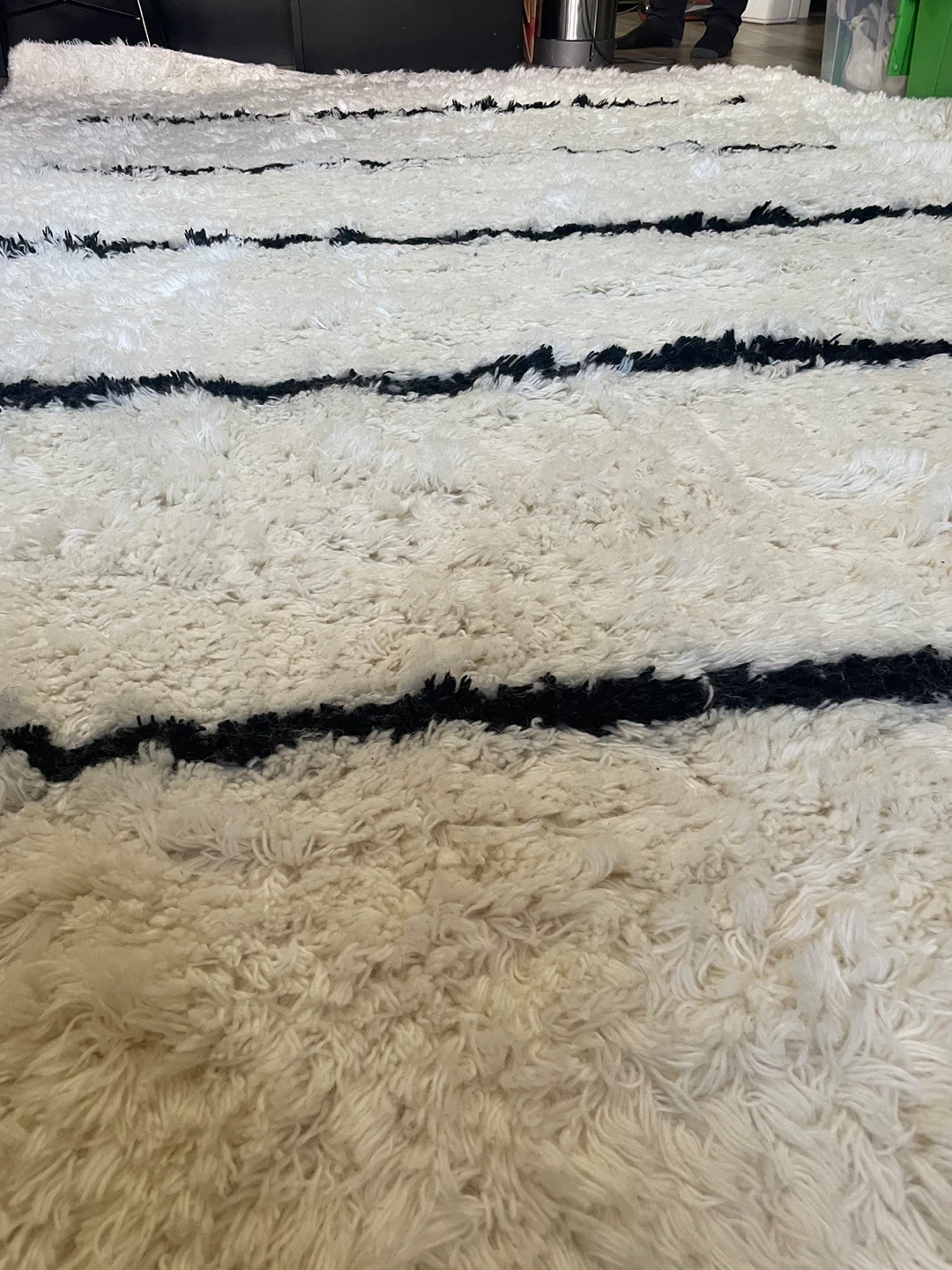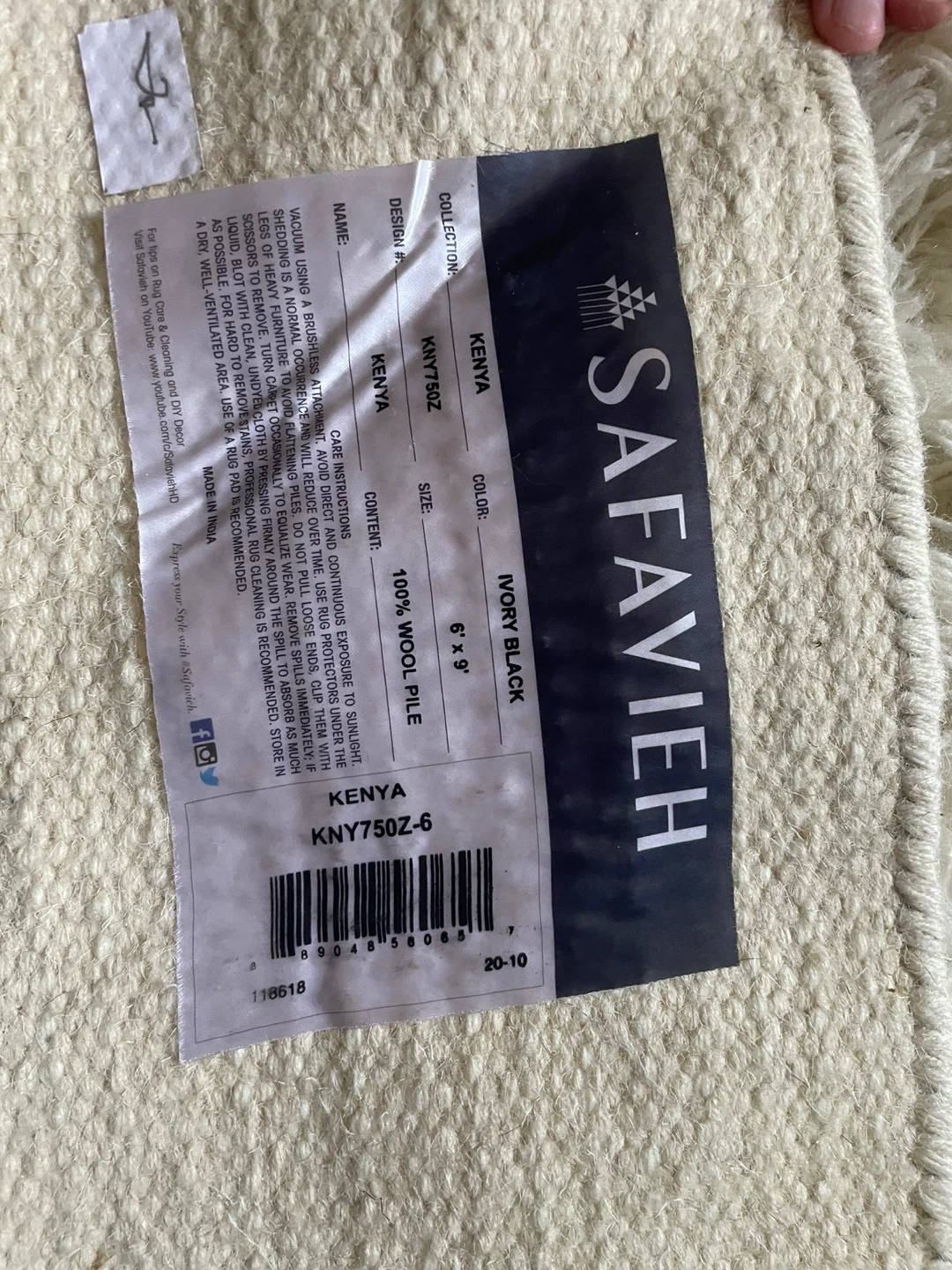 Selling a Safavieh Kenya rug in ivory black. It's a 6' x 9' rug made of 100% wool pile. This rug is designed for reduced shedding and continuous exposure to sunlight.