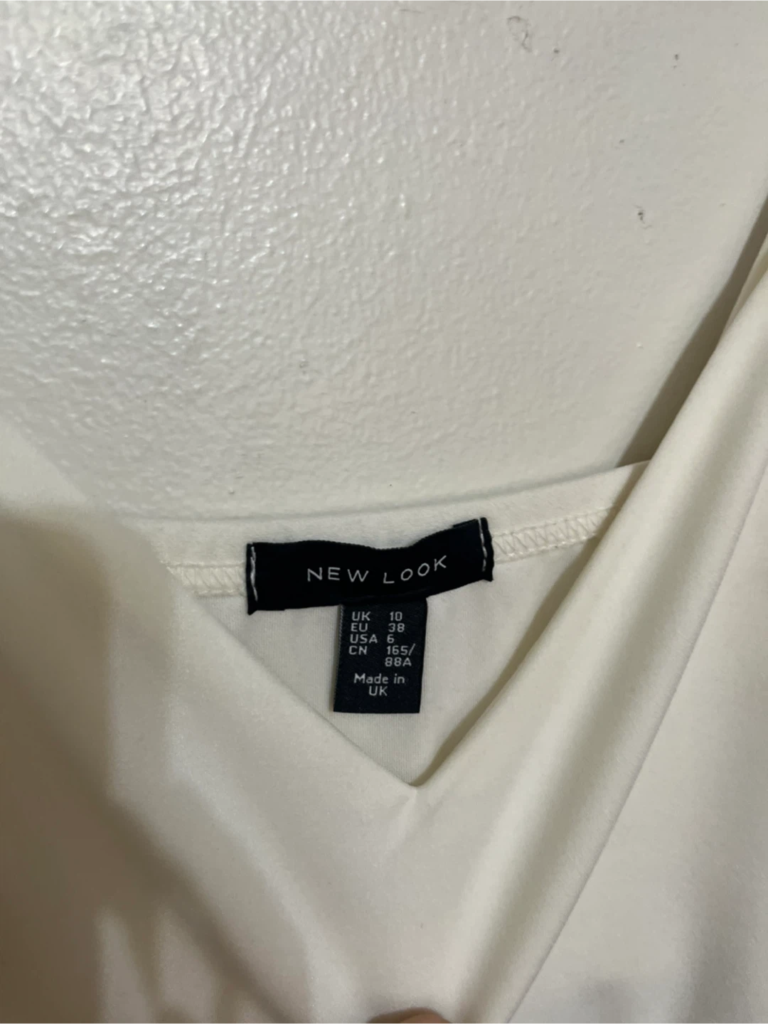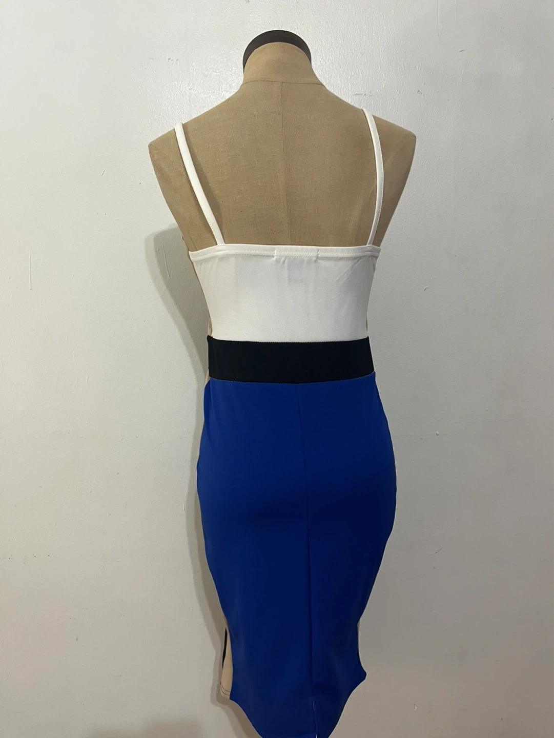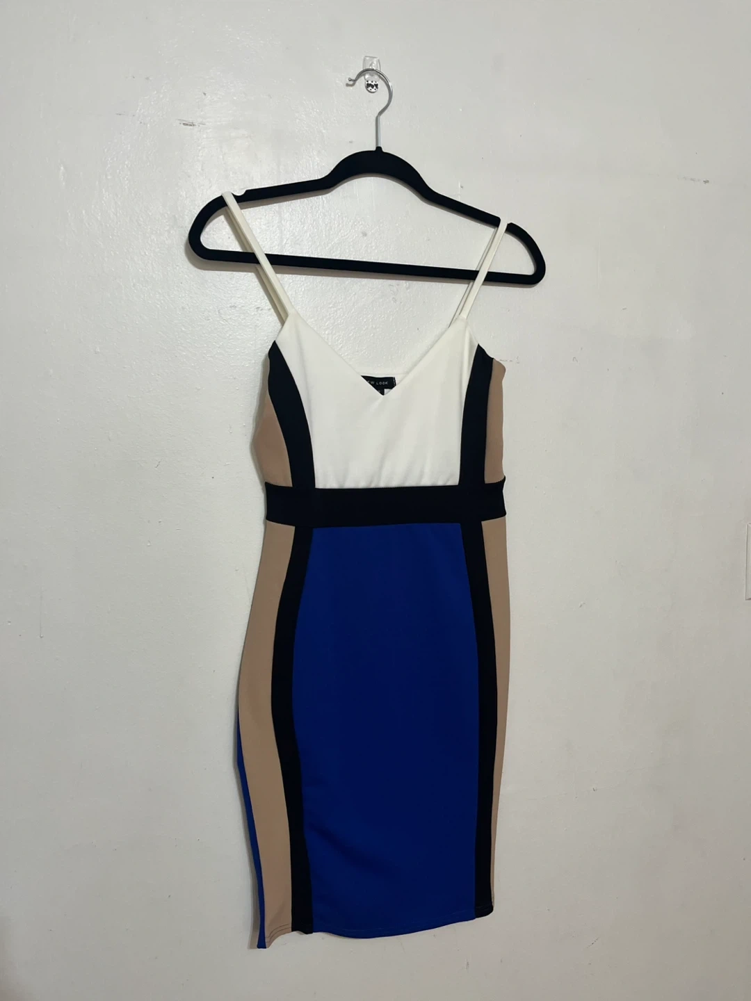 Selling a cute New Look bodycon dress in size 6 (originally from ASOS). It has a color block design with white, black, tan, and blue. It’s very very fitted and runs small. It’s more like a size 2.