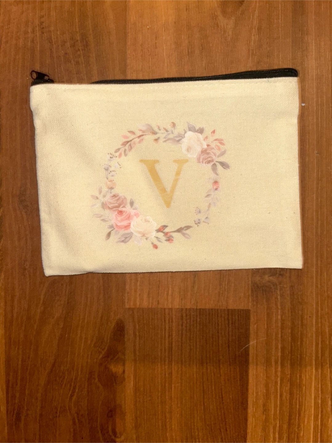 Cute little zippered pouch with a floral design surrounding the letter 'V'! Perfect for holding makeup, stationery, or other small items. It's in great condition and ready for a new home