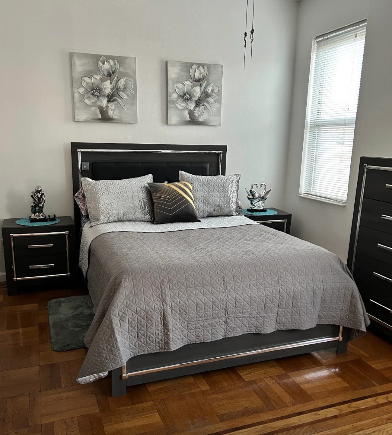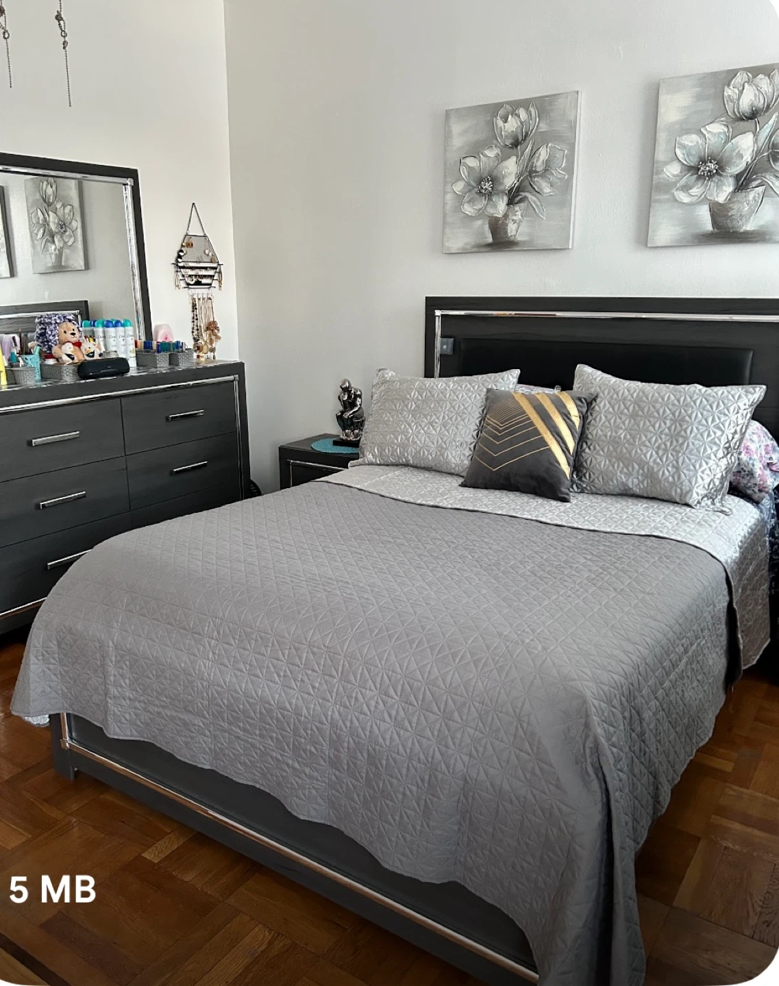 Complete bedroom set in great condition! Includes a bed frame, dresser, and two nightstands. The set features a sleek, modern design with a black and silver color scheme. Perfect for upgrading your bedroom decor!
