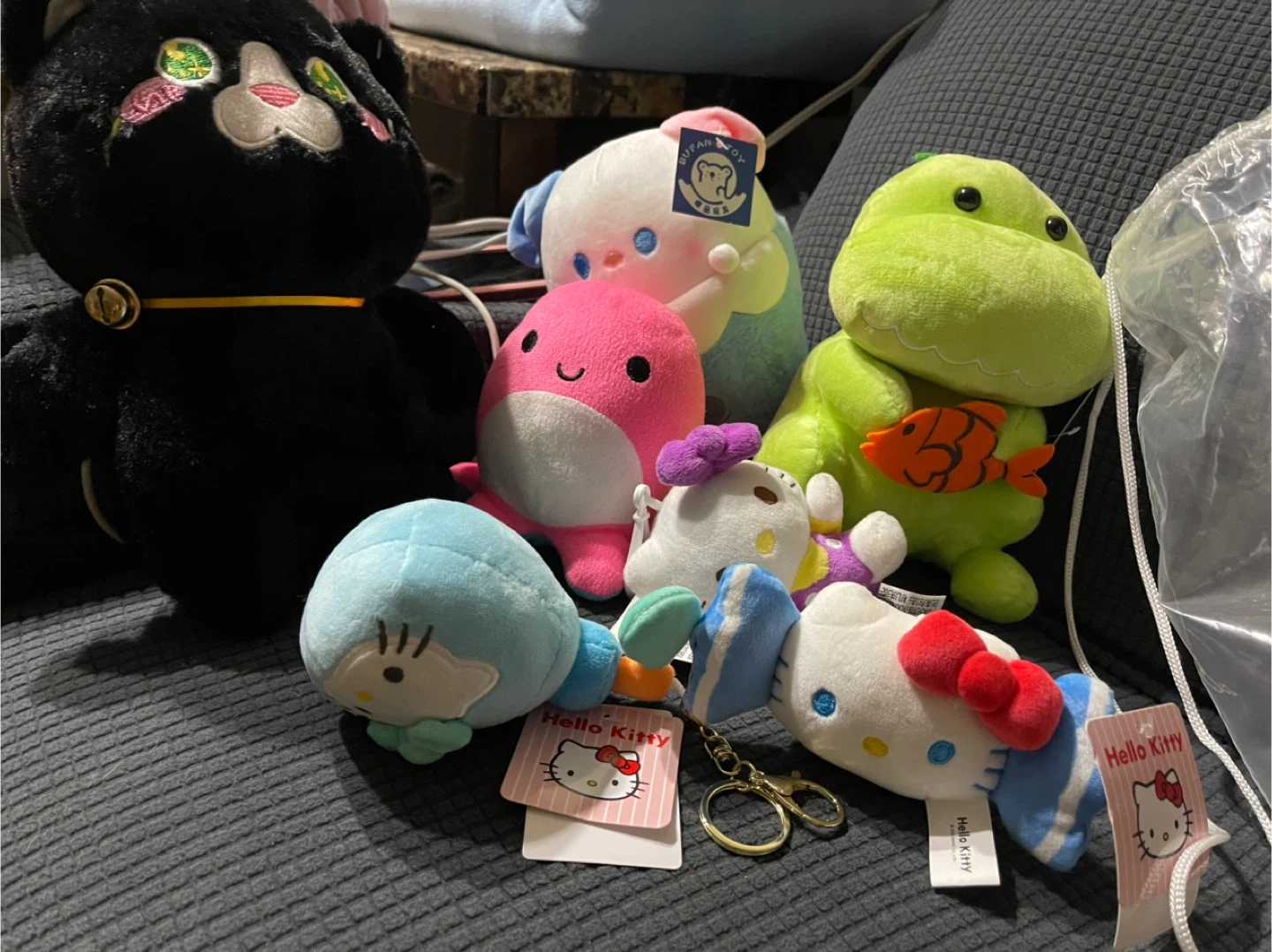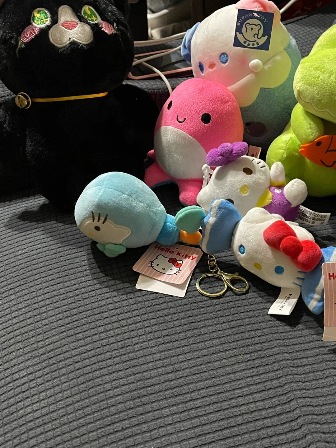 A collection of brand new cute plush toys, including a Hello Kitty plush with a red bow and a keychain. There's also an Aoger branded plush toy in the mix. All in great brand new condition and ready for a new home. The greatest gift you can give someone .