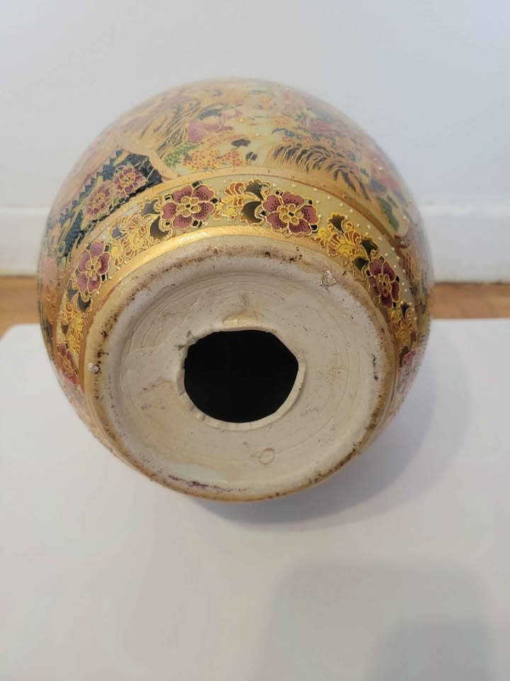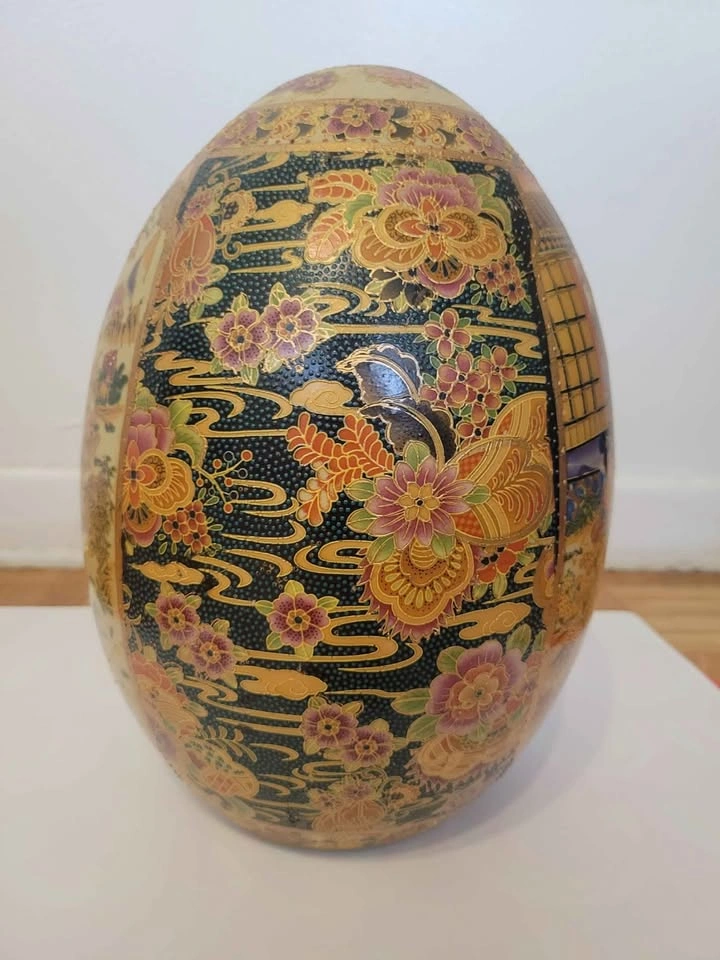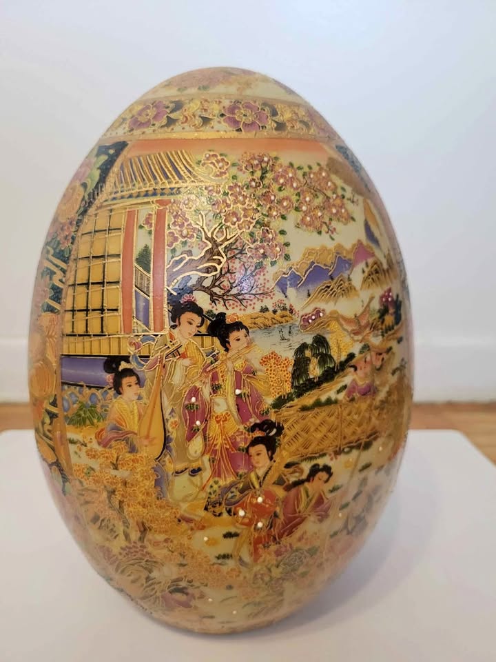 Satsuma ware type of Japanese Pottery. It's a hand-painted porcelain egg featuring a scenic motif with geisha figures in traditional settings with gilded details and raised patterns. About 10 inches tall.