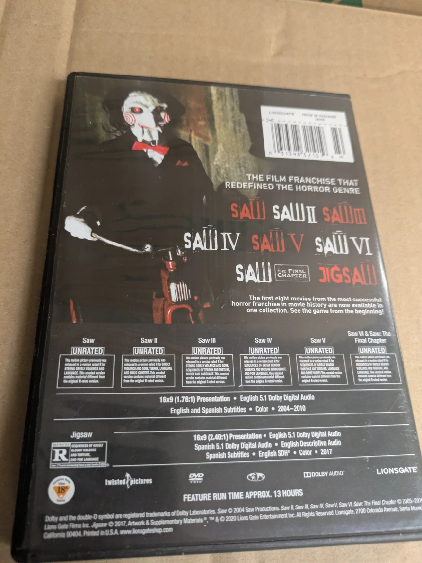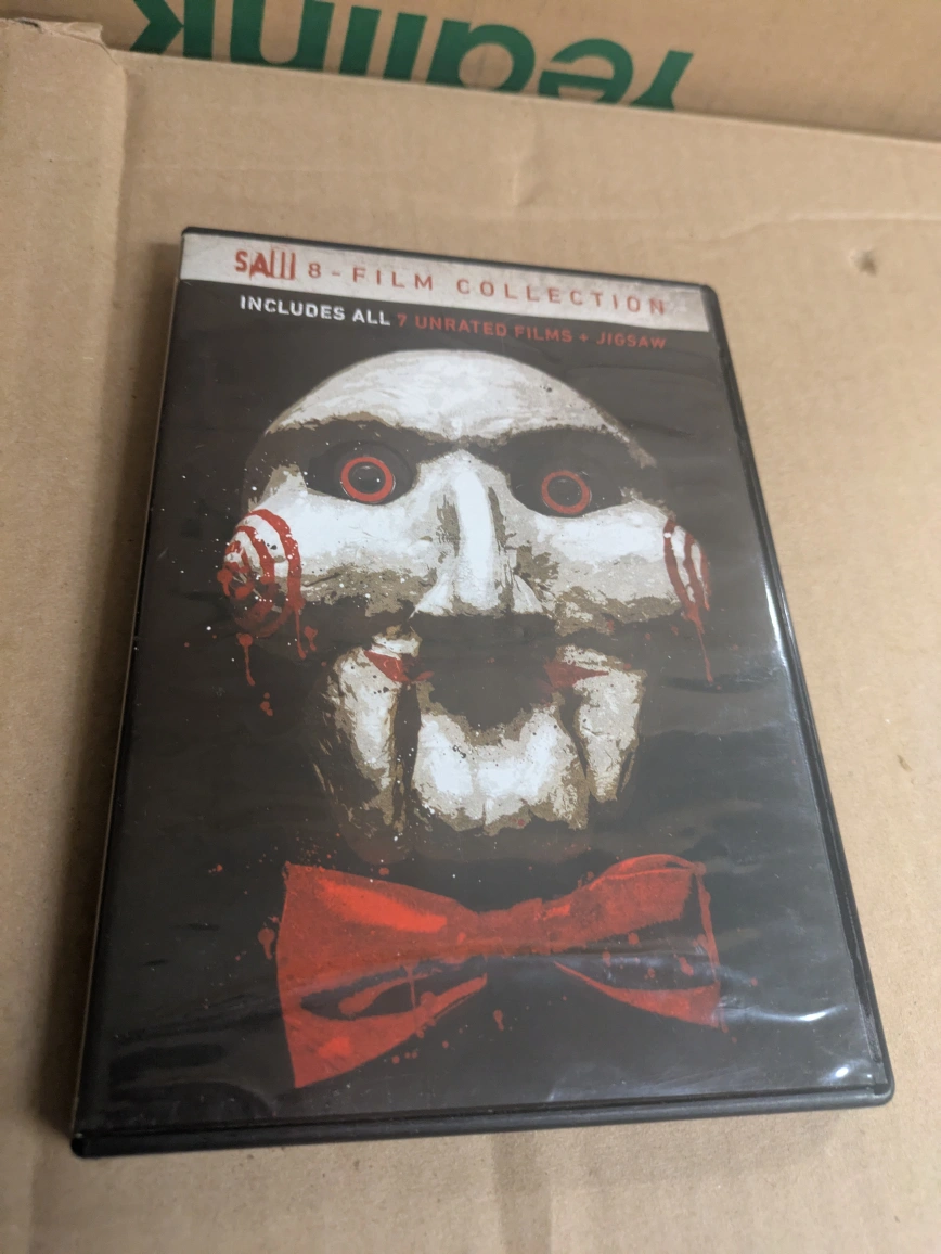 Selling a SAW 8-Film Collection DVD set. It includes all 7 unrated films plus Jigsaw. The franchise that redefined the horror genre! Enjoy all the films from the beginning