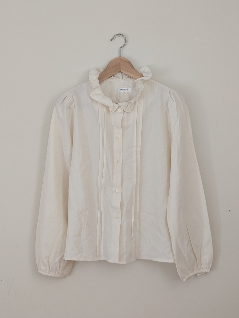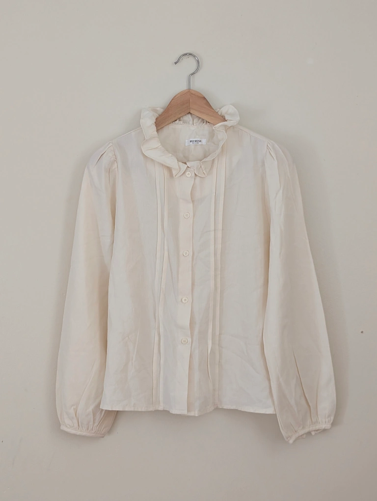 This is a cream-coloured long sleeve blouse from Refresh. It features a charming ruffle collar and button-down front. Perfect for adding a touch of elegance to your wardrobe!