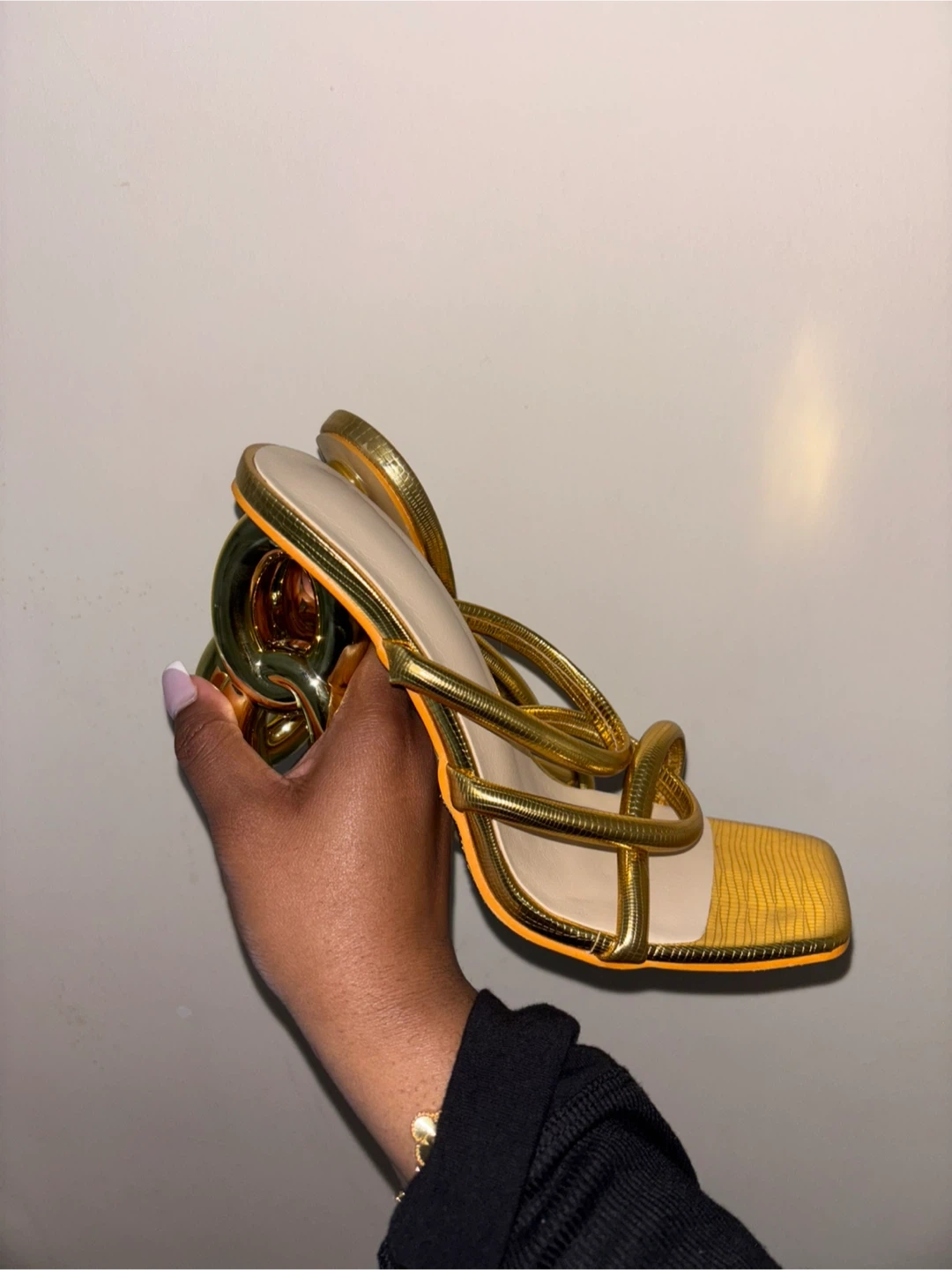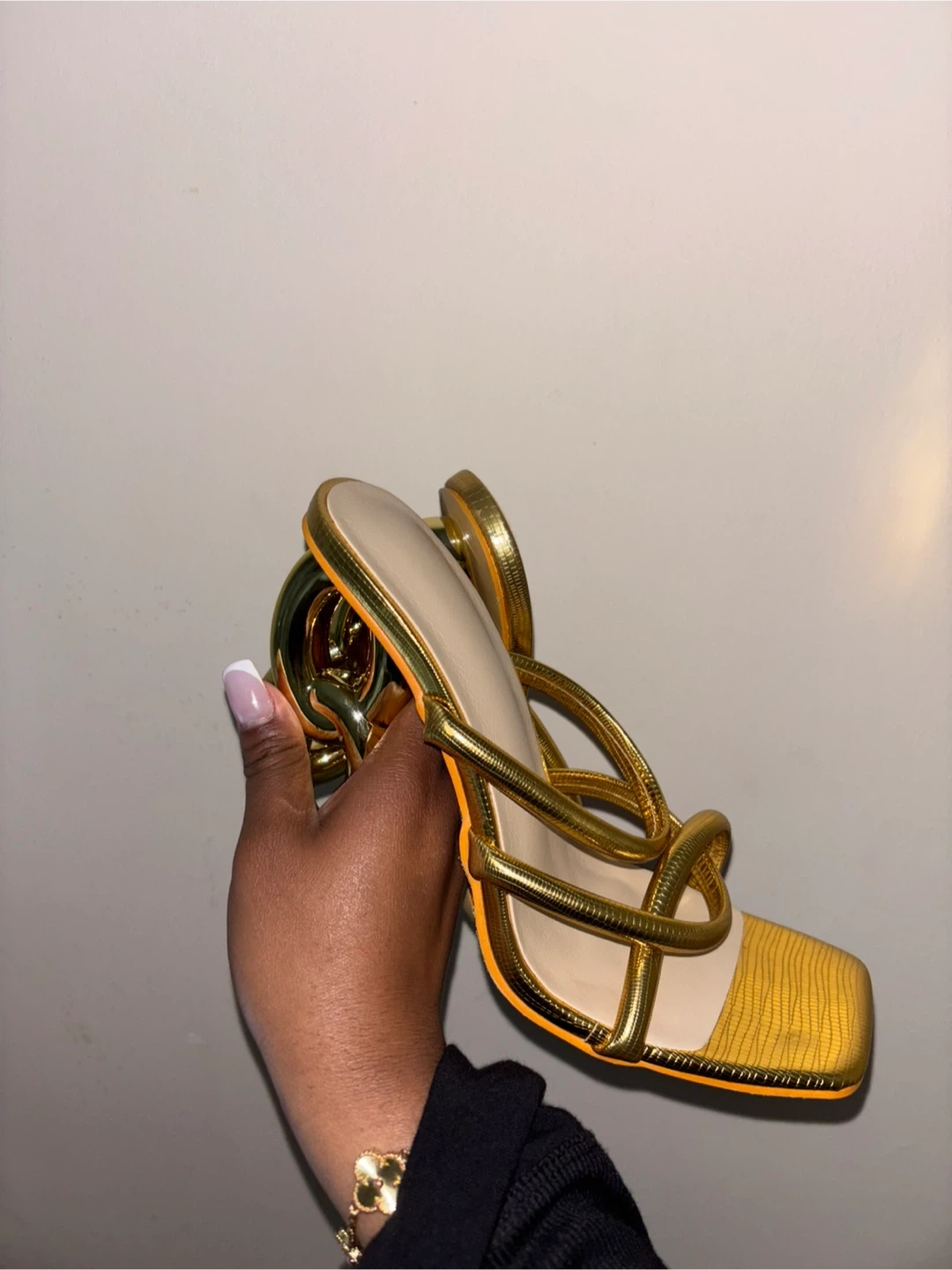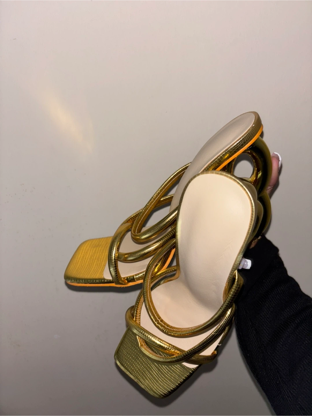 These gold strappy heels are super unique! They have a fun, modern design with a chunky heel. They're a women's size 7 and would be perfect for a night out or a special occasion.