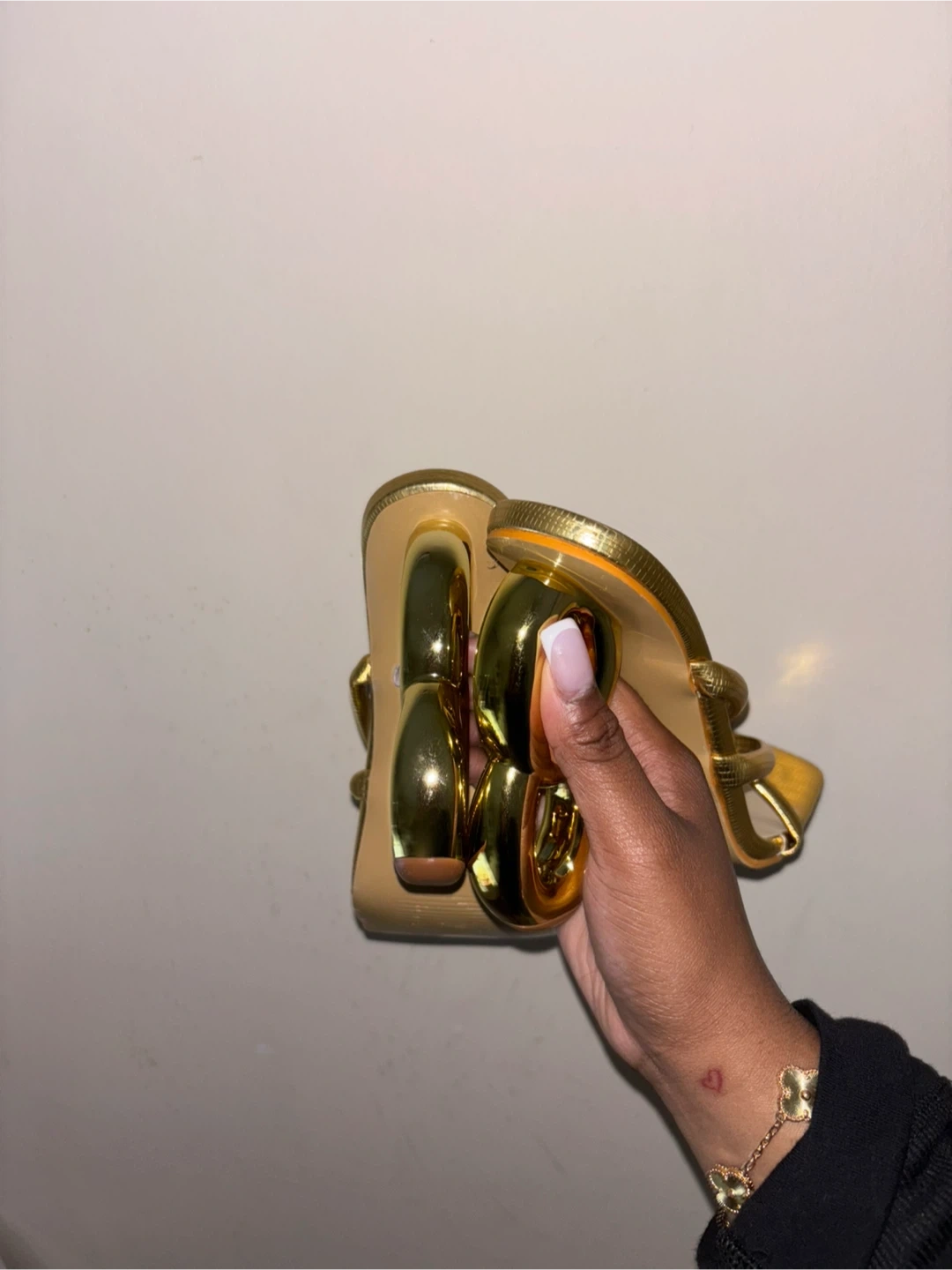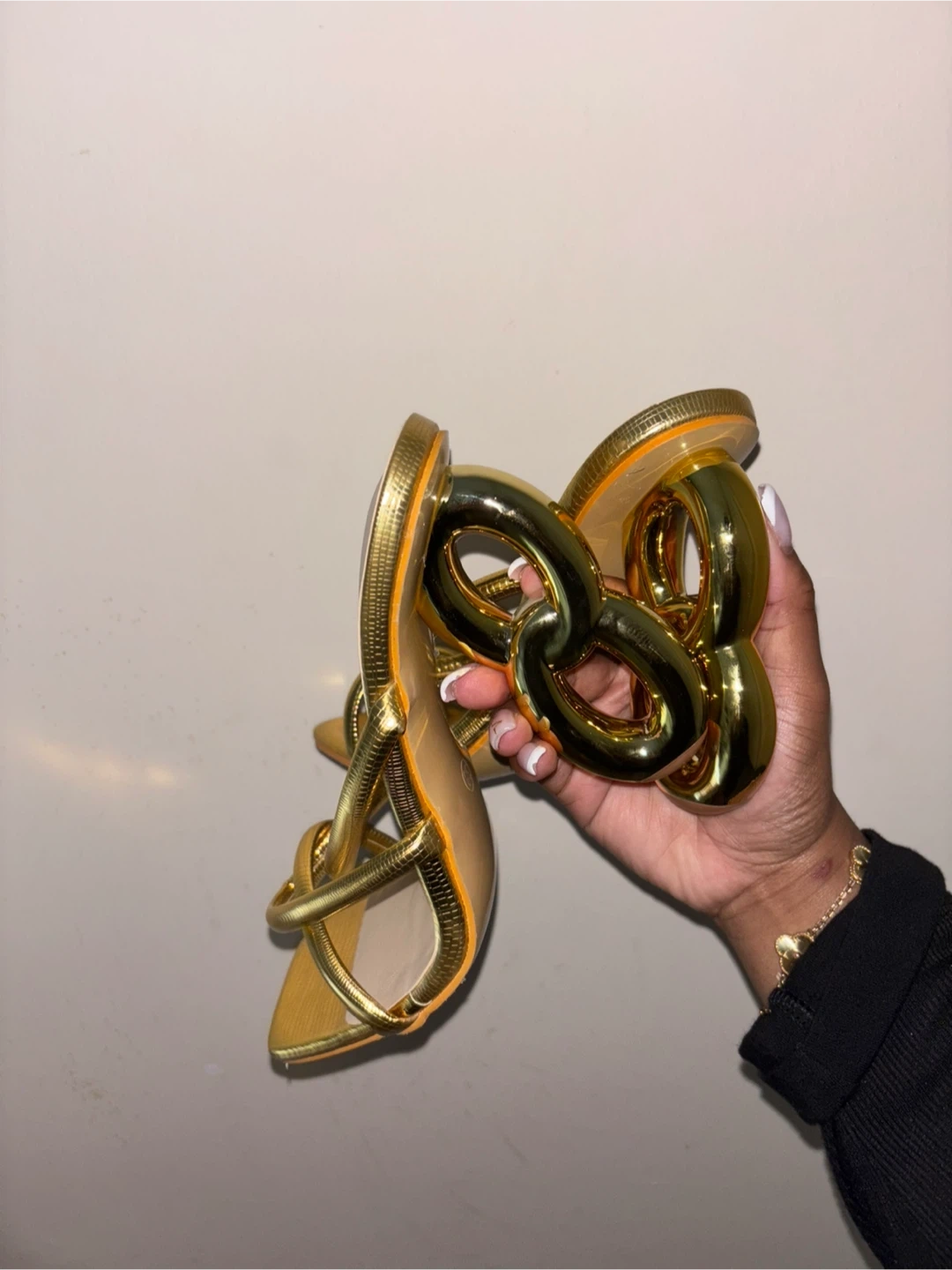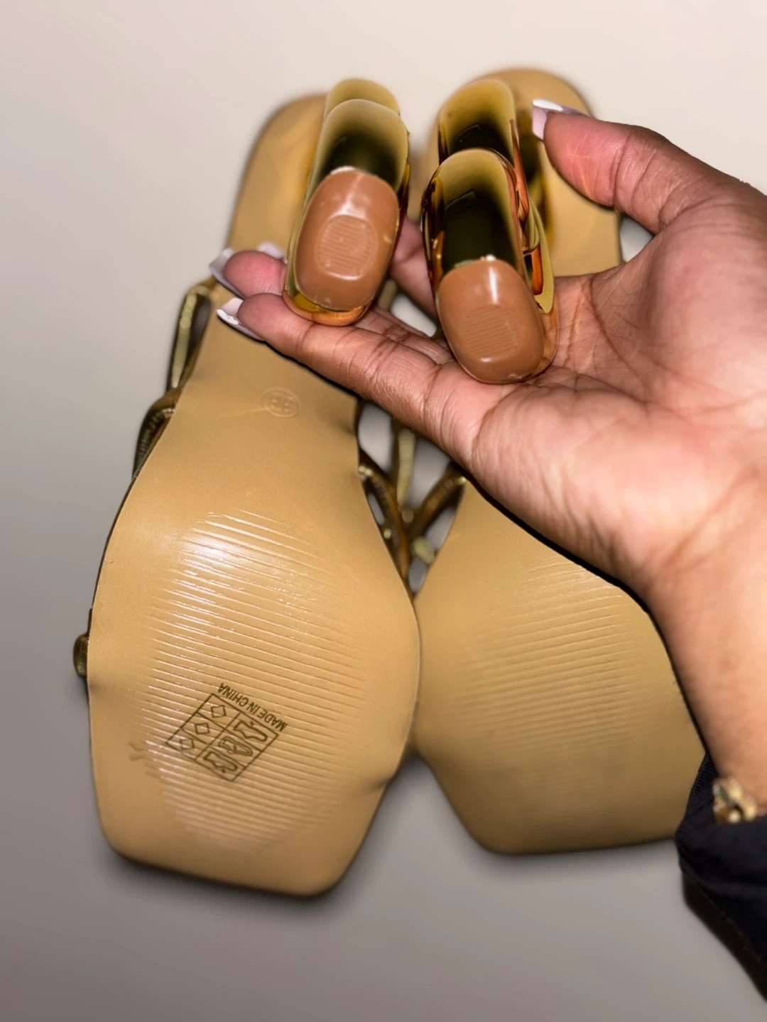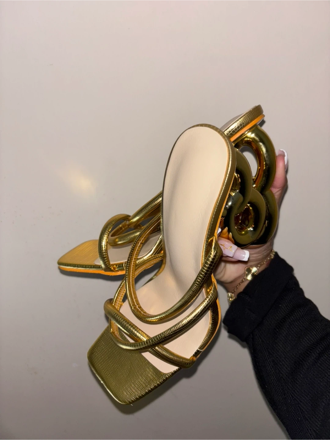 These gold strappy heels are super unique! They have a fun, modern design with a chunky heel. They're a women's size 7 and would be perfect for a night out or a special occasion.
