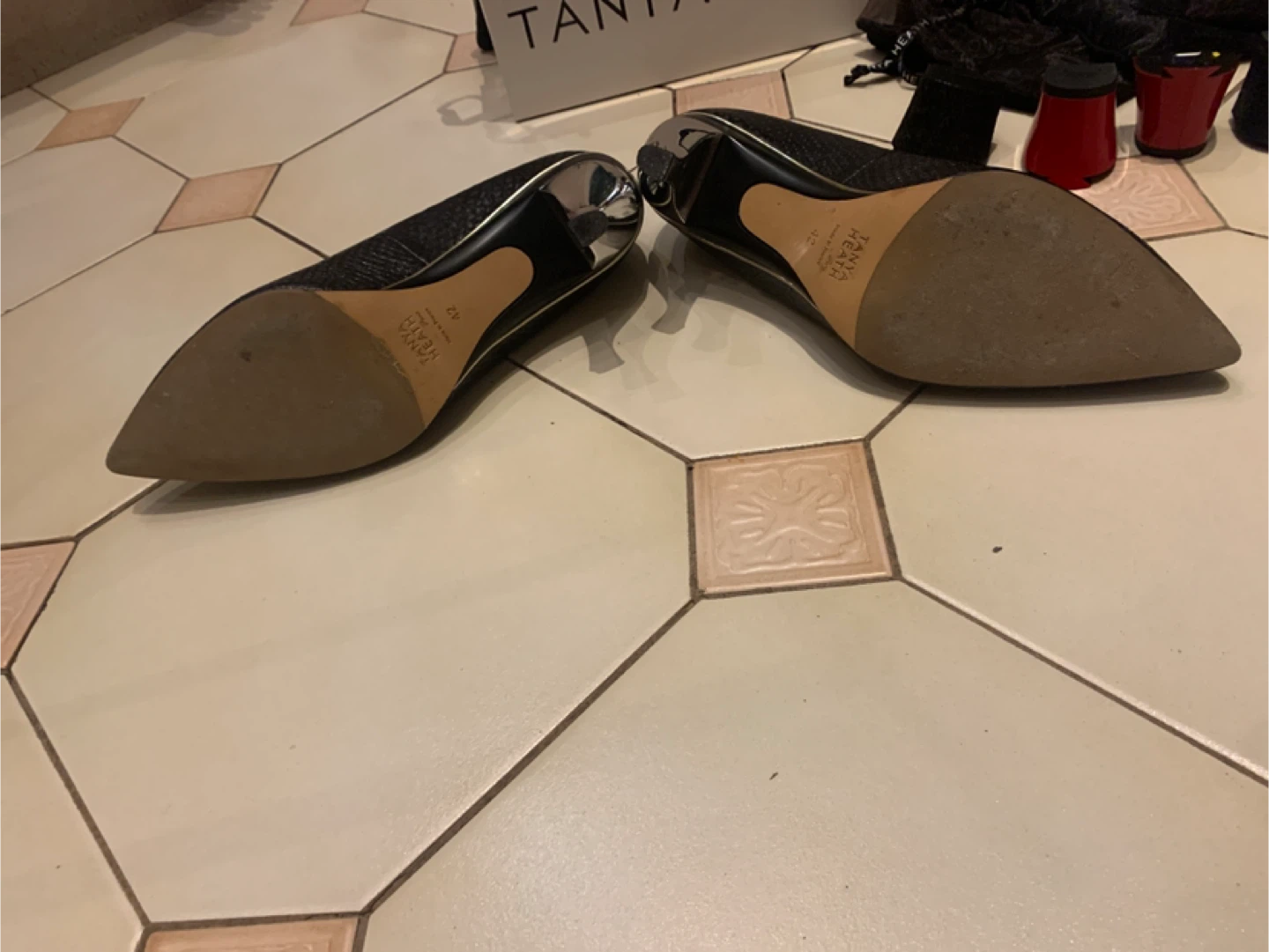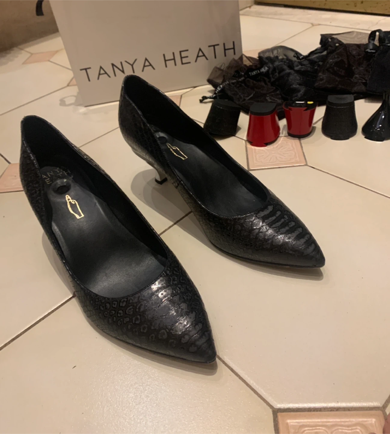 Selling a pair of Tanya Heath black leather heels. These come with a variety of interchangeable heel styles and heights, so you can customize them to suit any occasion! Includes the original box and dust bags for the heels. They're in great condition and ready for a new home