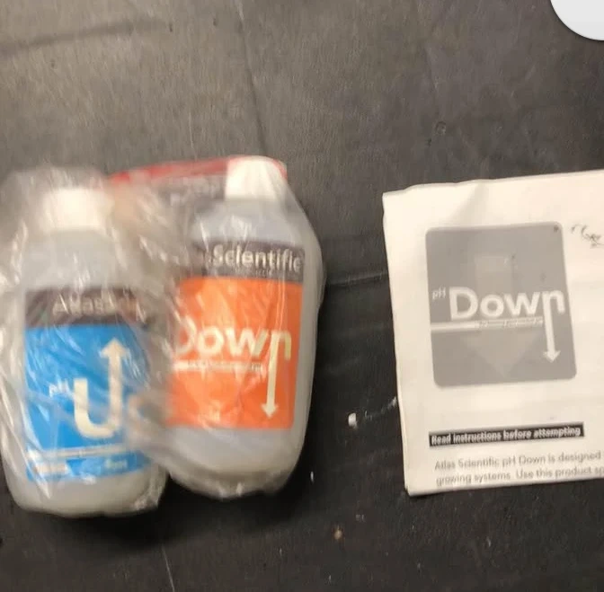This is a two-bottle pack of Atlas Scientific pH Down solution. The bottles are clear plastic and appear to be a standard size for lab solutions. Instructions are included.
