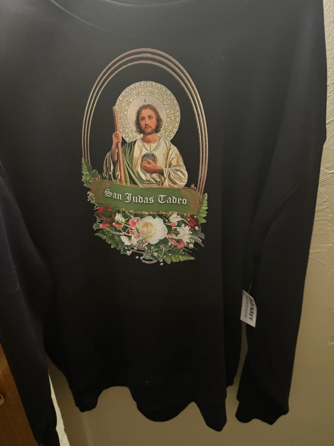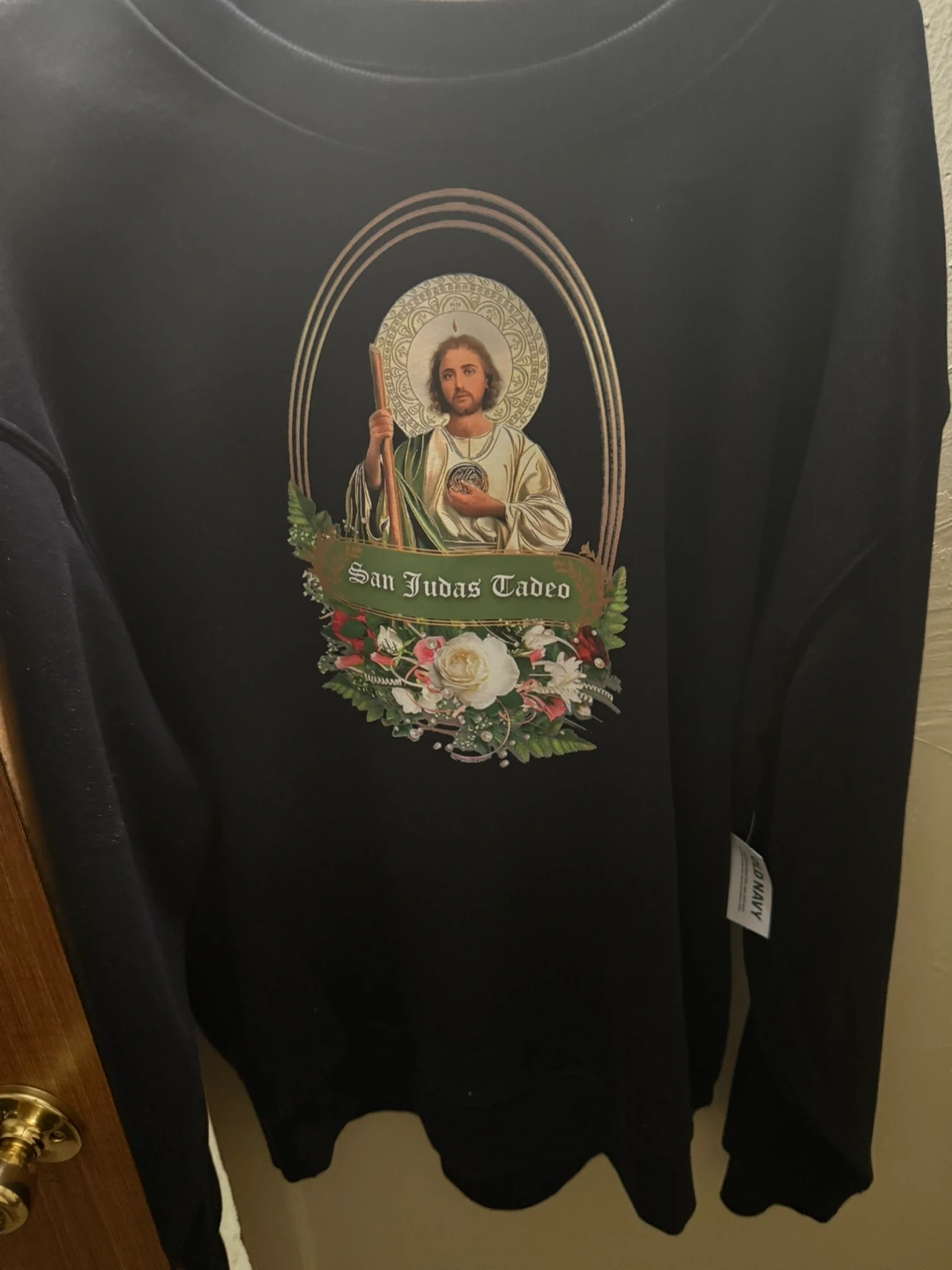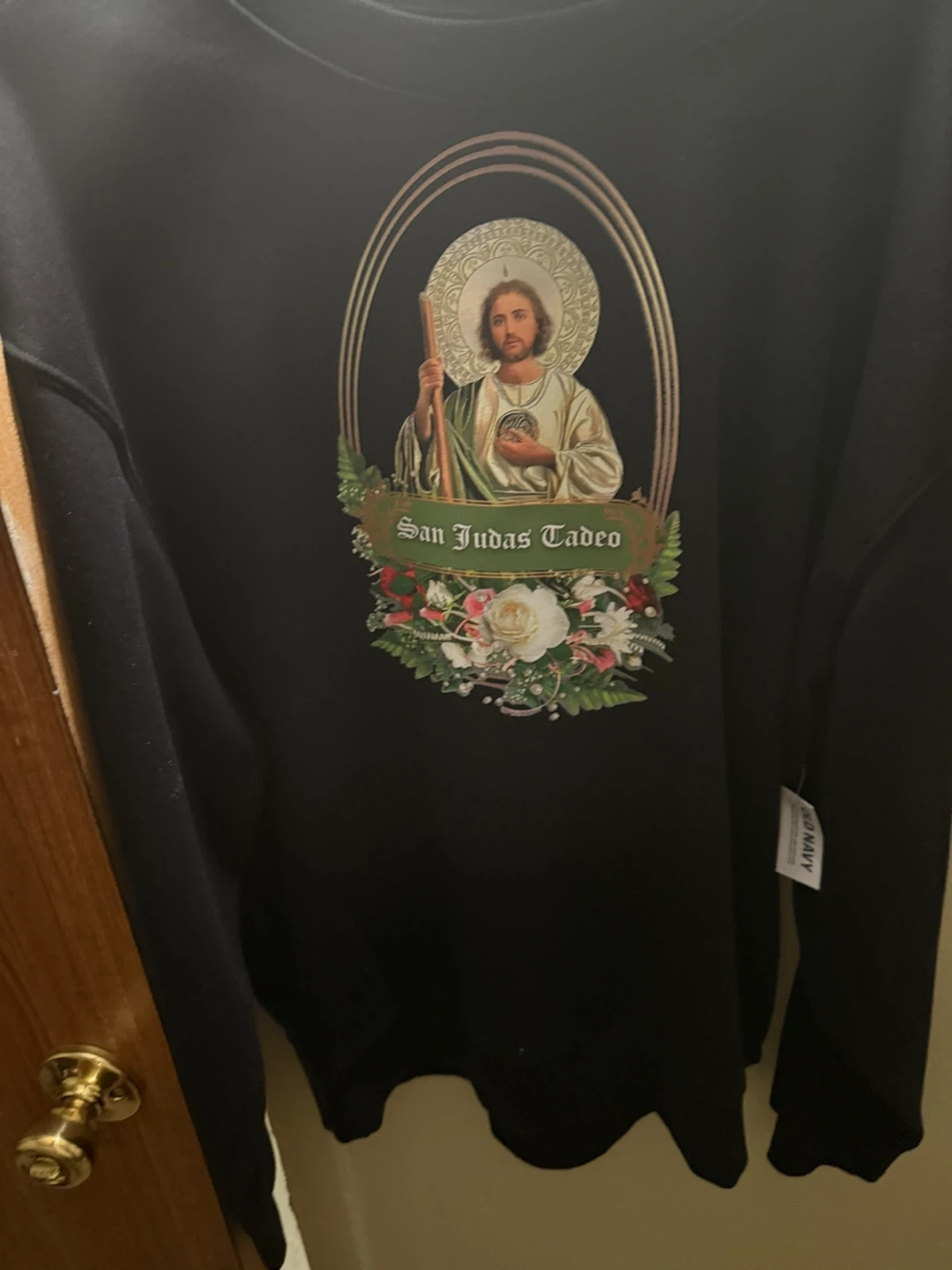 Here's a black sweatshirt from Old Navy featuring a San Judas Tadeo graphic. It's in great condition!