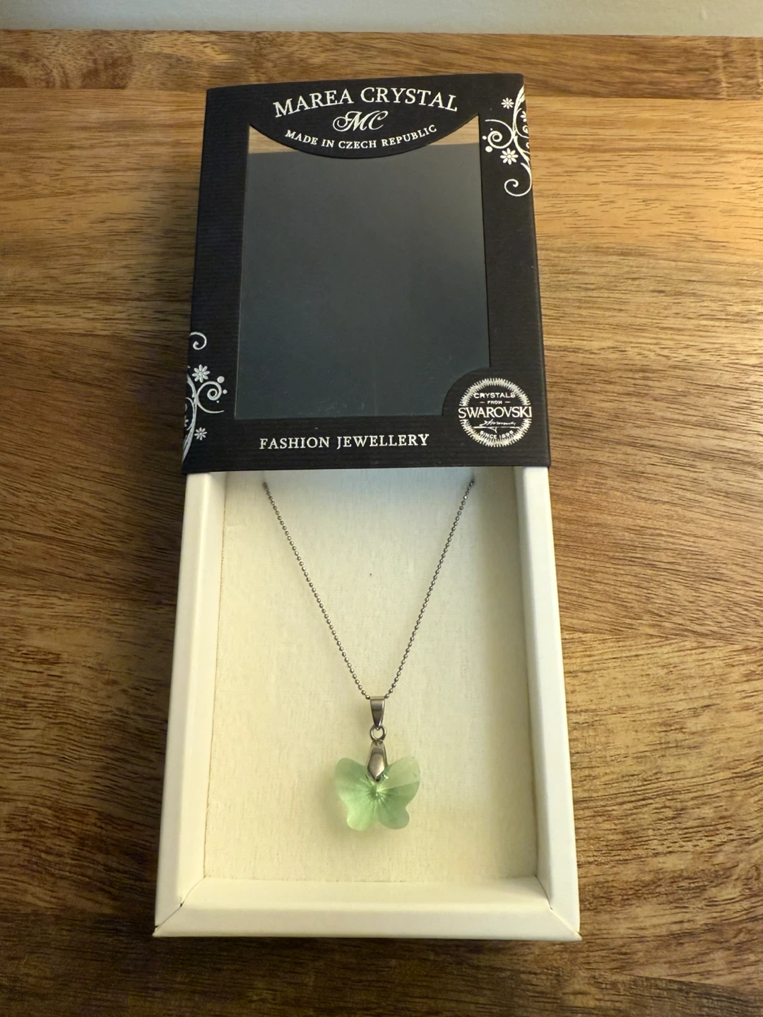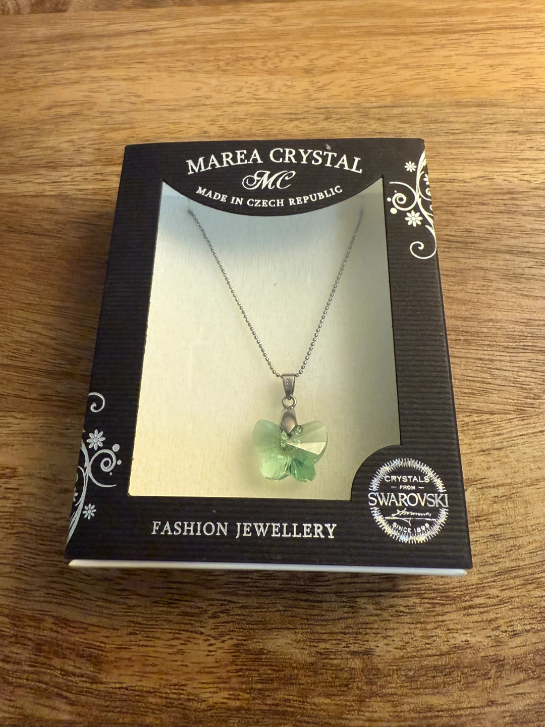Selling a Marea Crystal fashion jewelry necklace. It's made in the Czech Republic and features a butterfly pendant with crystals from Swarovski. Comes with the original box!