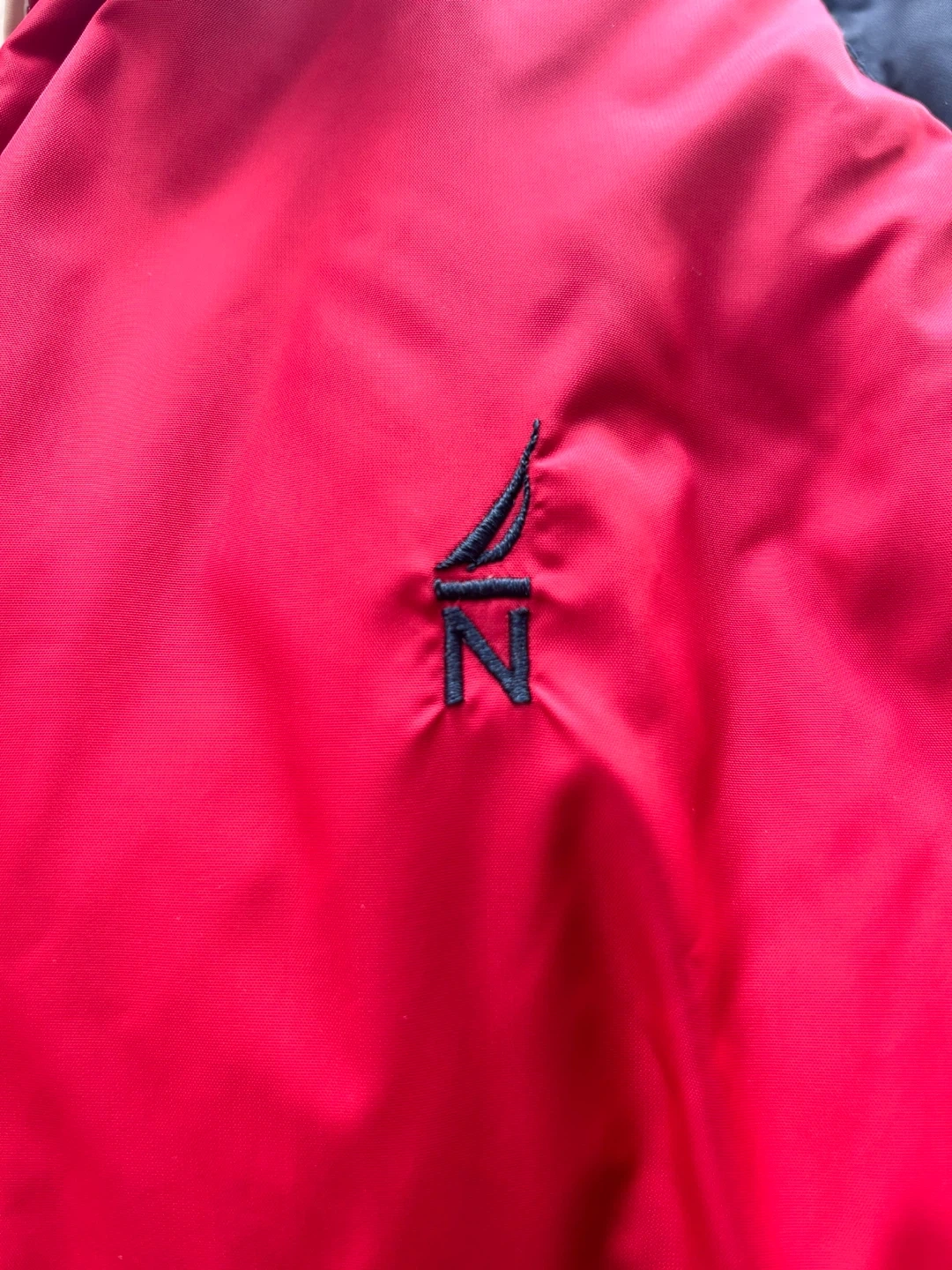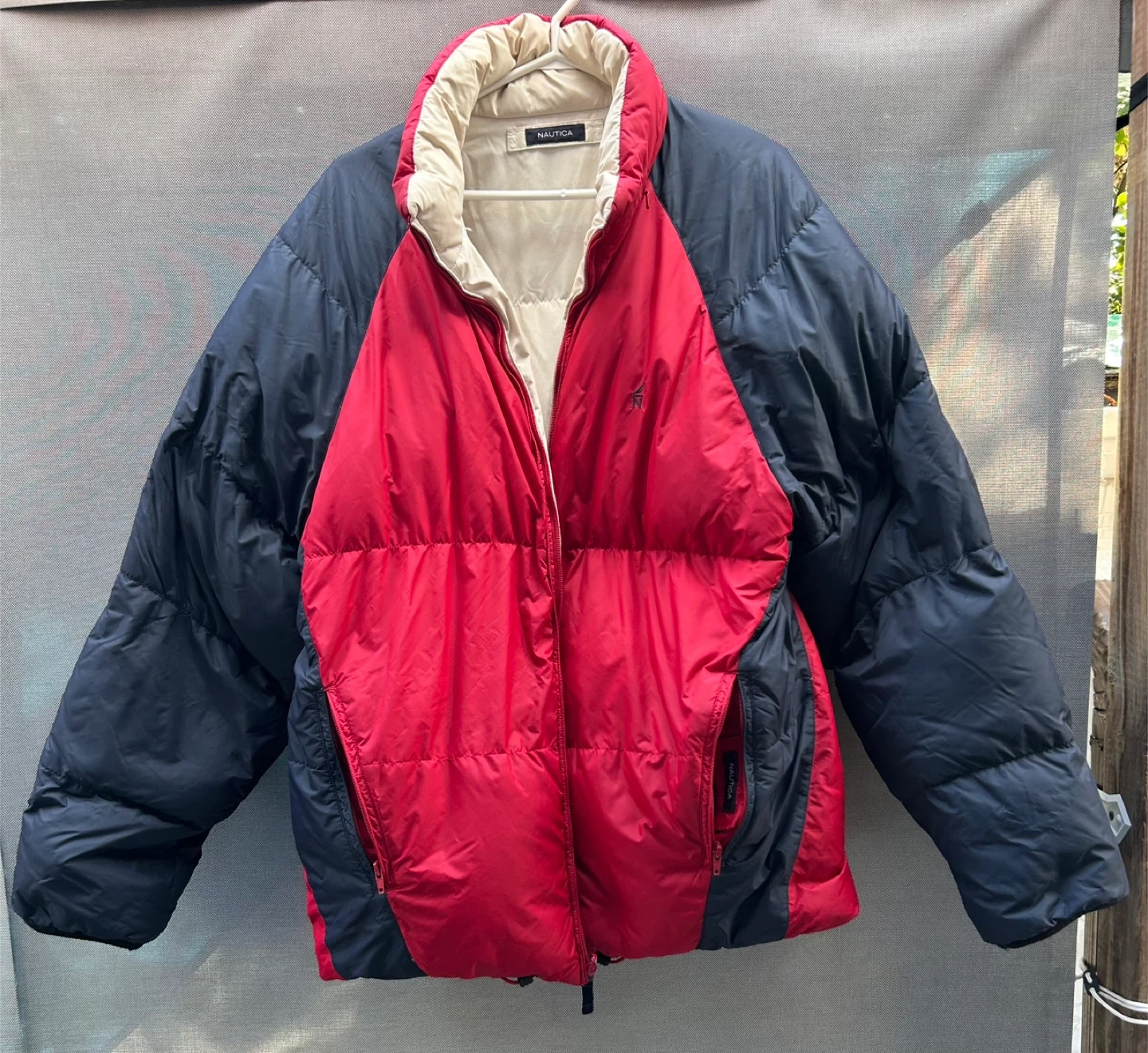 Cozy Nautica reversible puffer jacket with packable hoodie, perfect for the Canadian winter! It's an XL and features a stylish red interior. The shell is made of 100% nylon, with a filling of 70% down and 30% waterfowl feathers