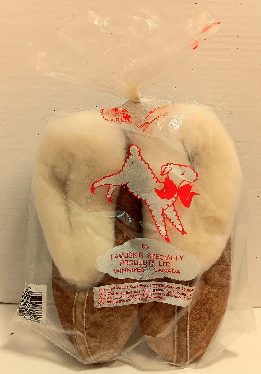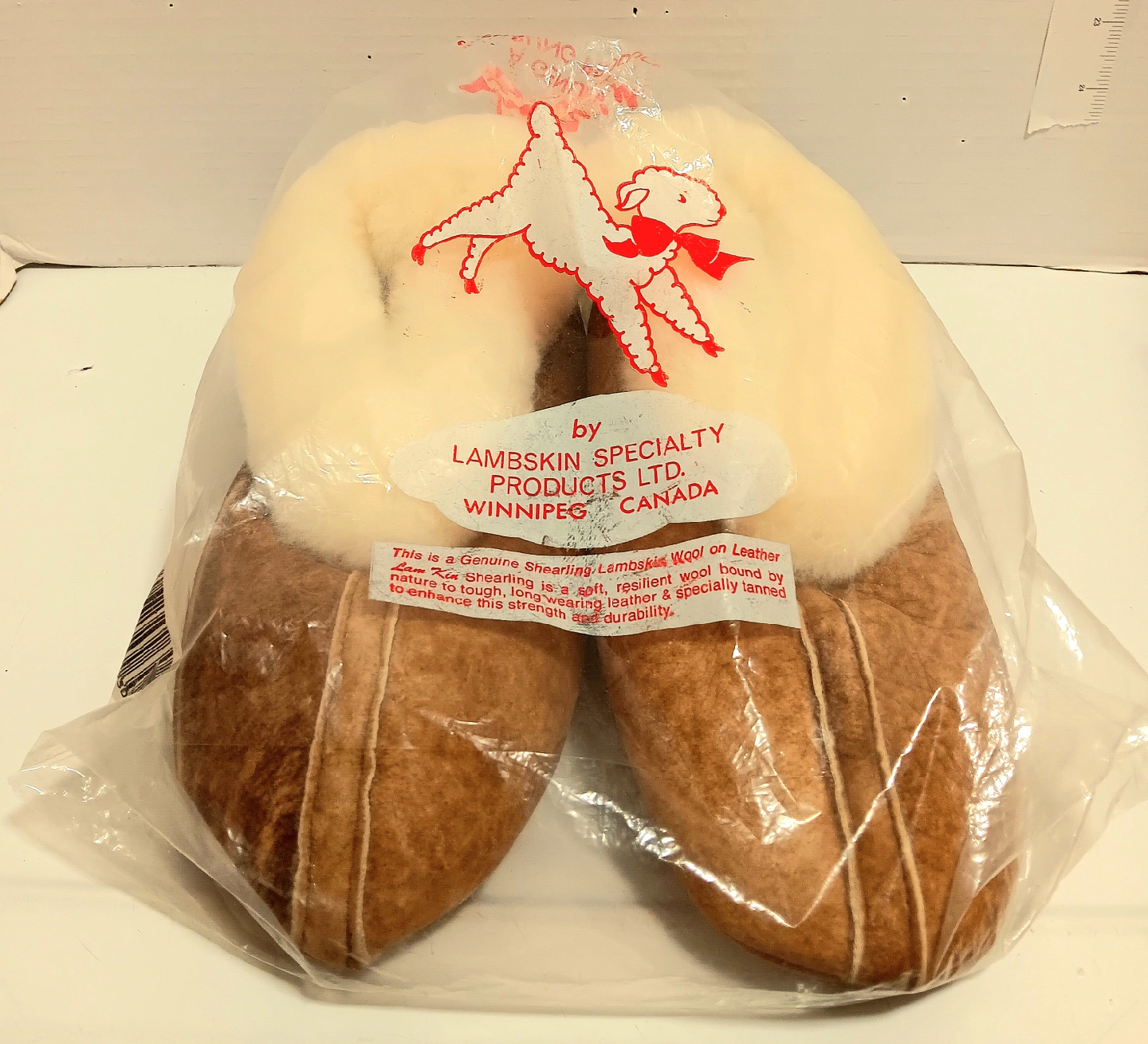 Vintage Lambskin Specialty Products Ltd. Winnipeg, Canada shearling slippers, crafted with genuine shearling lambskin wool on leather! These slippers are brand new, still in their original packaging, offering unparalleled comfort and warmth for your feet.