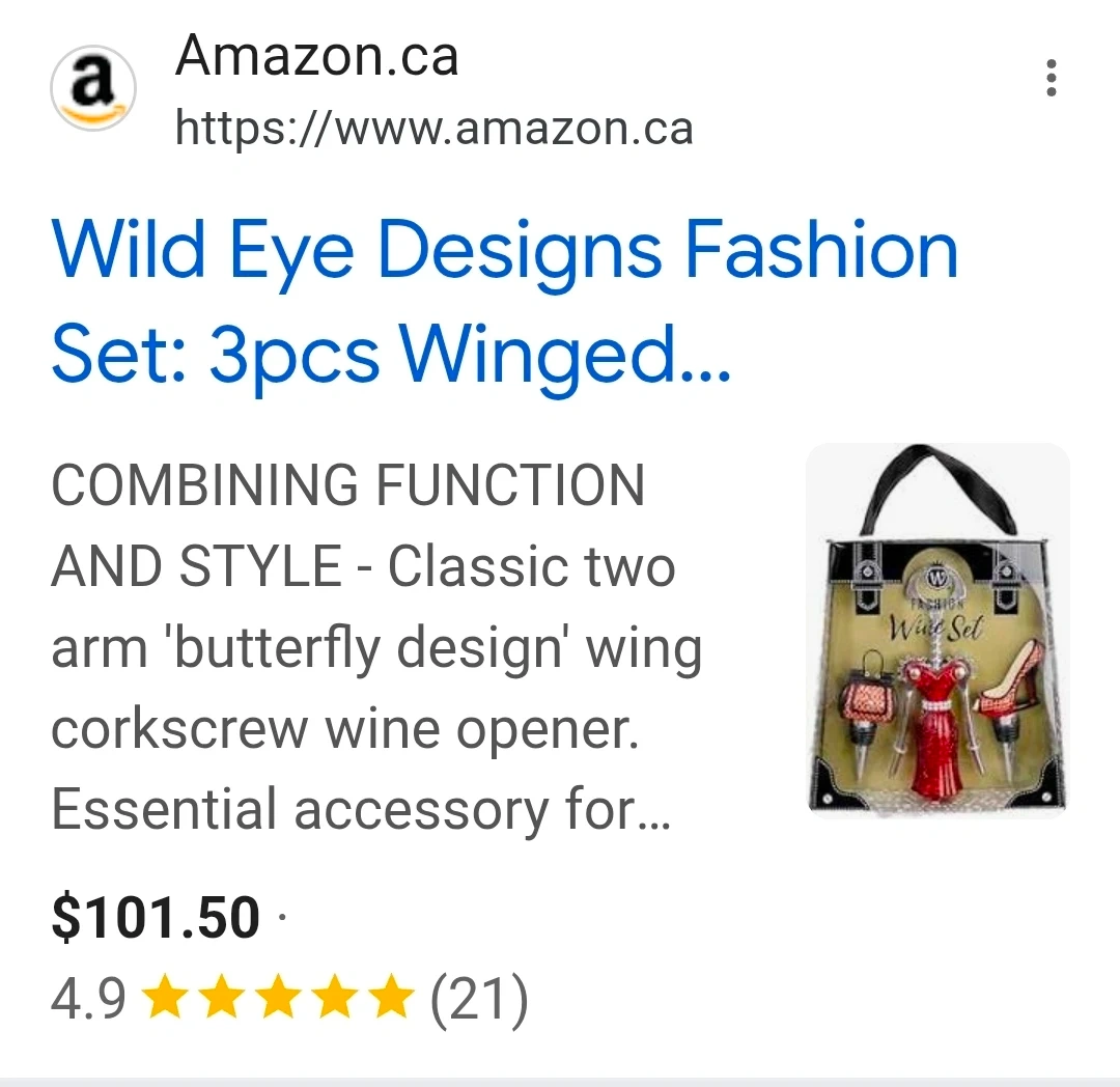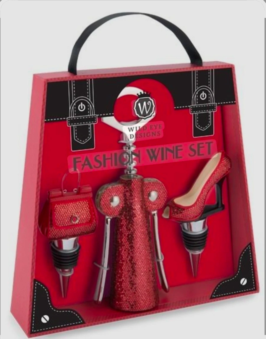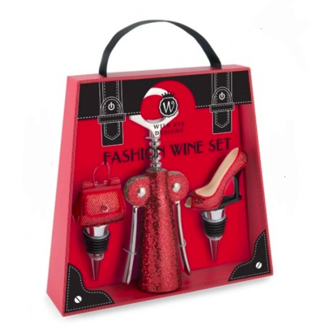 A brand new Wild Eye Designs Fashion Win Set : 3pcs Winged Corkscrew, High Heel and Purse Wine Stoppers - Red and Gold Gift Set. All with a sparkly red finish.