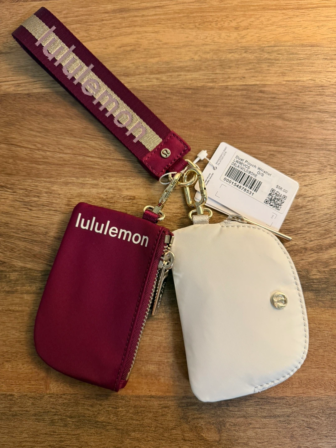 Selling a Lululemon Dual Pouch Wristlet in a DELX/Gold/Bone color. This wristlet is in O/S (One Size). Originally bought for $58