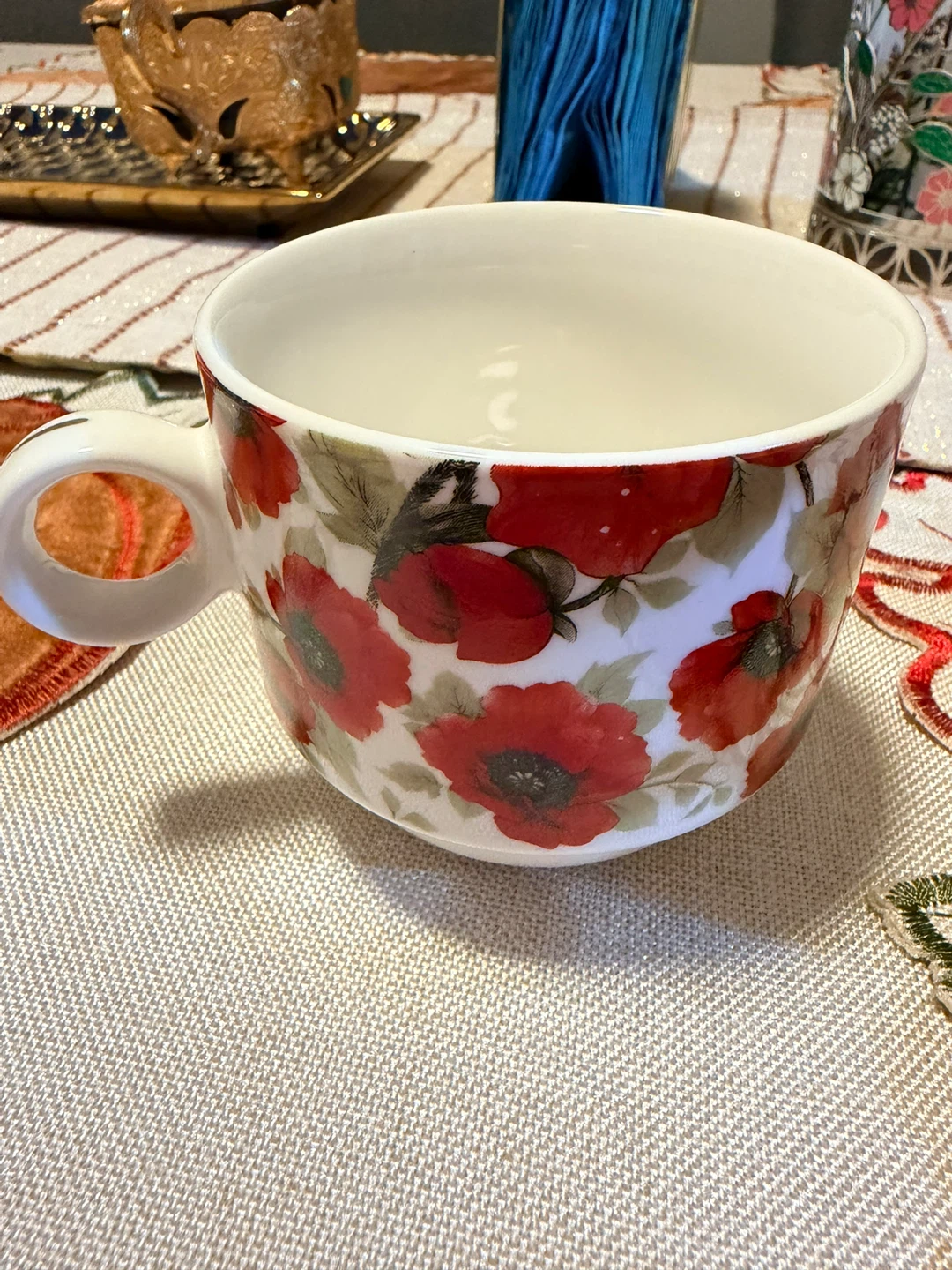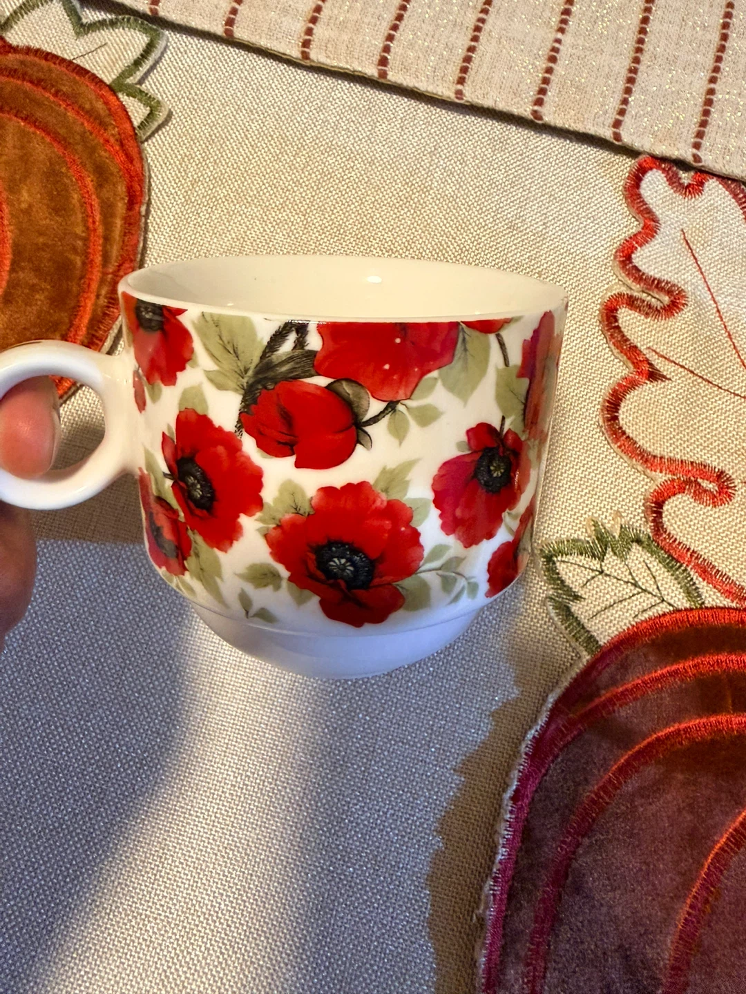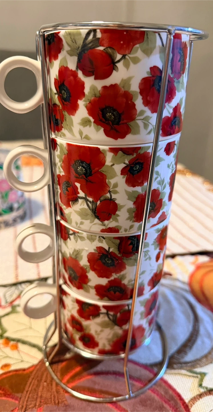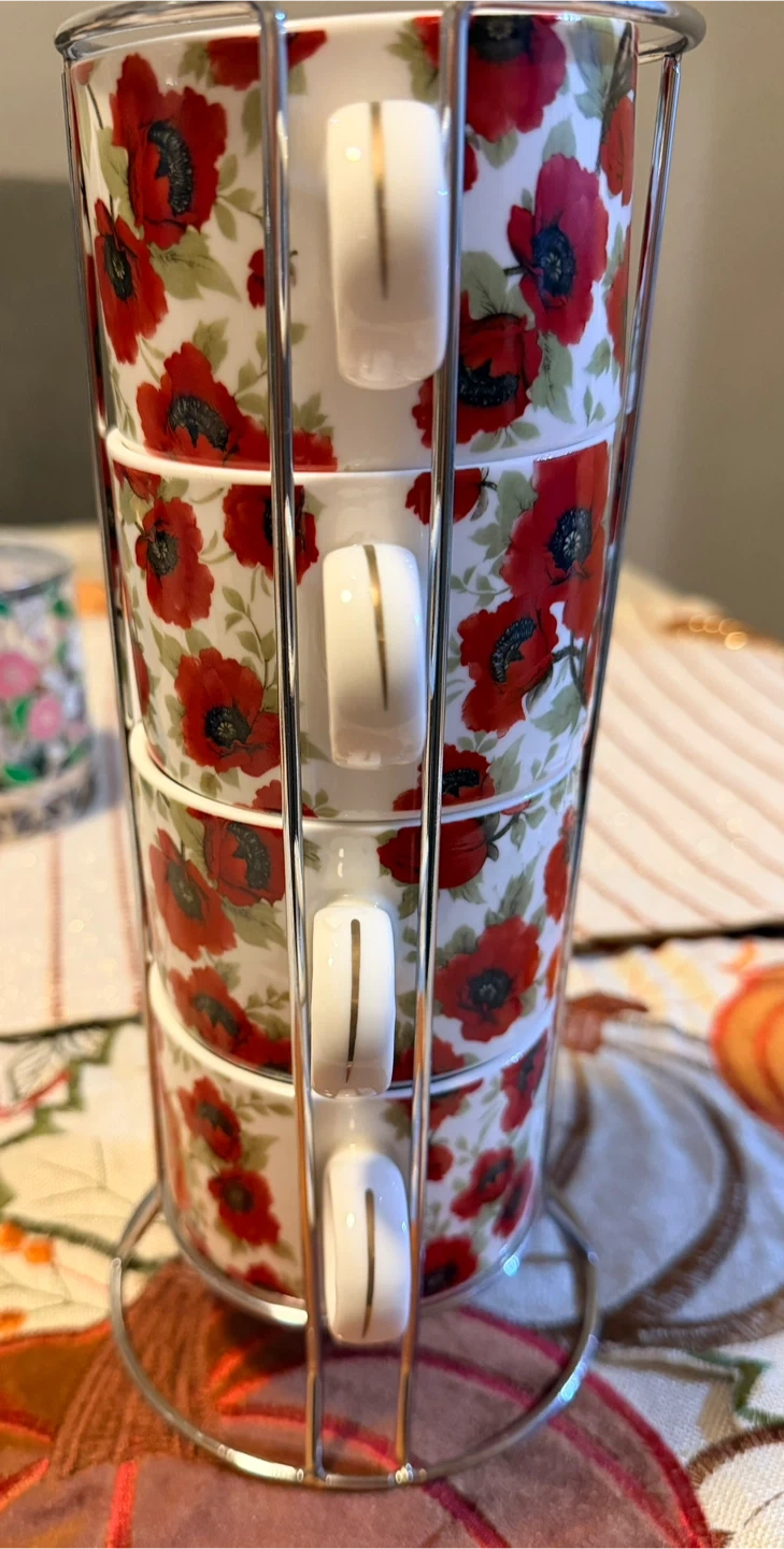 Here are some cute stacking mugs with a red floral design that come with a metal stand. They're perfect for adding a pop of color to your kitchen or enjoying a cozy cup of tea..use only one time