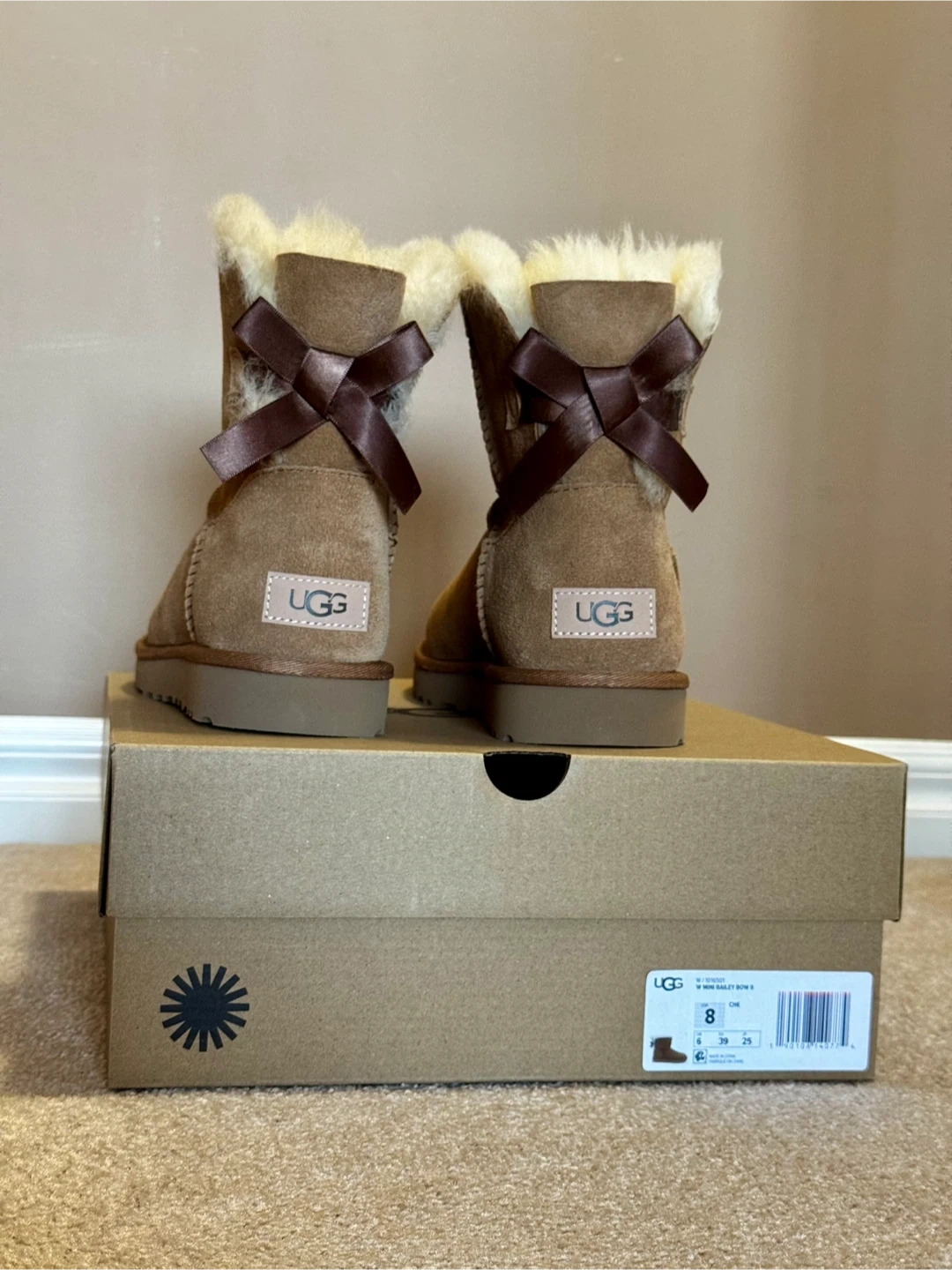 Selling a pair of UGG Bailey Bow II boots in size 8. They are in great condition and come with the original box! These cozy boots are perfect for keeping your feet warm and stylish during the colder months. The Bailey Bow II features a cute ribbon detail on the back, adding a touch of flair to the classic UGG design. PICKUP in Cranston SE. No Delivery