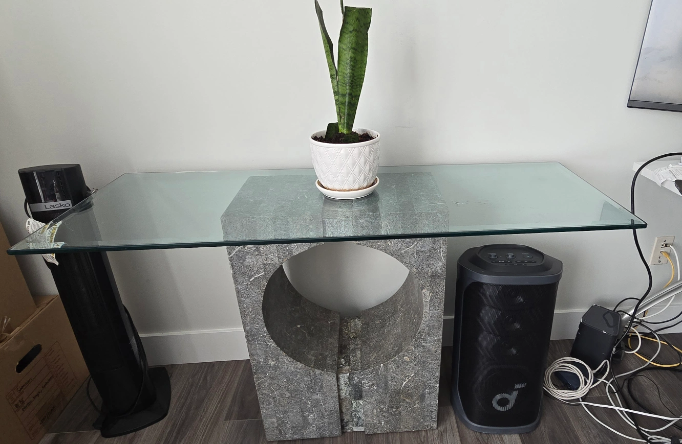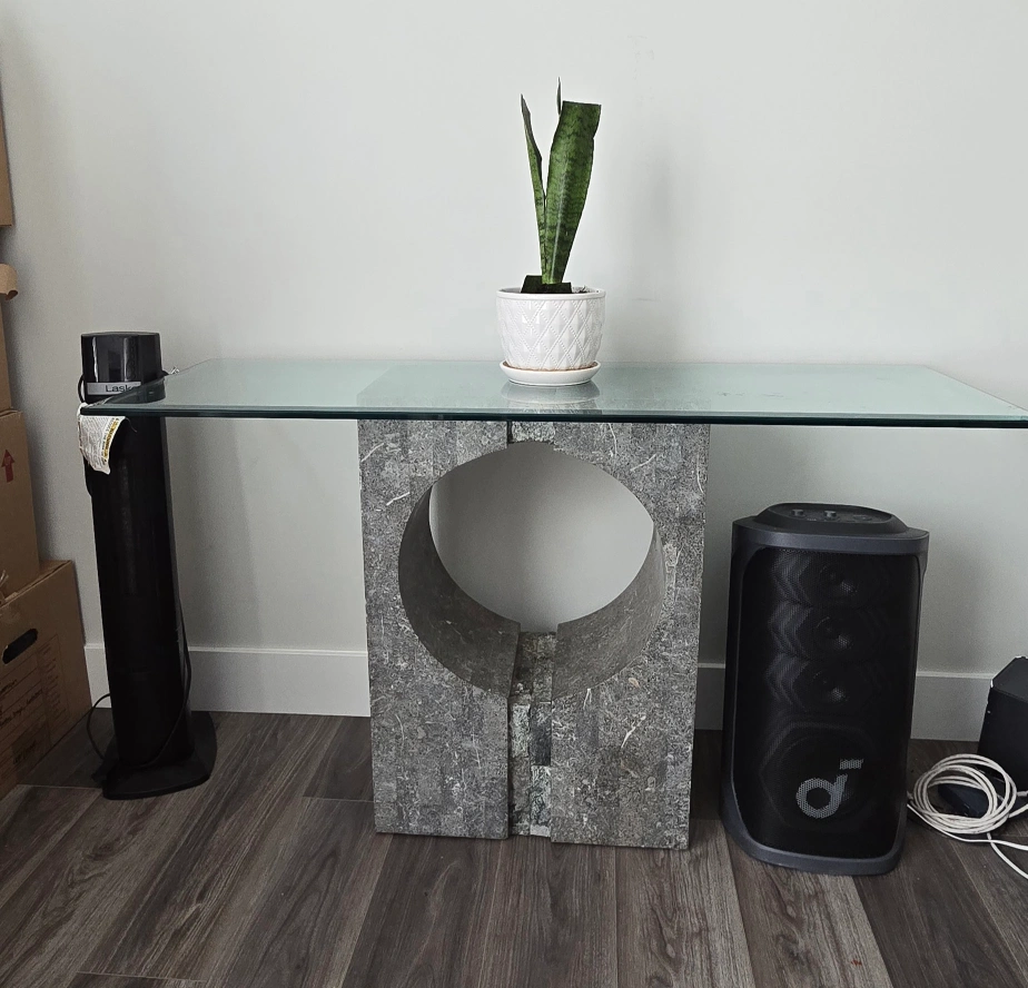 Selling a stylish console table featuring a clear glass top and a unique stone base with a circular cut-out design. This table would make a great addition to any entryway or living space. It's in great condition and ready for a new home. D-18 L-29.5 W-50